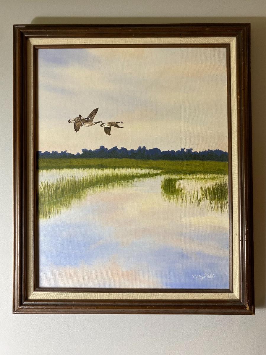 Vintage Oil On Canvas Geese Over Water Mary Hall