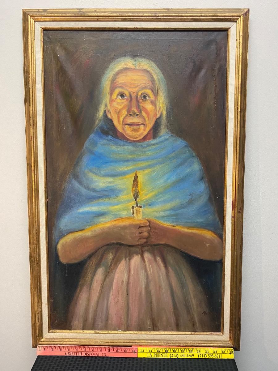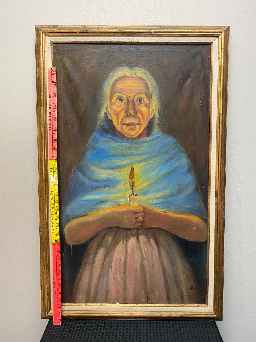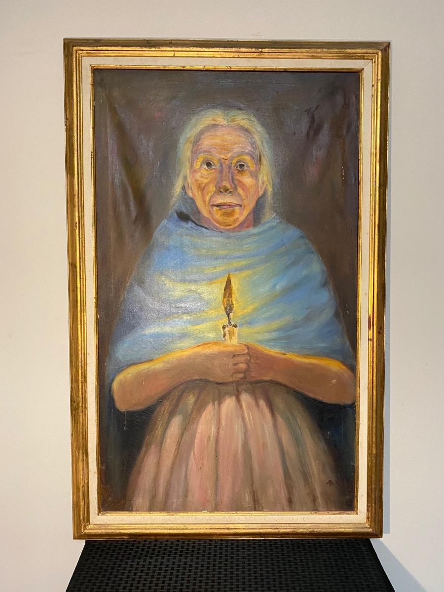 Vintage Oil Painting on Canvas White Haired Woman with Candle