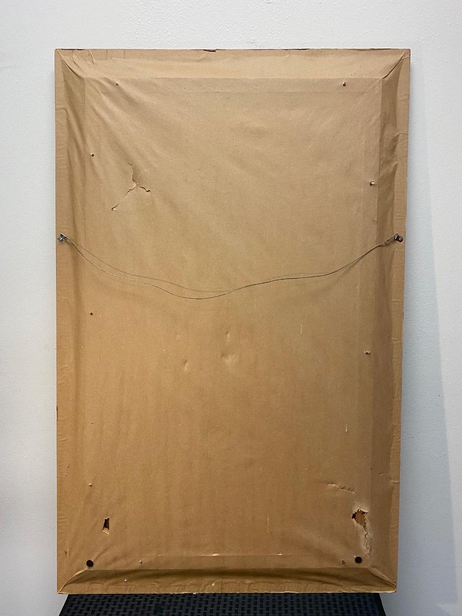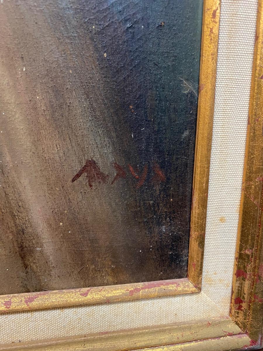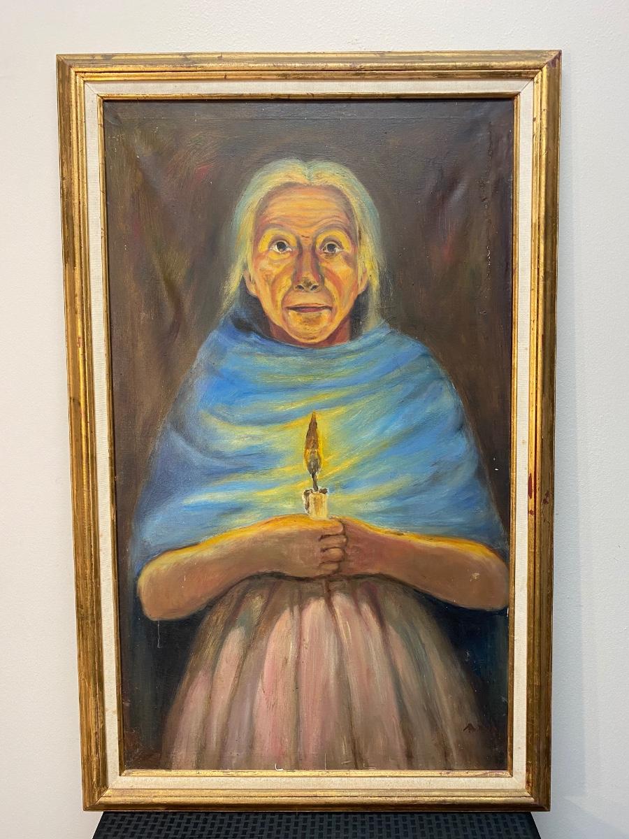 Vintage oil on canvas painting. White haired woman holding lit candle. Nicely done, the candle flame almost glows even in low light. Vintage condition, light signs of age. Large, about 40" height. Signed in lower right corner.