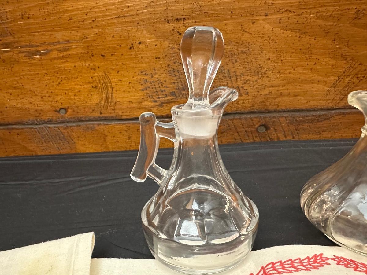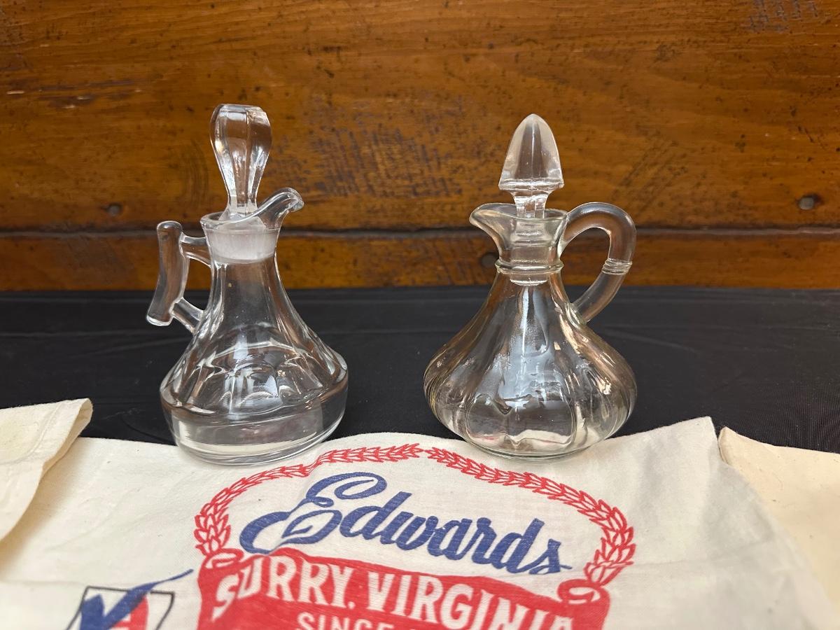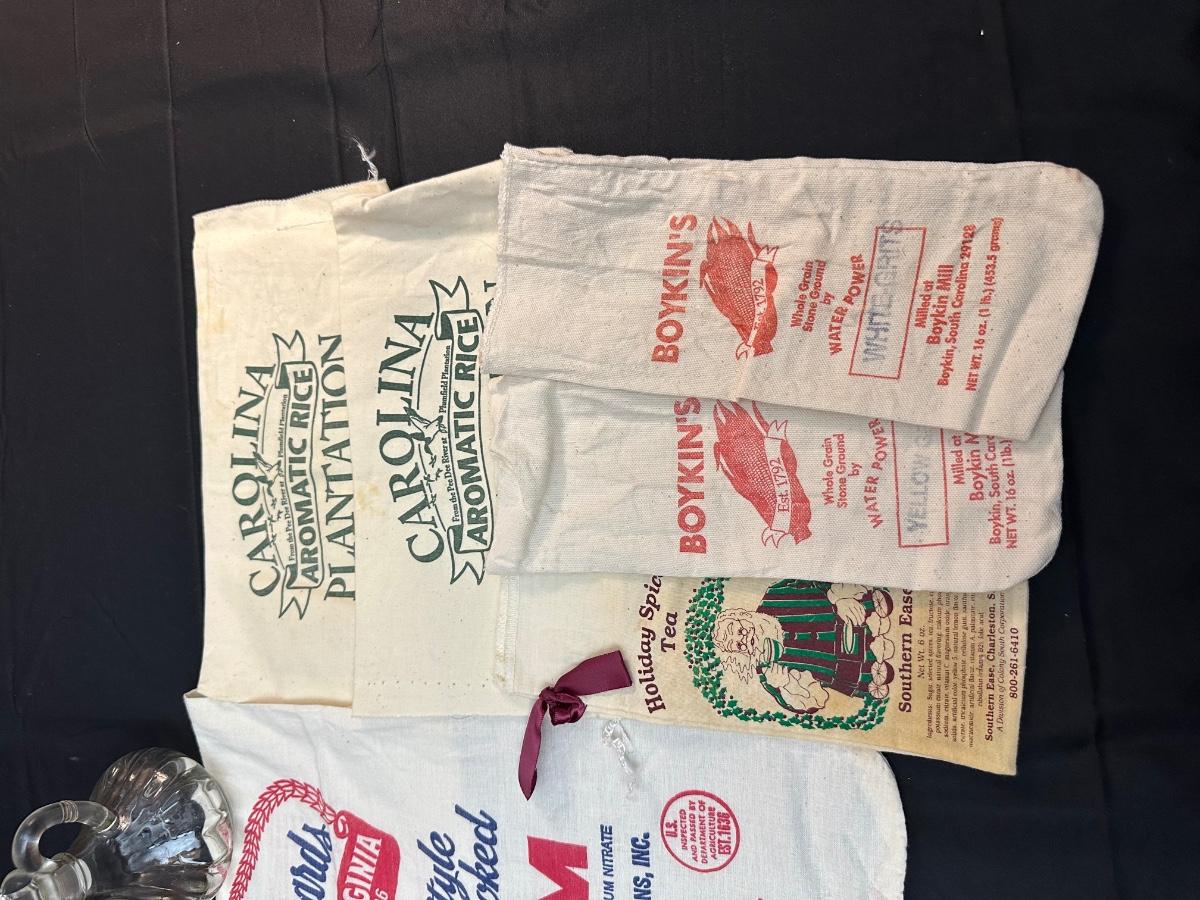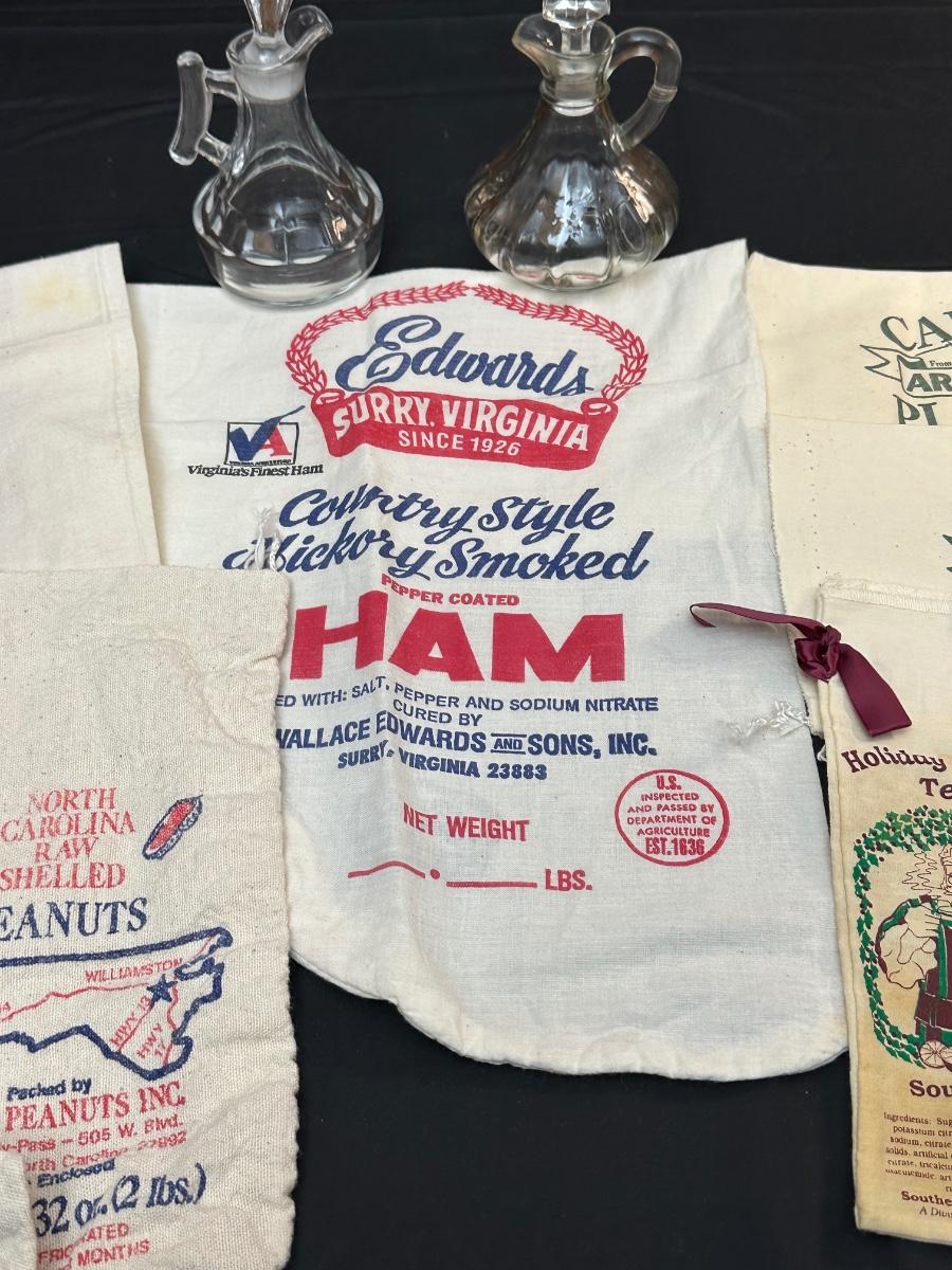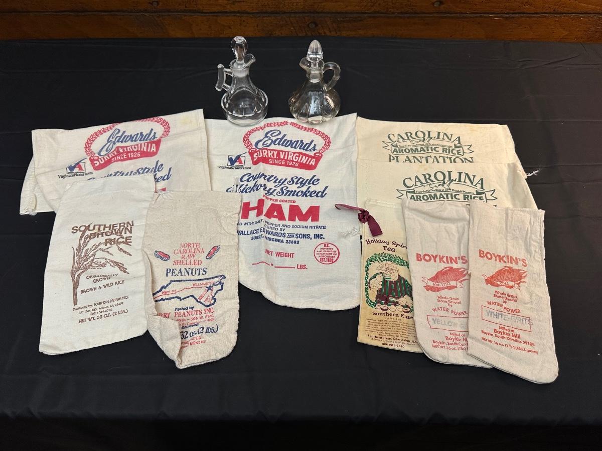 Vintage Oil & Vinegar Glass Decanters & Rice and Grits Cloth Sacks