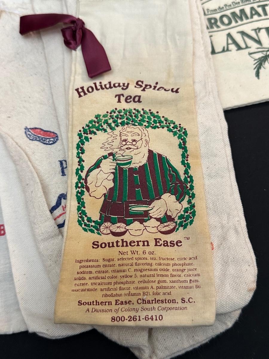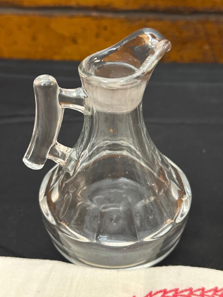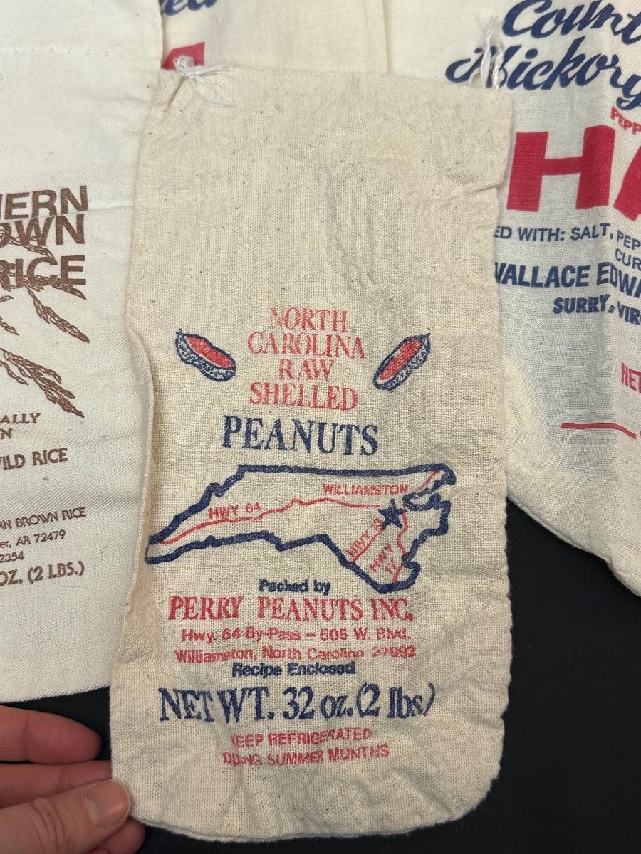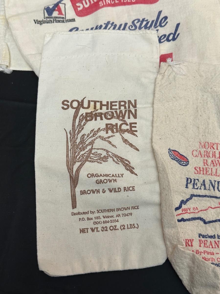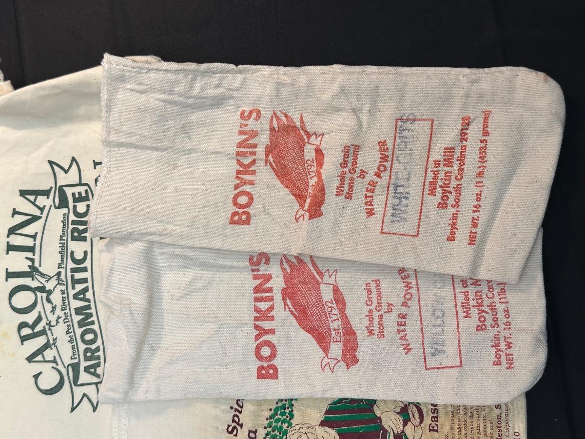 Vintage Oil & Vinegar Glass Decanters & Rice and Grits Cloth Sacks