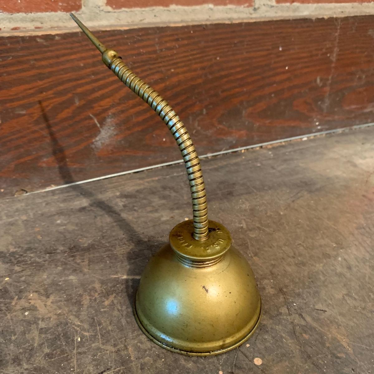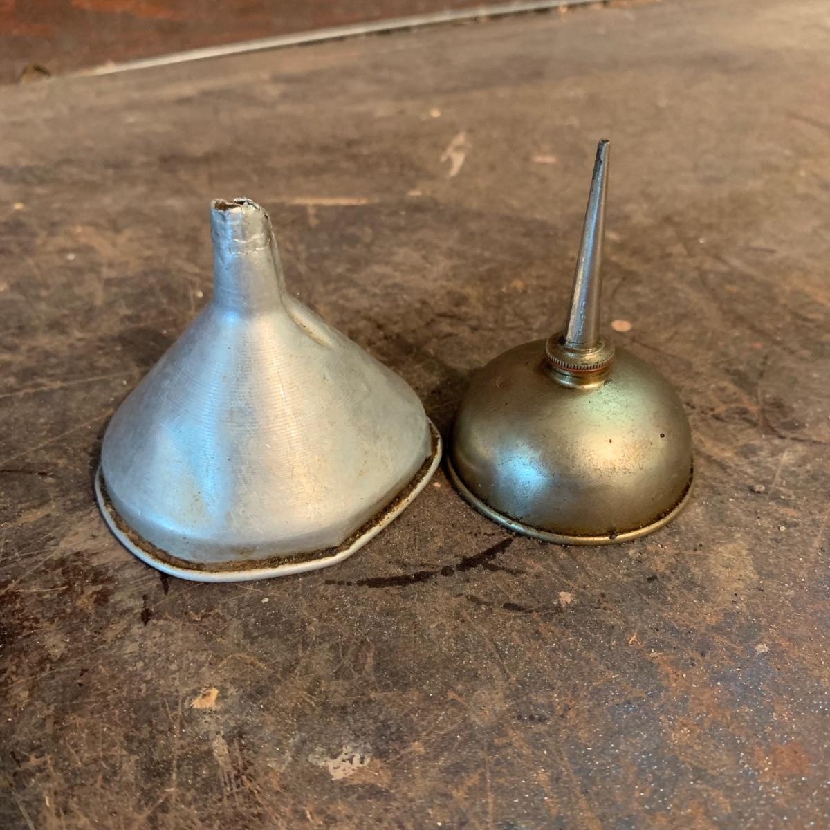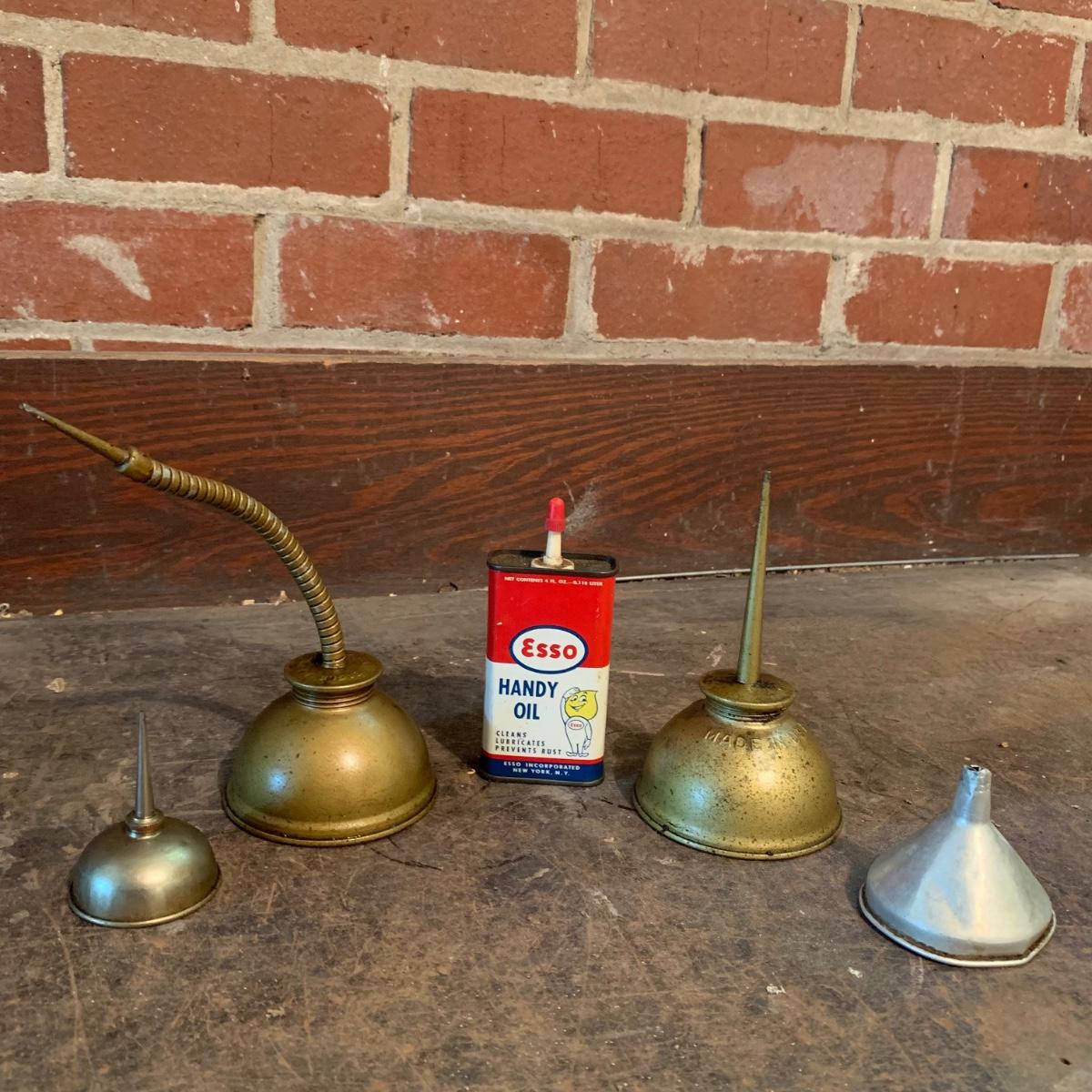 This lot contains three vintage metal oilers, a small metal funnel, and a 4 oz. can of Esso Handy Oil. There is liquid in the Esso can, but we cannot verify the contents. The largest oiler has a bendable neck. It measures approximately 3.5” in diameter and 9” tall. All items are a bit dusty and some are greasy as well from the oil. Local pick up only.