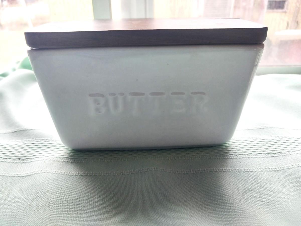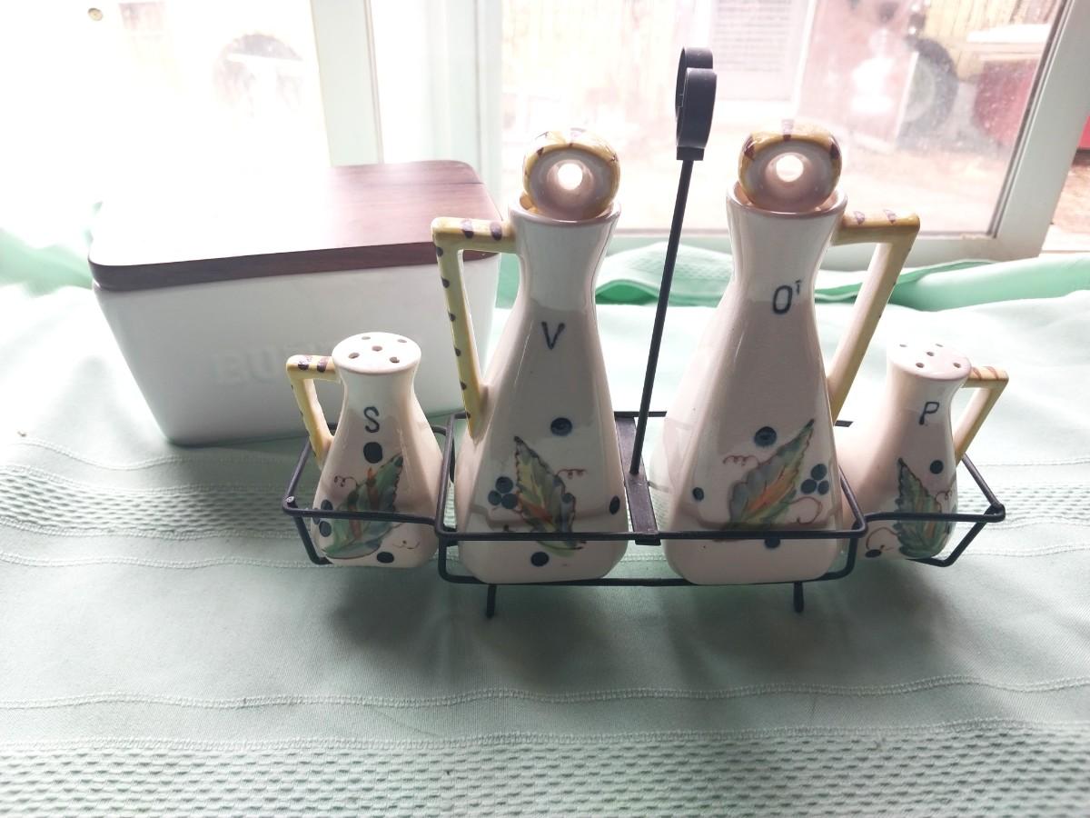 VINTAGE OIL&VINAGER/SALT&PEPPER IN HOLDER AND CERAMIC BUTTER HOLDER