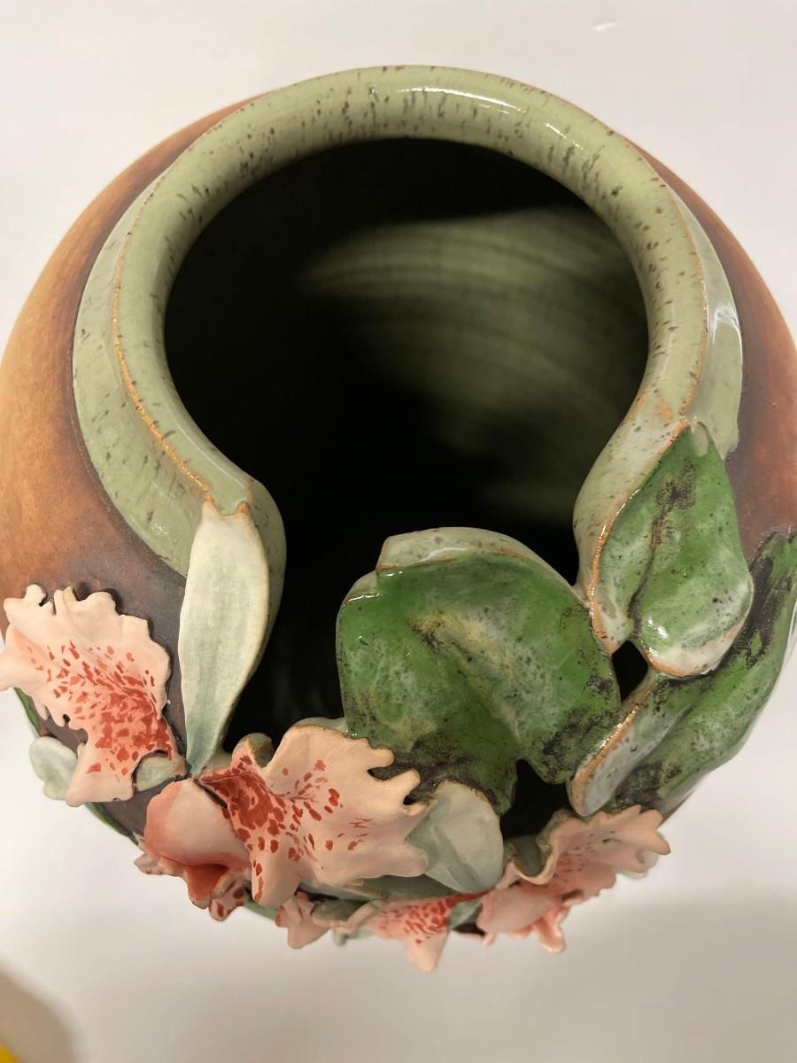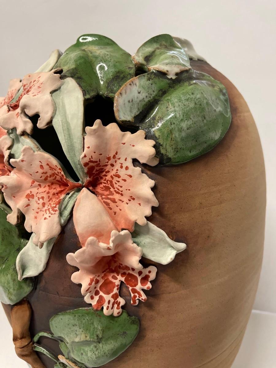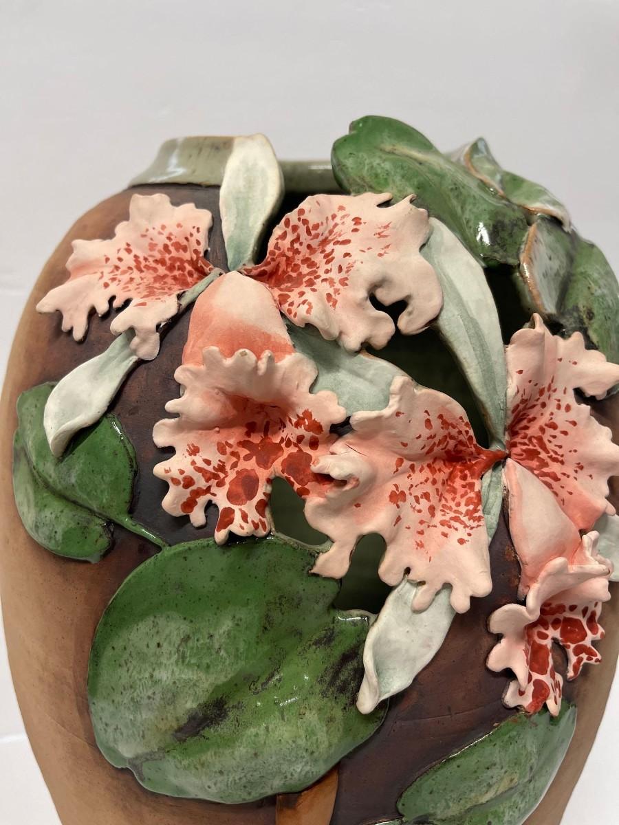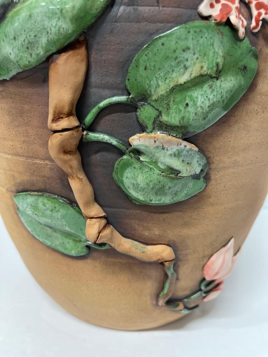 Vintage Old Patagonia Pottery Vase With Flowers circa 1998. Excellent condition with more refined floral design than many of its counterparts. 15”