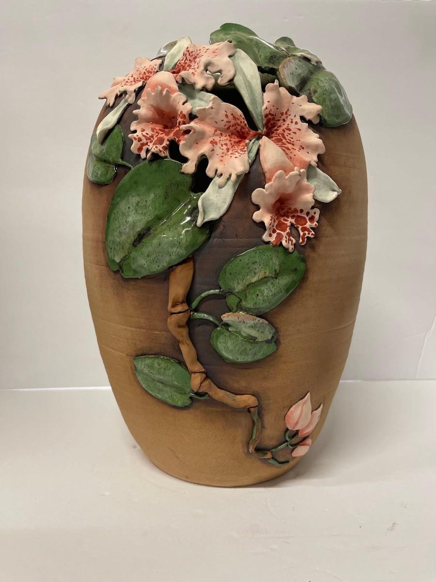<p>Vintage Old Patagonia Pottery Vase With Flowers circa 1998. Excellent condition with more refined floral design than many of its counterparts. 15” </p>