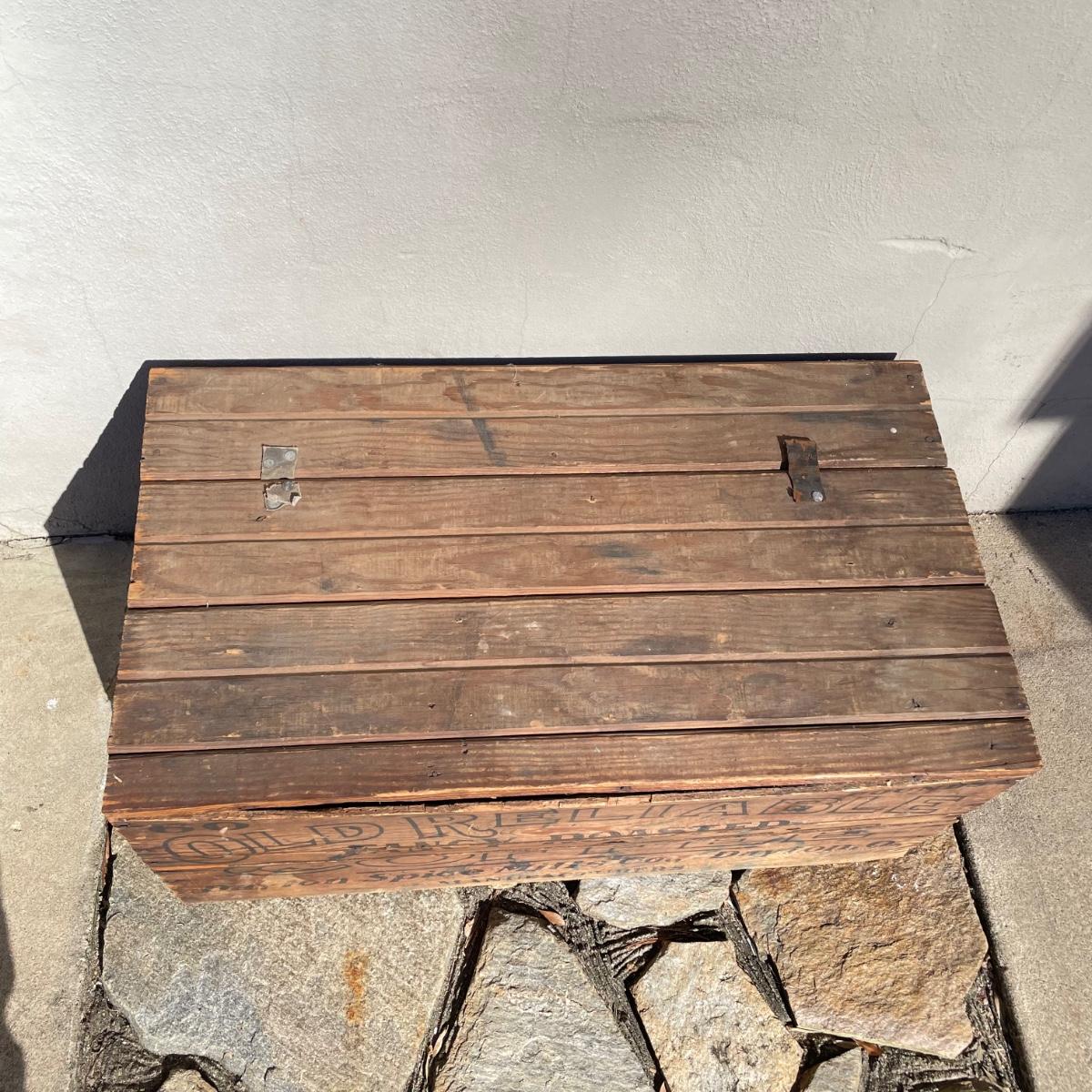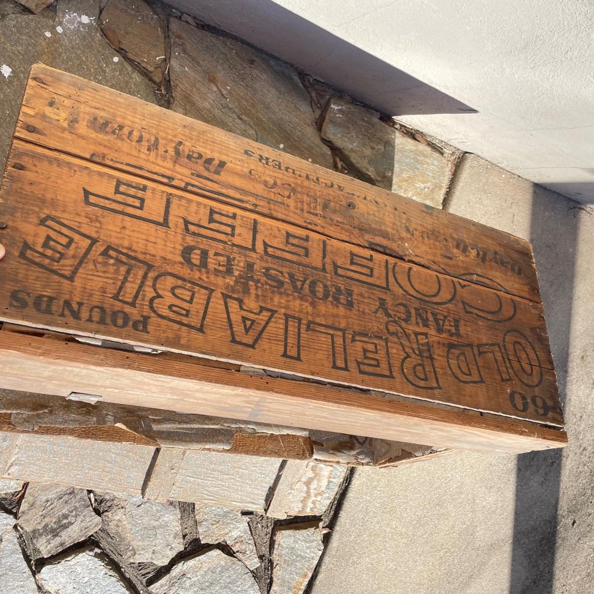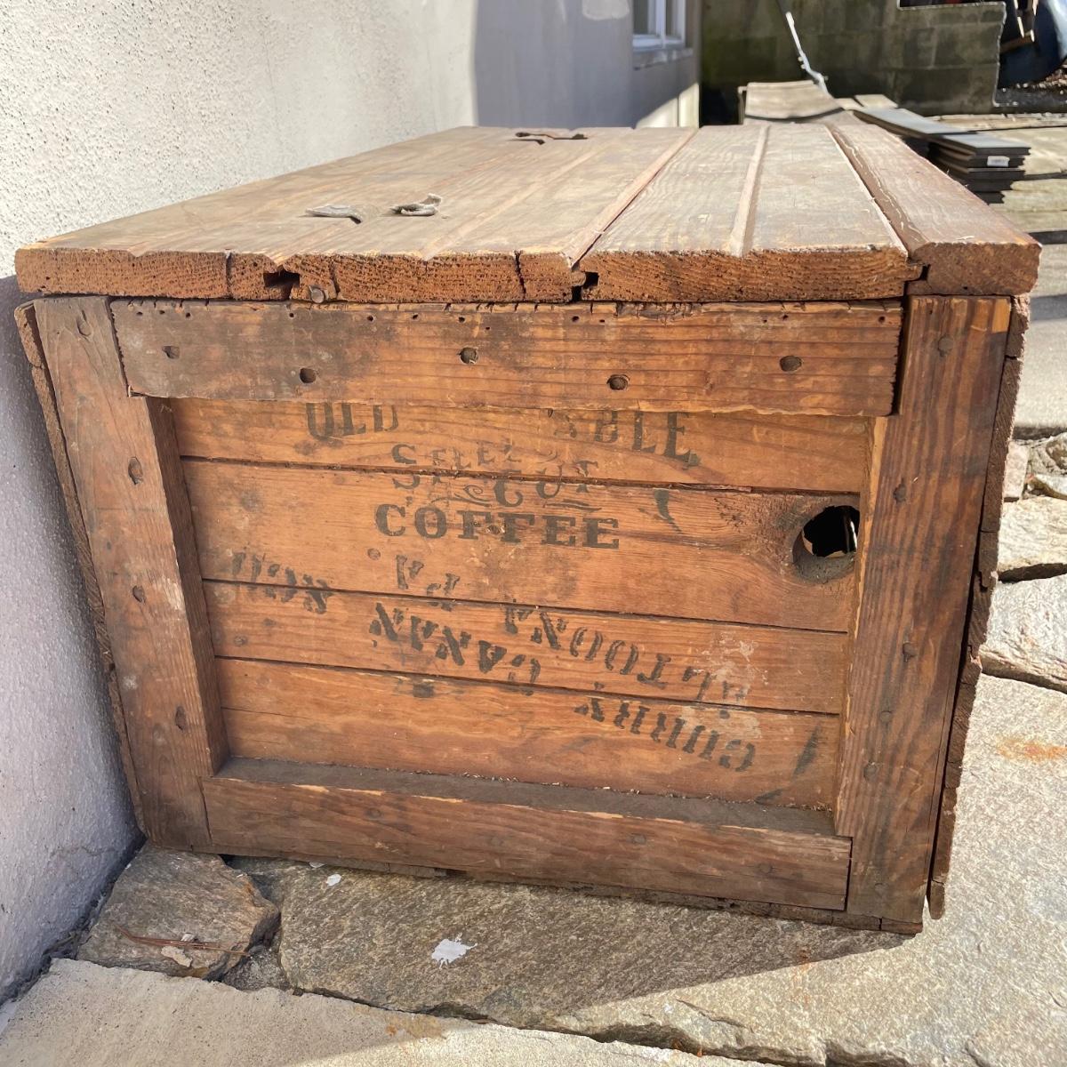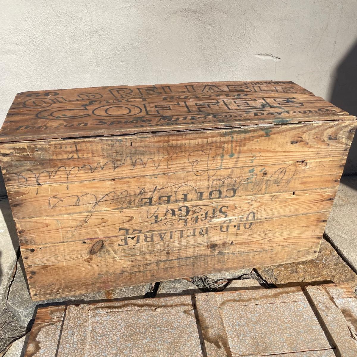 Large lidded Old Reliable Fancy Roasted Coffee crate. Box is lined with worn paper and once had leather hinges. The hinges have separated and lid fully separates to open box. Box measures approximately 31” x 17” x 13”. See images. Shipping available. Please call UPS with dimensions at 828-252-6930 for a shipping quote prior to bidding.