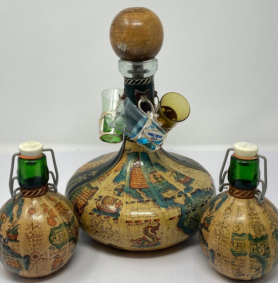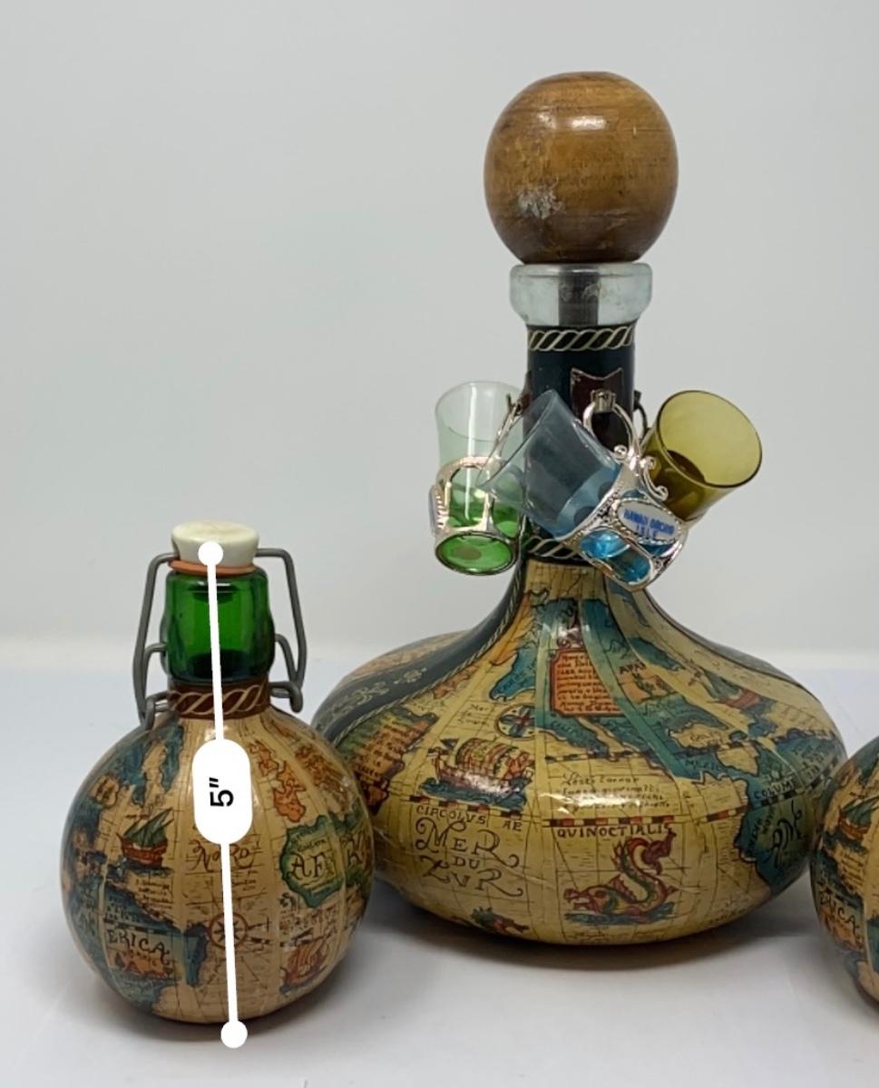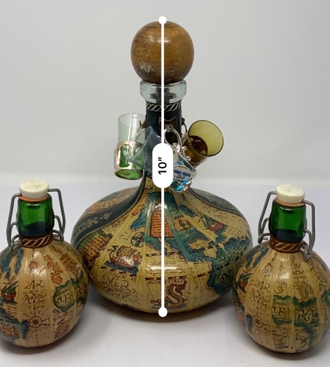 Vintage Old World Map Decanter with Stopper, Two Small Decanters, and Three Shot Glasses. ***There is NO Alcohol/Liquid in Any of the Decanters/Containers. All Decanters/Bottles/Containers are Empty and Being Sold as a Collector’s Item