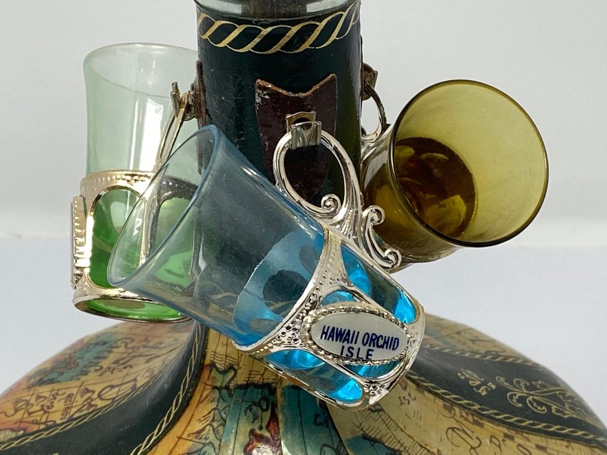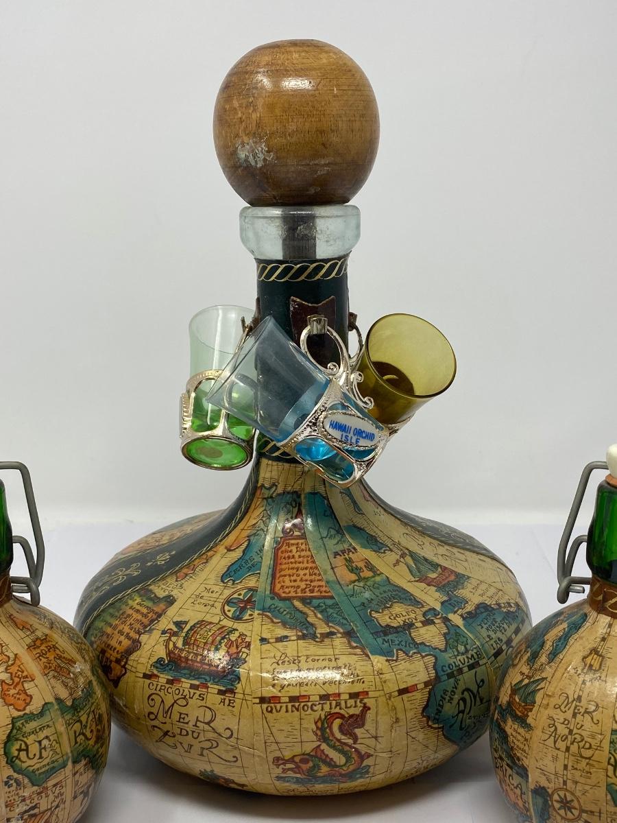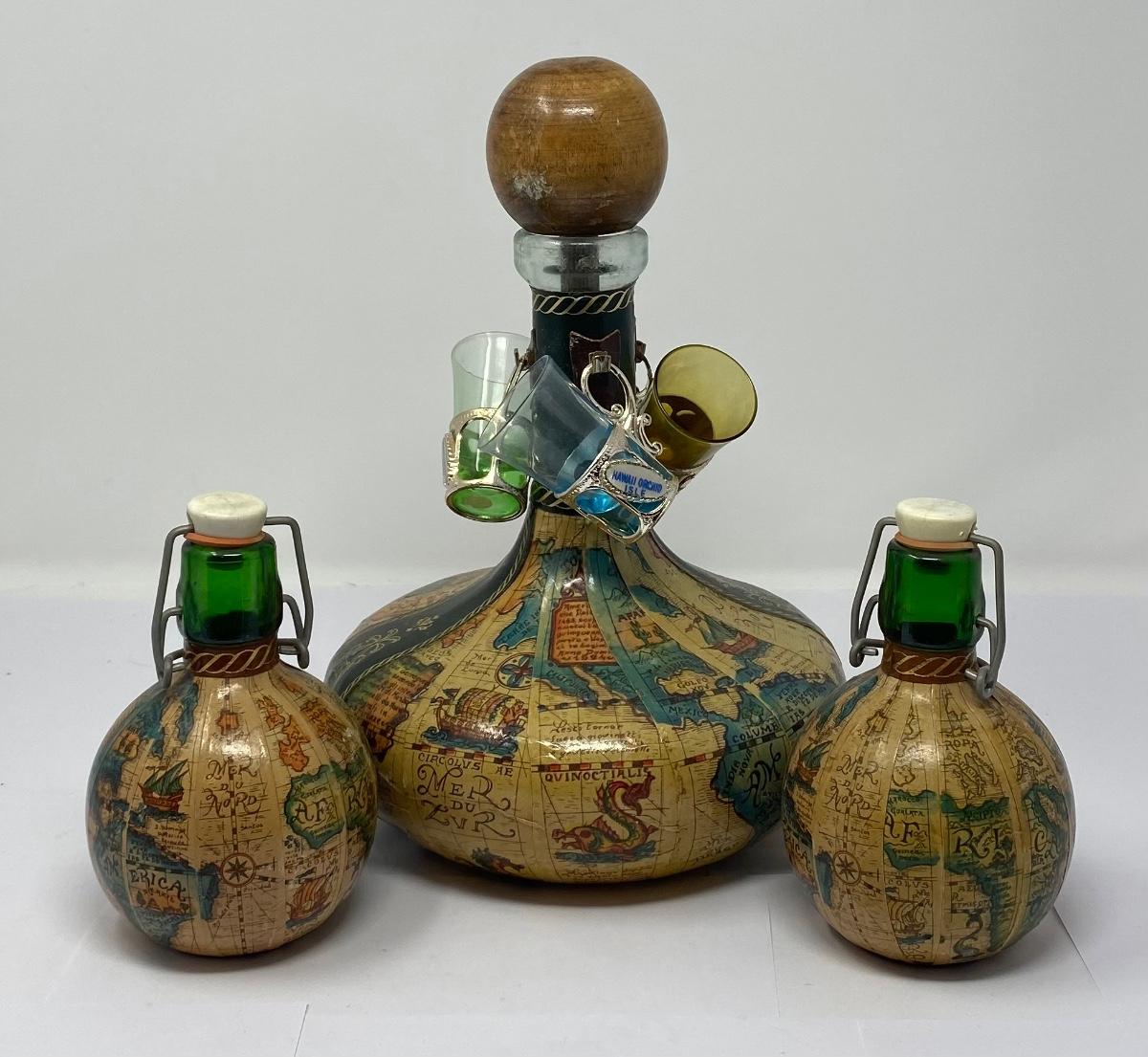 Vintage Old World Map Decanter with Stopper, Two Small Decanters, and Three Shot Glasses. ***There is NO Alcohol/Liquid in Any of the Decanters/Containers. All Decanters/Bottles/Containers are Empty and Being Sold as a Collector’s Item