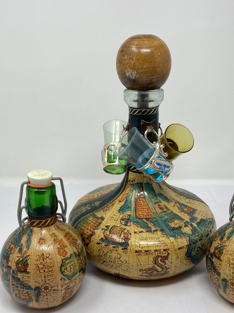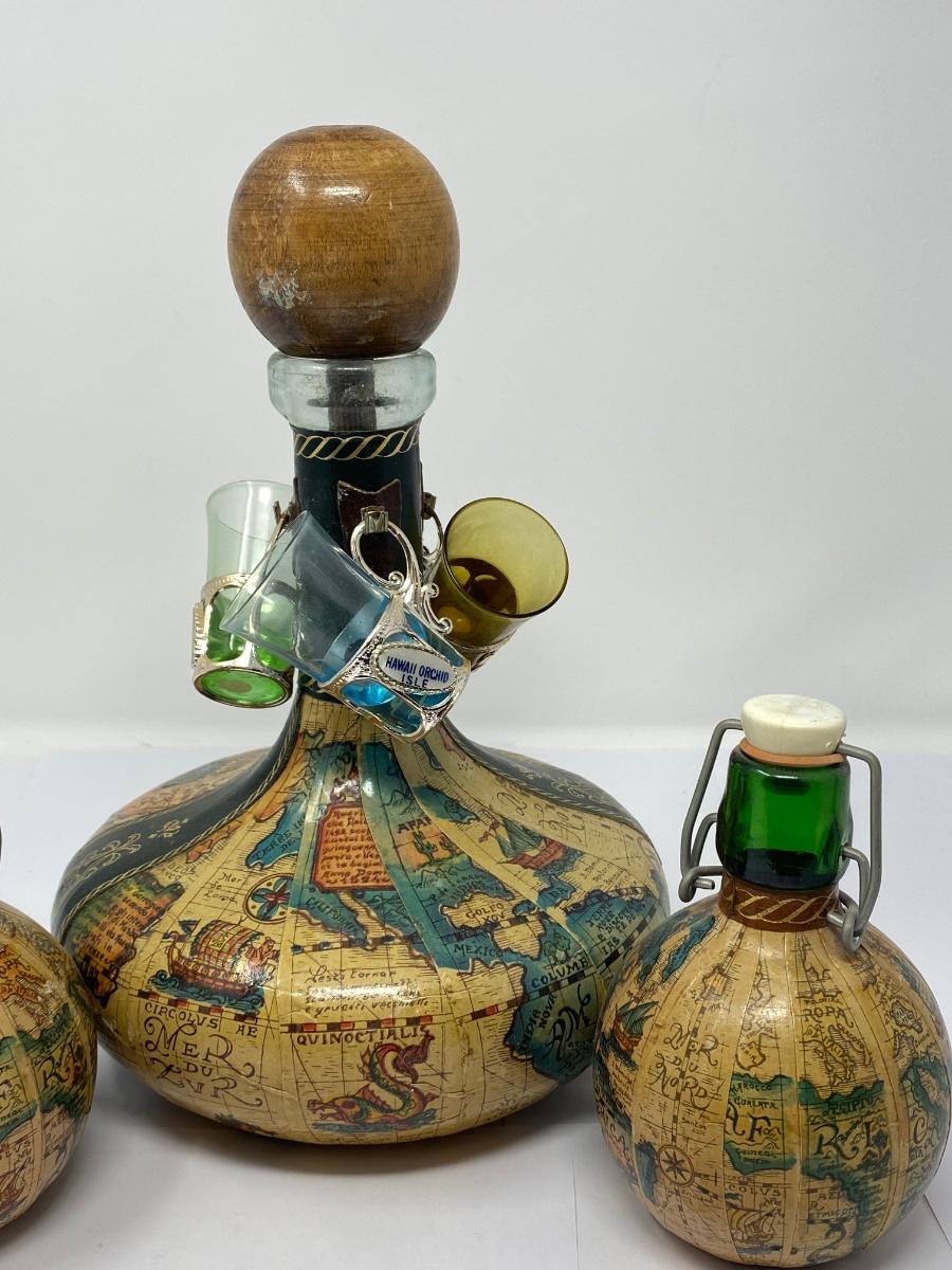 Vintage Old World Map Decanter with Stopper, Two Small Decanters, and Three Shot Glasses