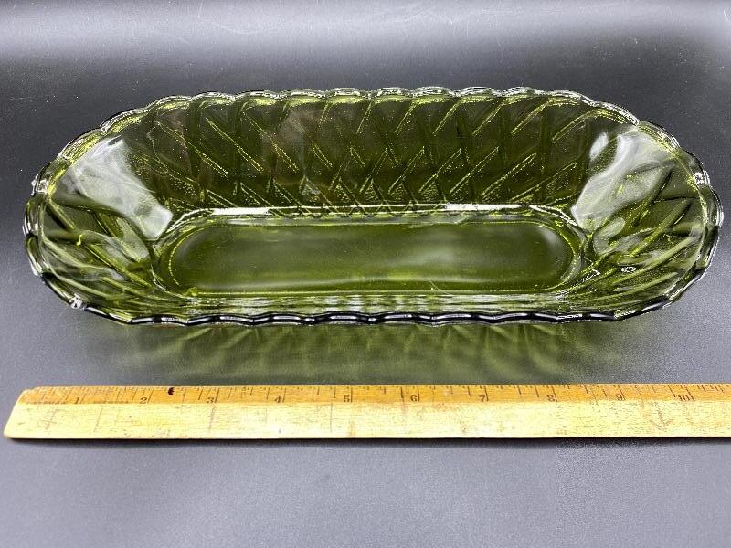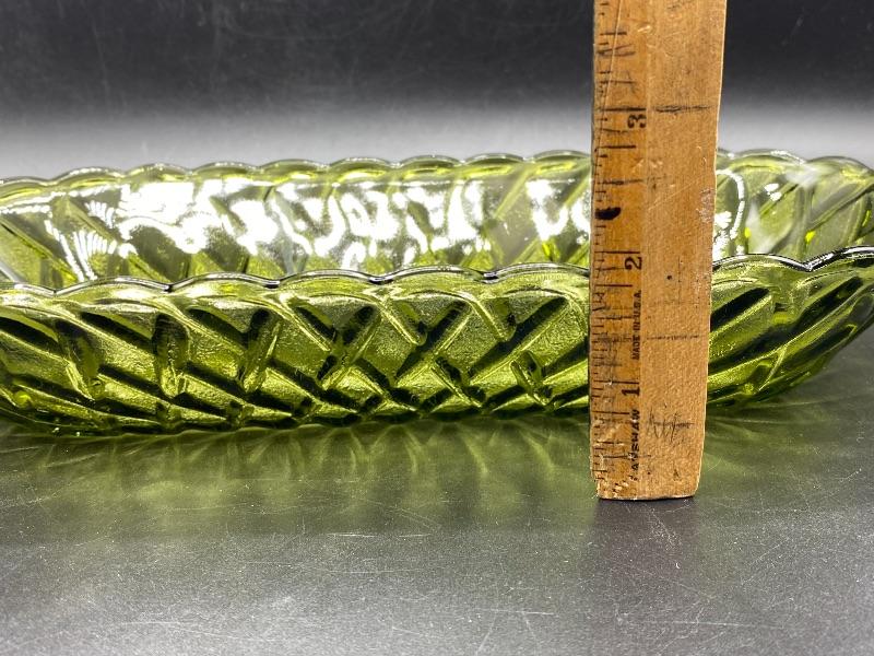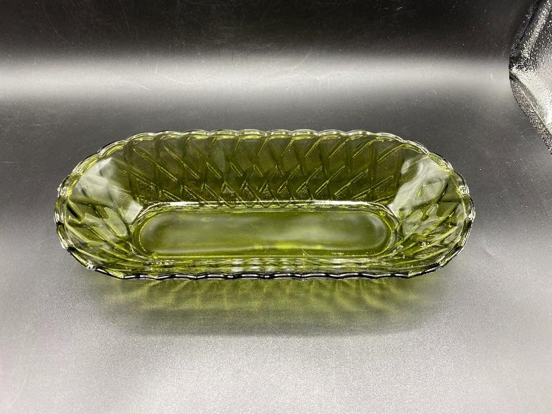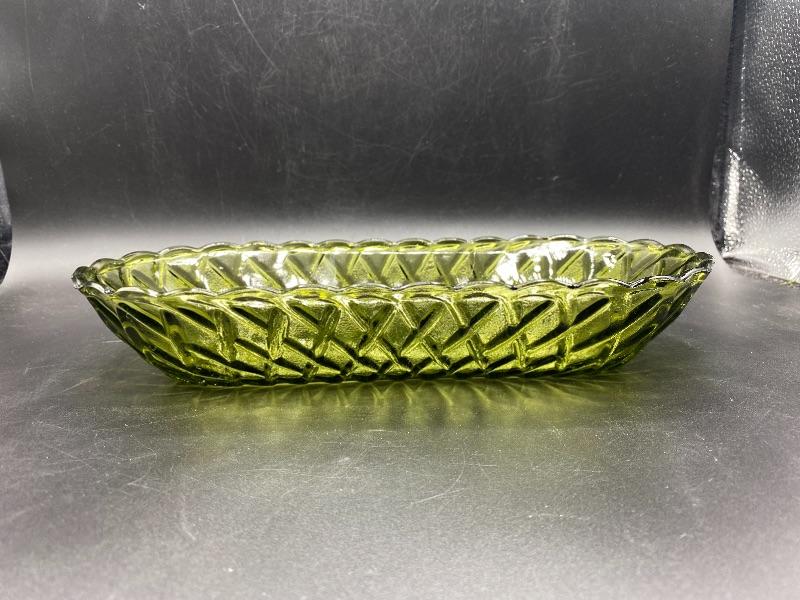 Vintage olive green basket patterned cracker dish. Shallow, oblong bowl great for crackers or relishes. Good condition. About 11" size.