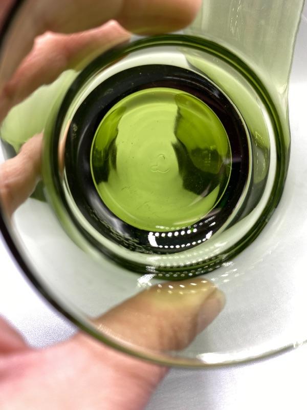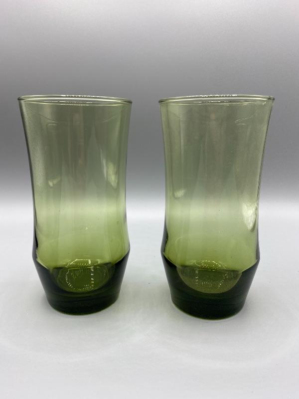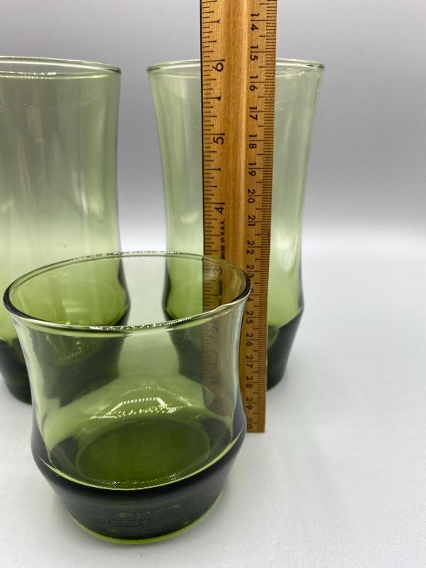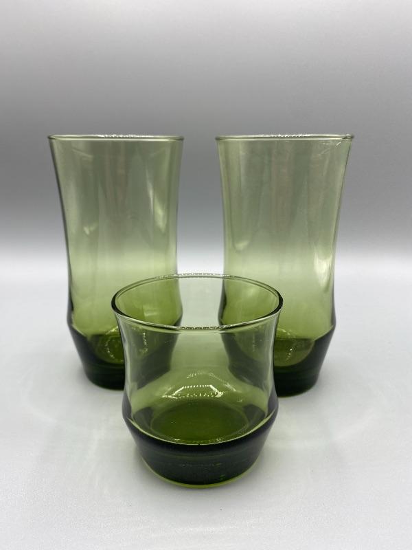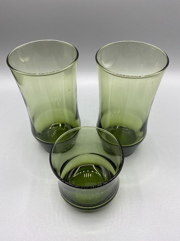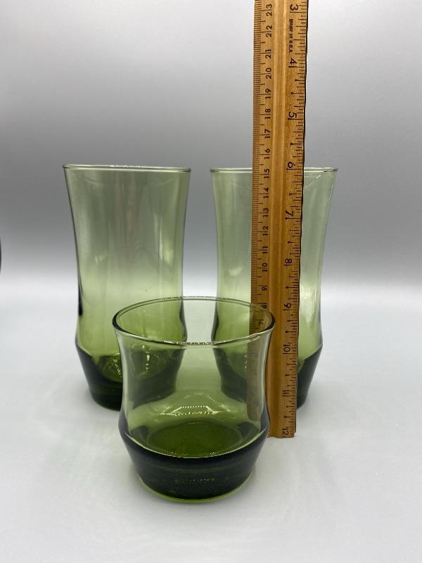 Vintage olive green Libbey glassware. Pair of drink glasses and a tumbler glass. Heavy bottoms. Good condition.