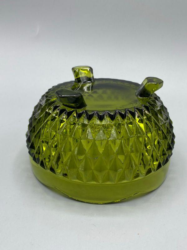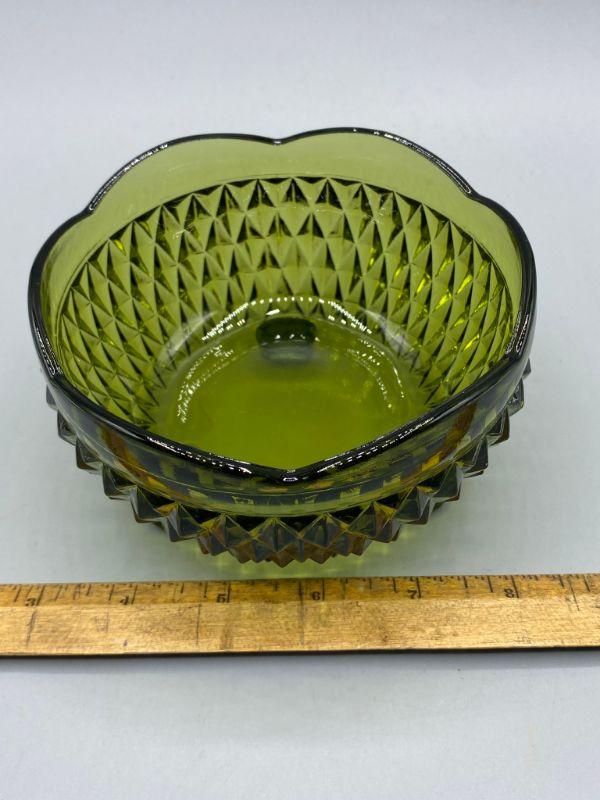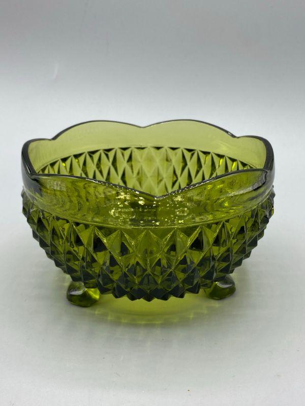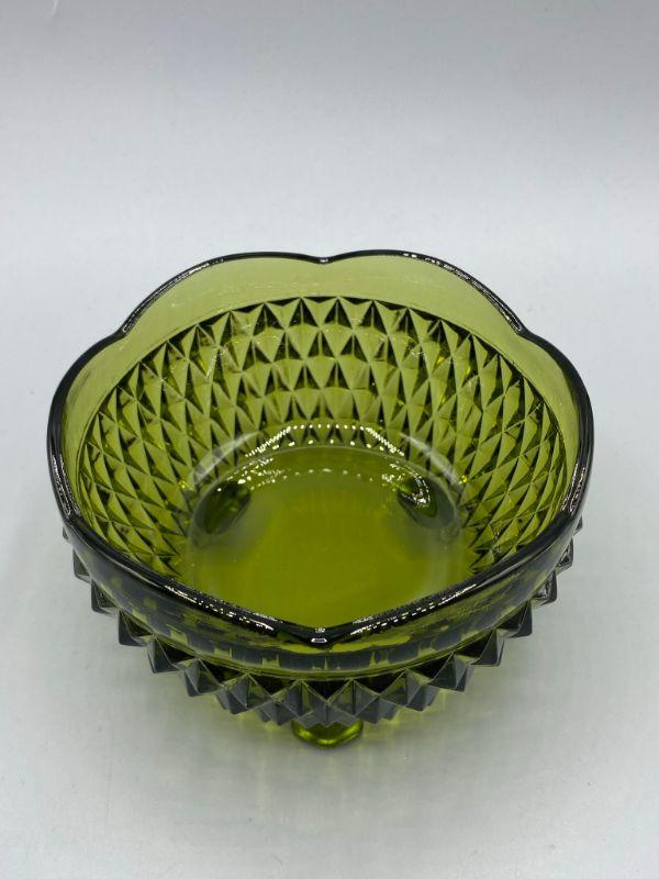 Vintage olive green pressed glass footed bowl. Scalloped edge with a diamond pattern. Good condition, no chips. Small 5" size, perfect for candy & nuts.