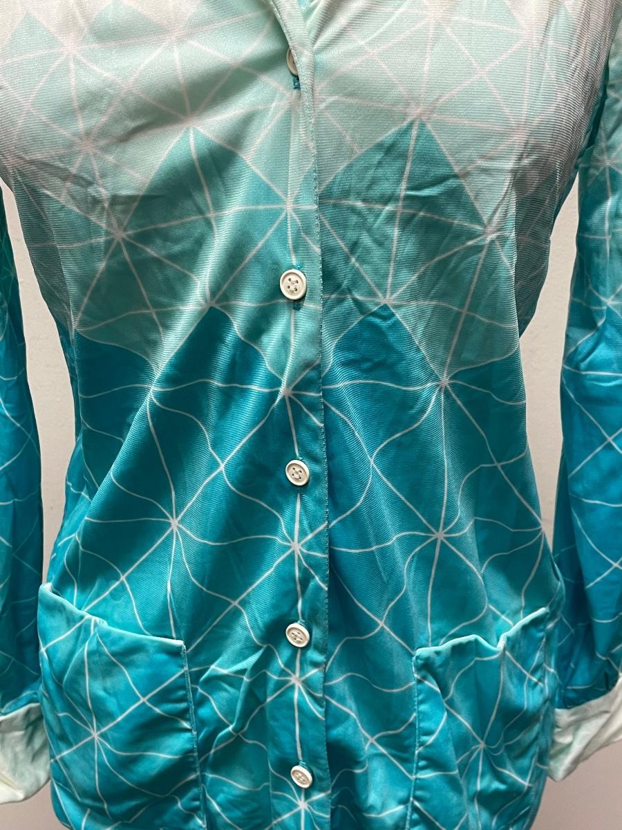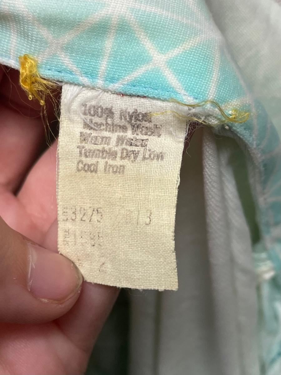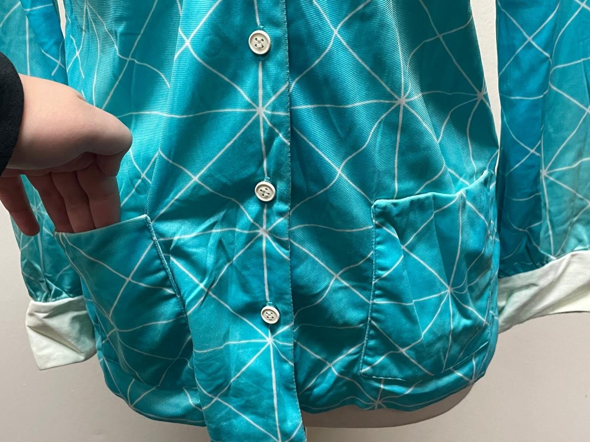 This item is in good condition. It seems like it would fit a size small, maybe medium. It is a bit wrinkled due to being folded. The material is very thick, it’s 100% nylon. The shirt comes with no buttons missing.