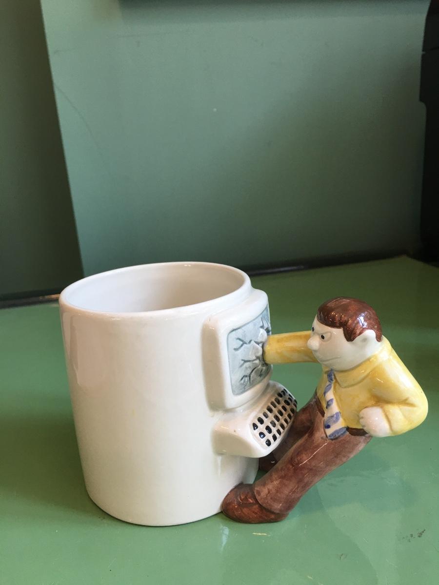 Vintage Omnibus coffee cup mug man smashing hand through computer screen. No chips or cracks good used condition. 3.75 inches tall. Great gift if you have an IT person in your life.