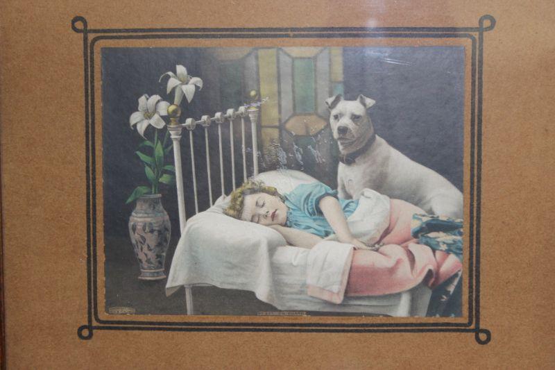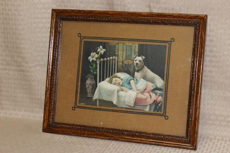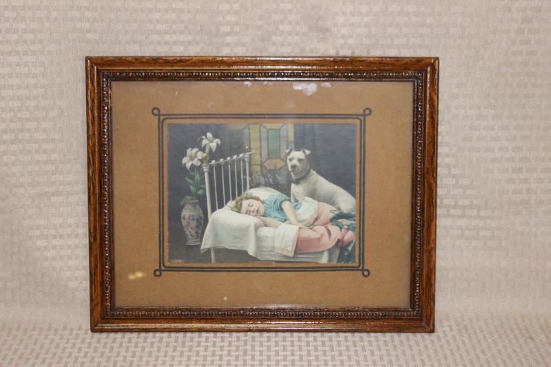 Framed vintage print "On Guard" features a dog watching over a sleeping child. Frame measures 11.5x14.5.