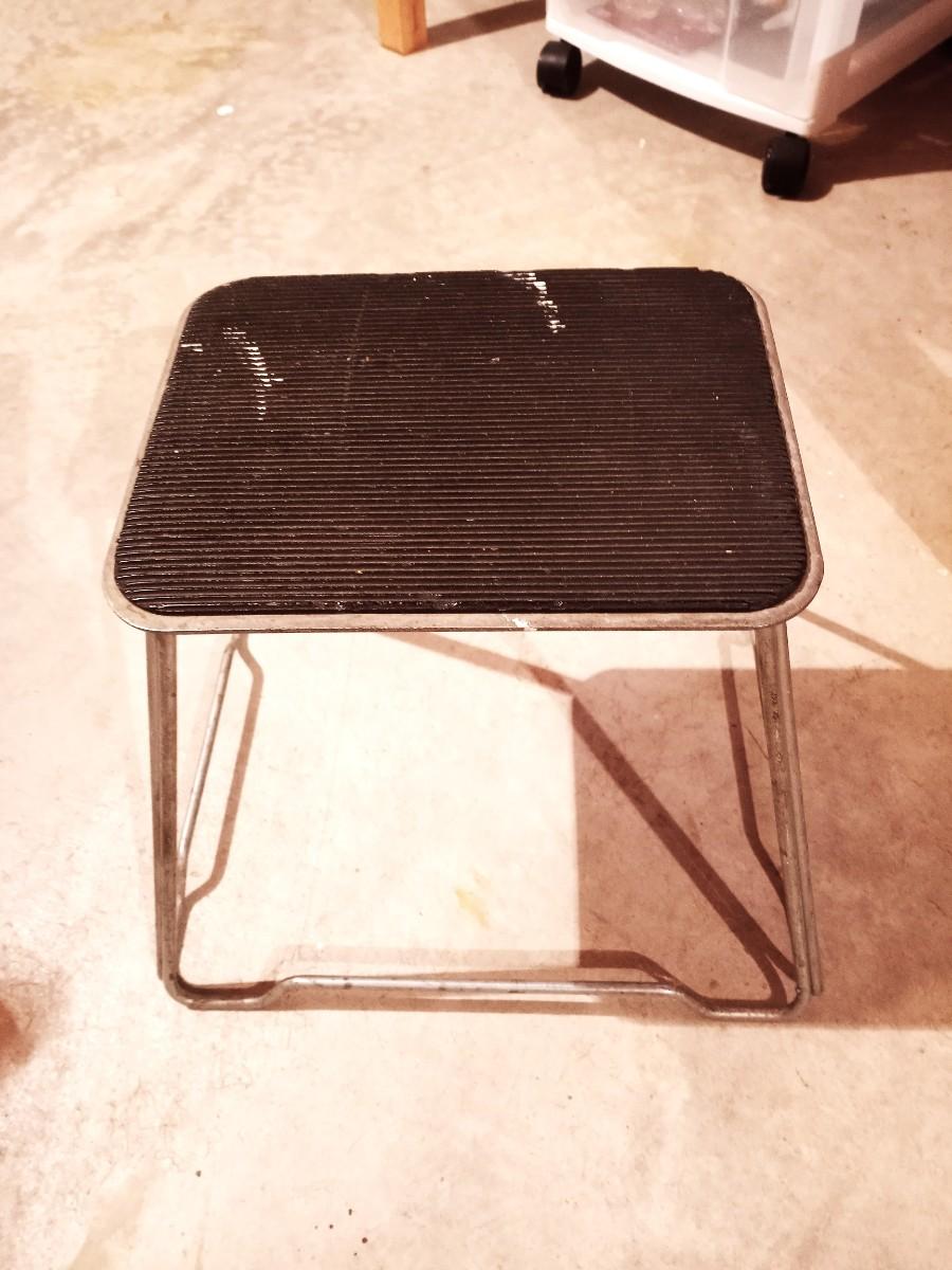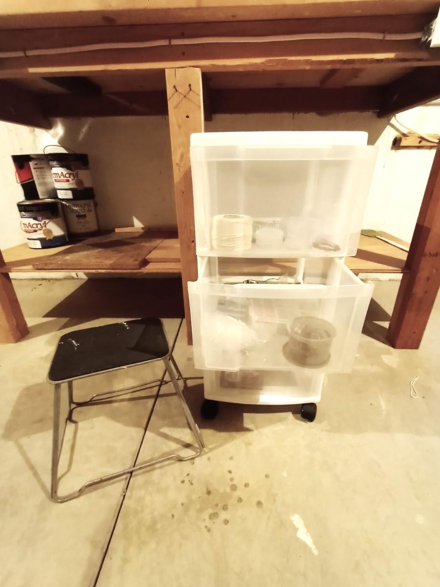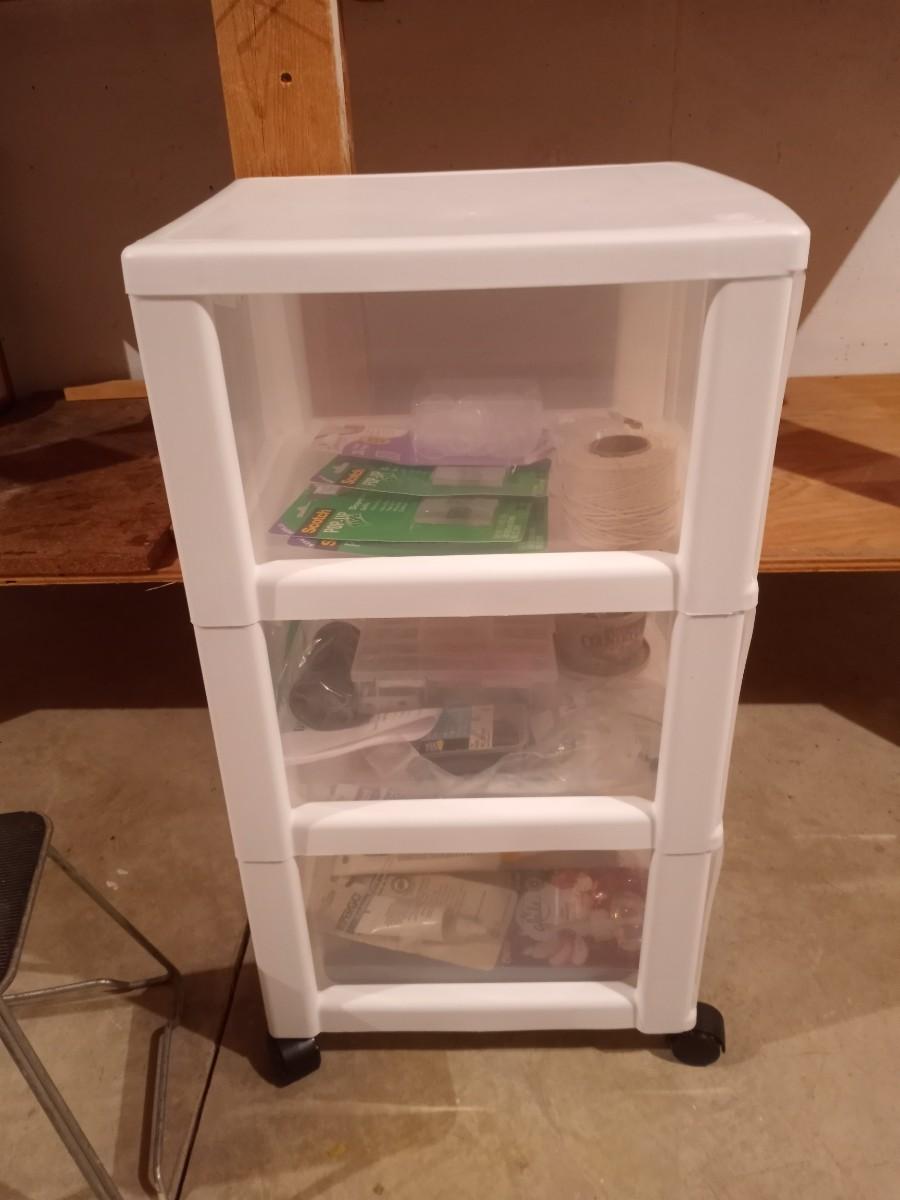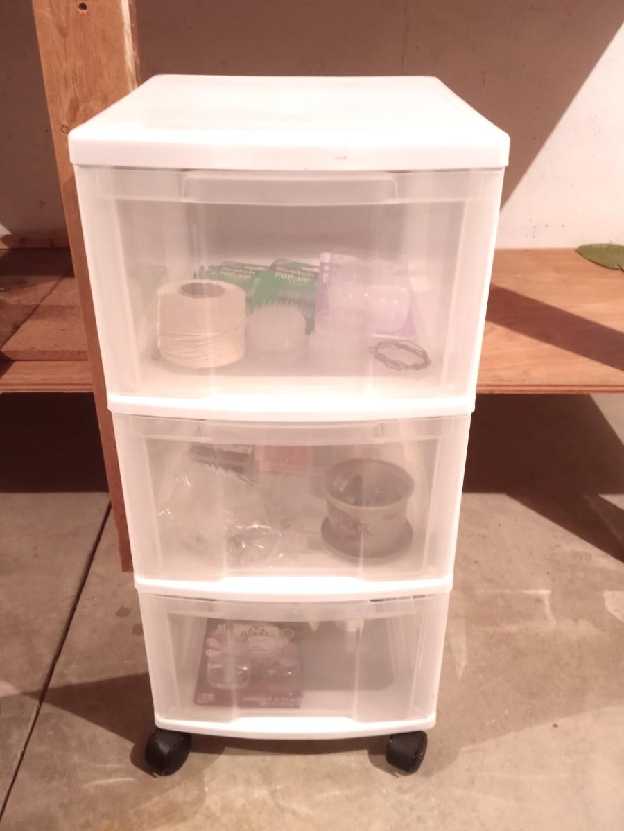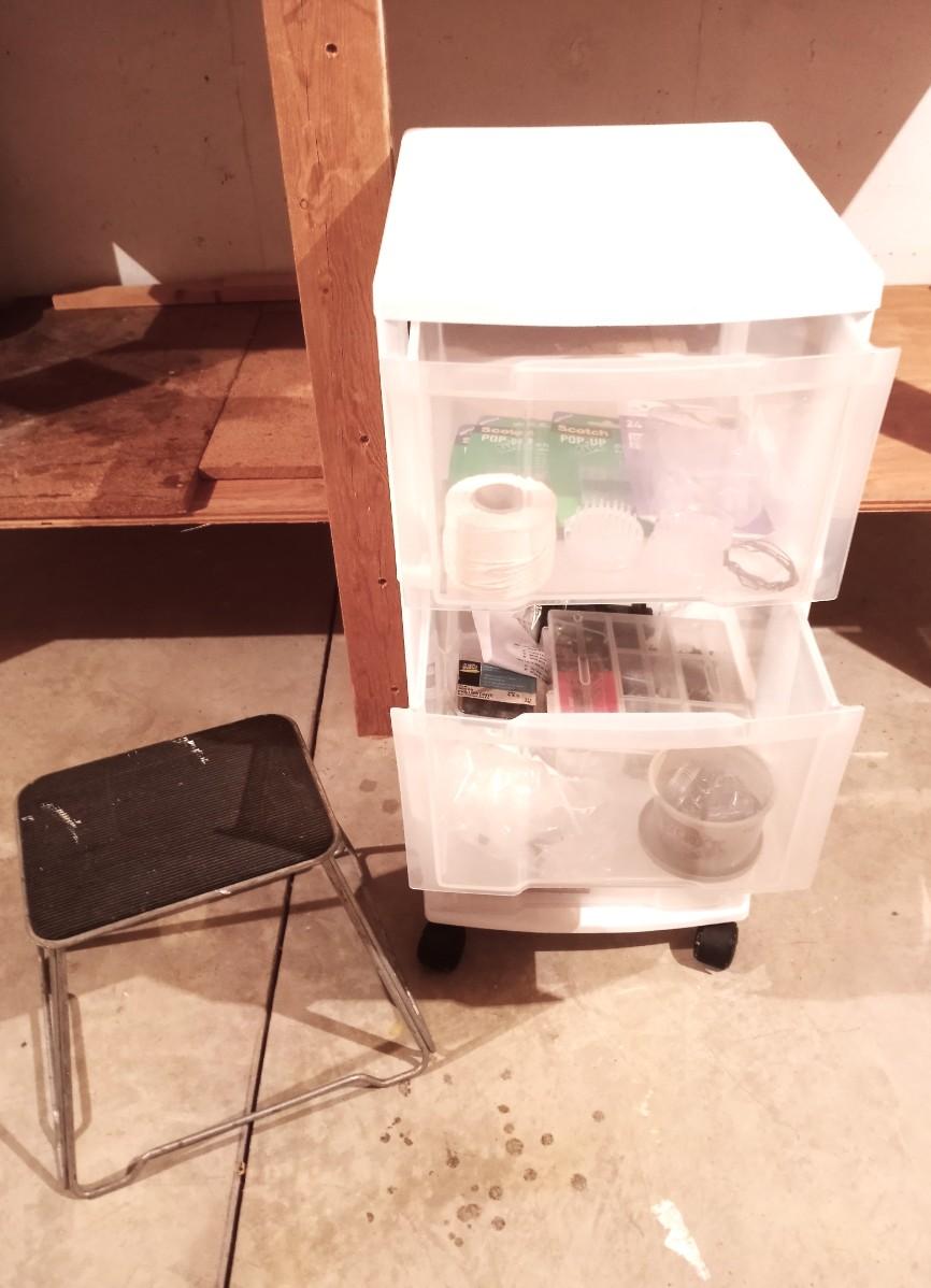 VINTAGE ONE STEP STOOL AND THREE DRAWER CONTAINER ON CASTORS WITH HARDWARE