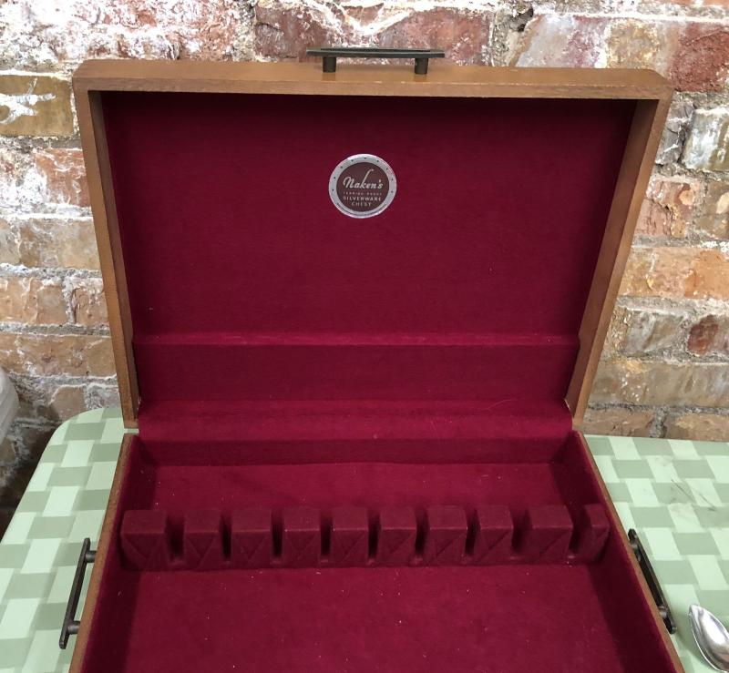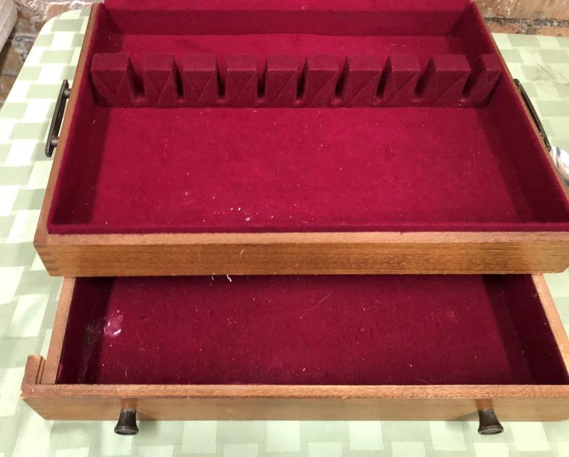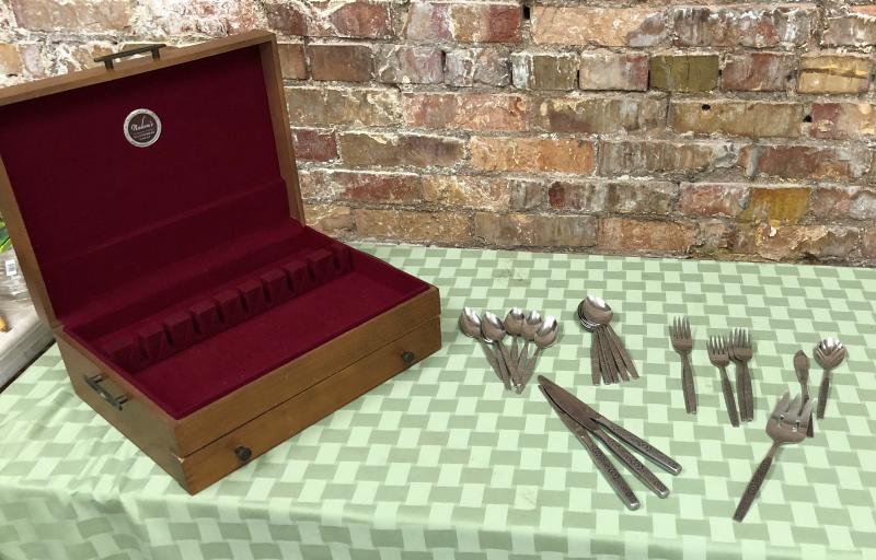 As shown, pieces of a vintage Deluxe Stainless flatware service by Oneida...with wooden display case...a nice start on a full set...