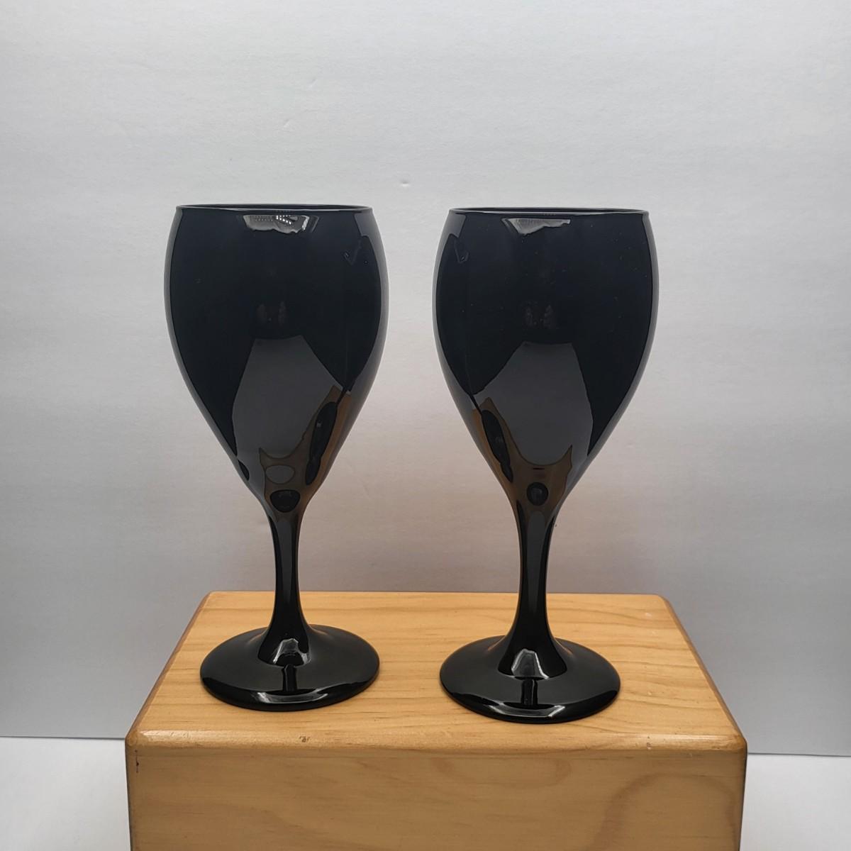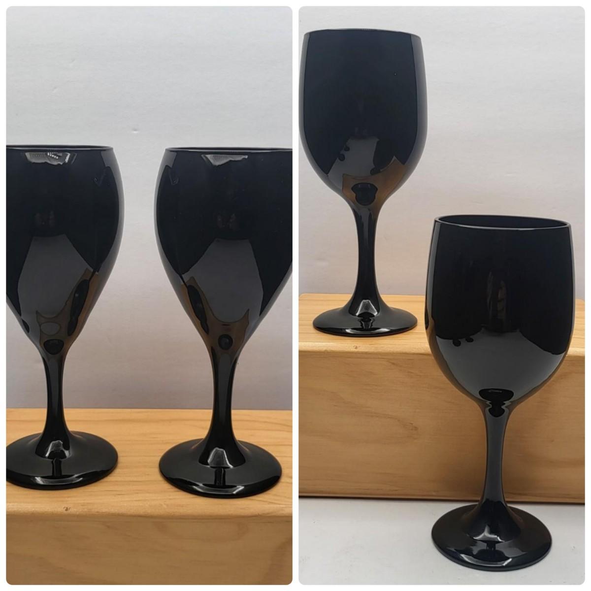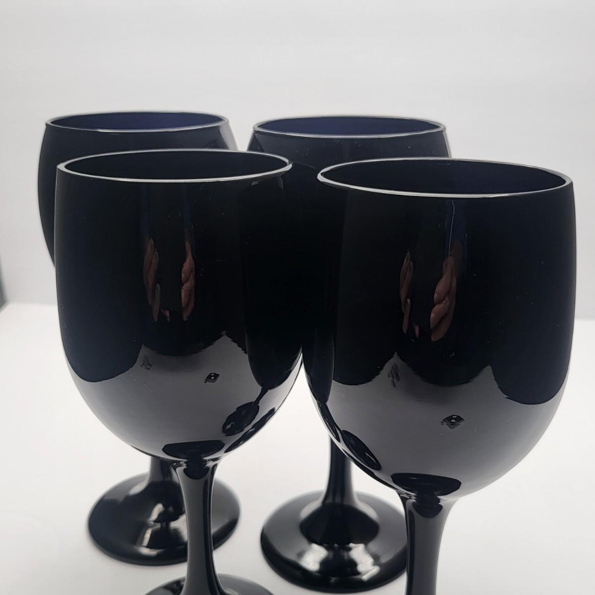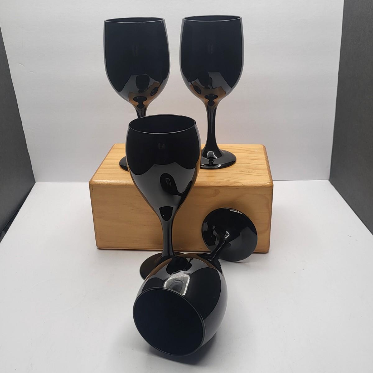 2 pairs, black wine glass, Libby brand. Two are 7.25" tall, two are 7.5" tall. The way that light hits them, they can look deep cobalt blue but under normal daylight, they appear onyx black. Shipping not available on this item.