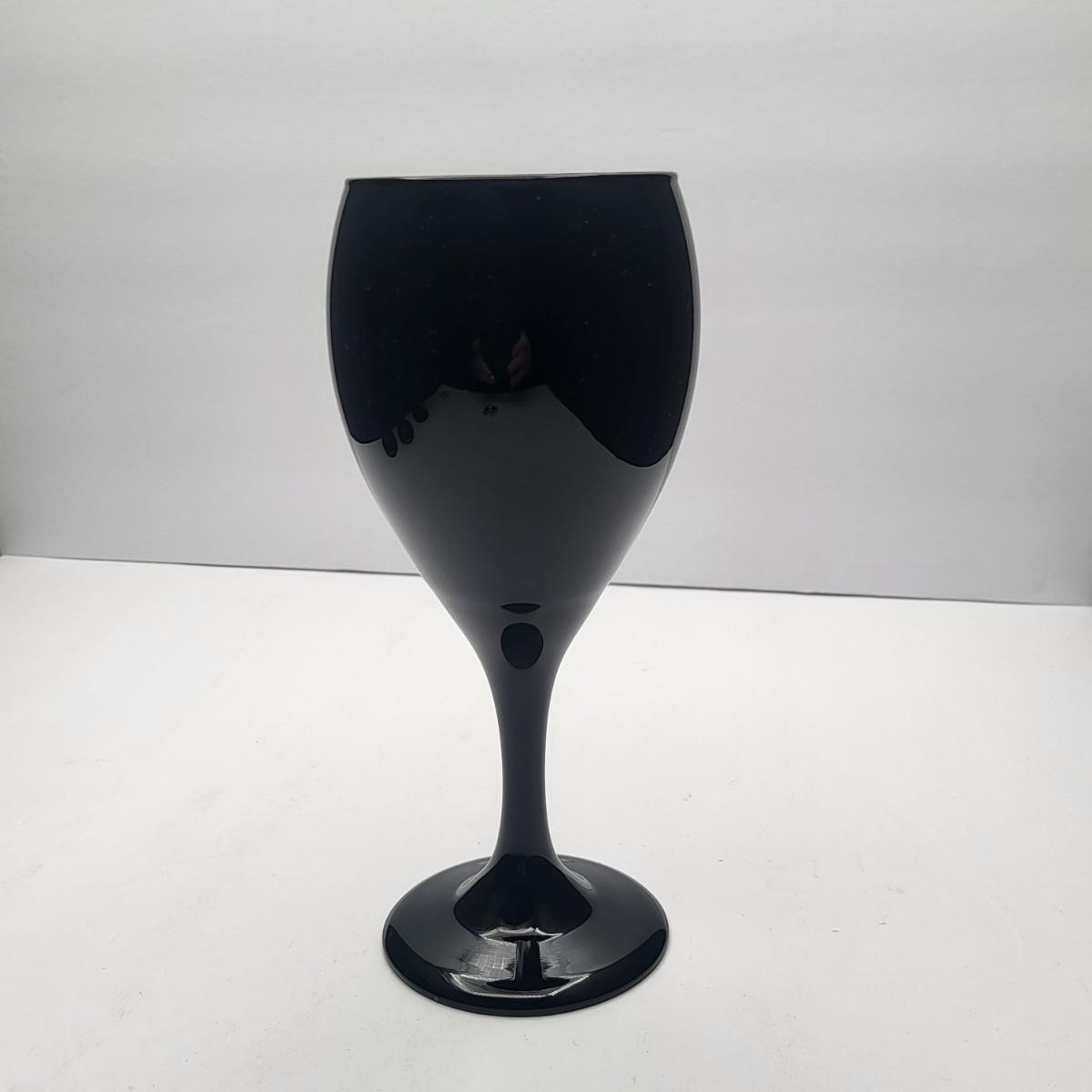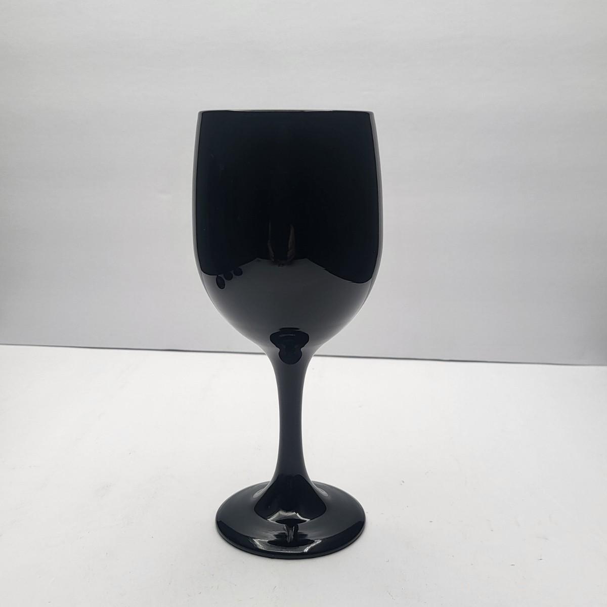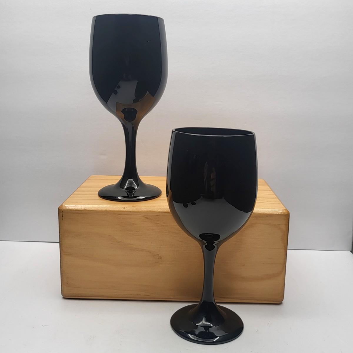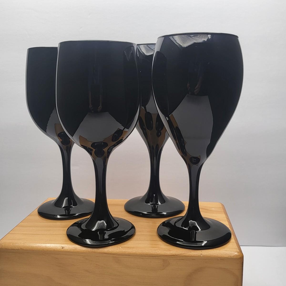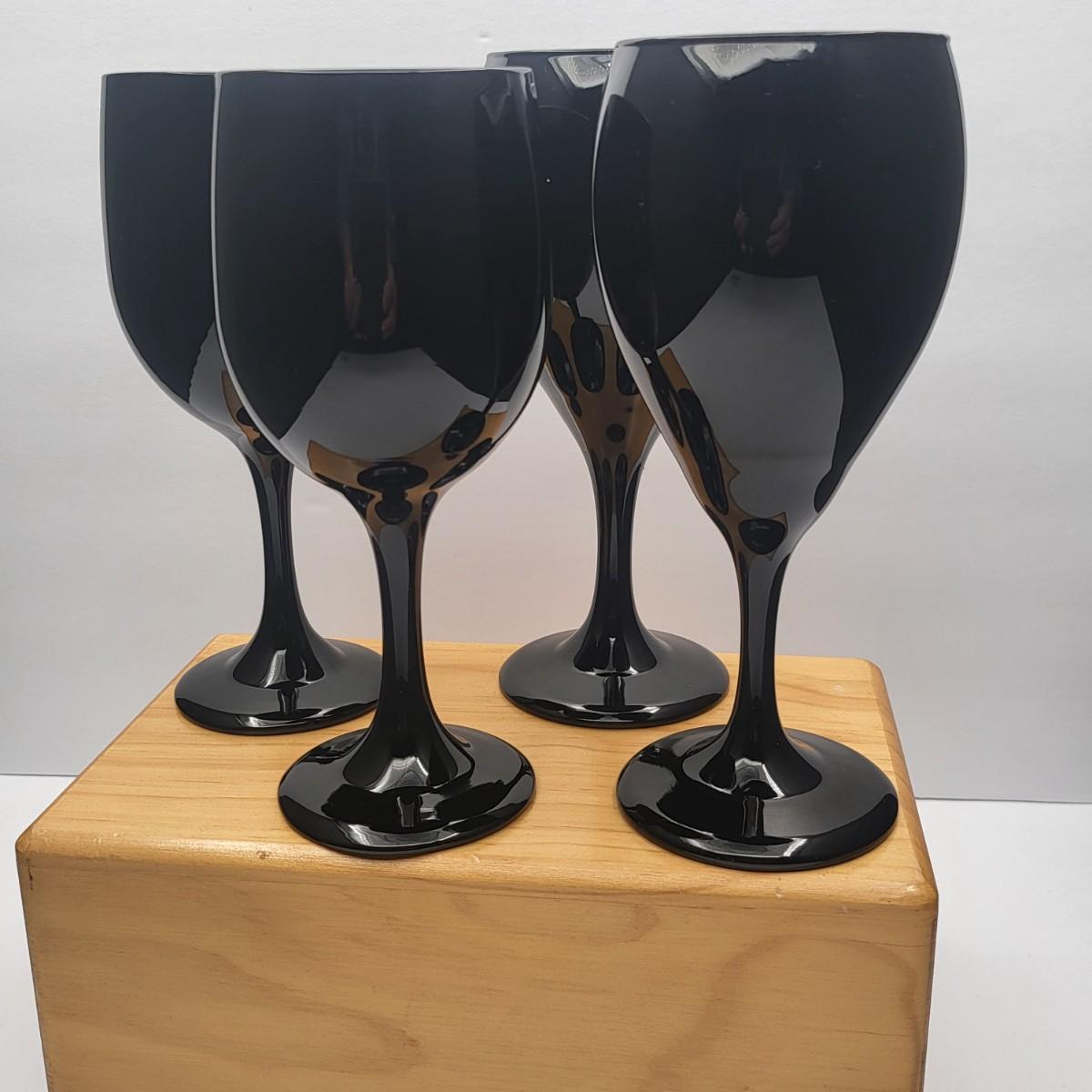 2 pairs, black wine glass, Libby brand. Two are 7.25" tall, two are 7.5" tall. The way that light hits them, they can look deep cobalt blue but under normal daylight, they appear onyx black. Shipping not available on this item.