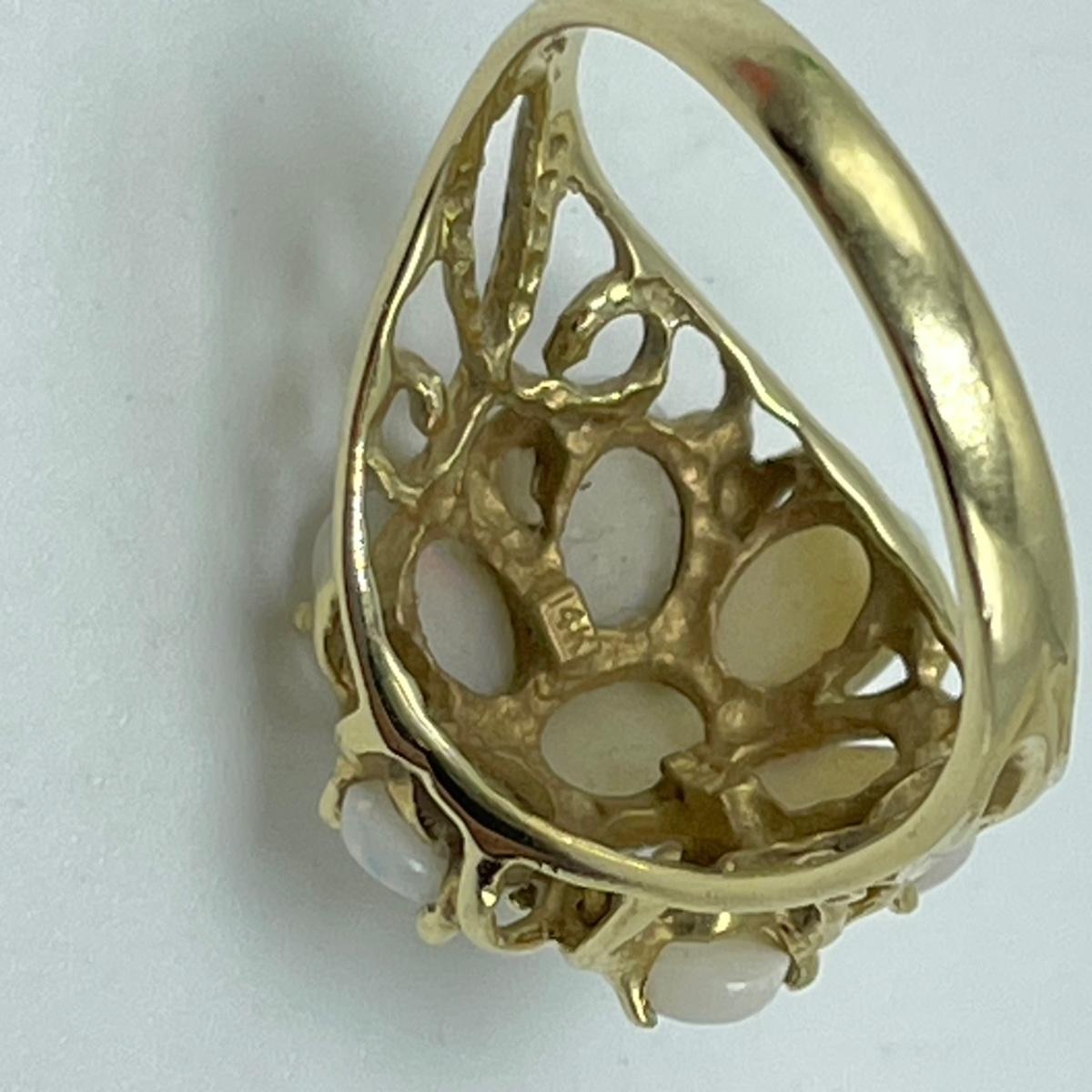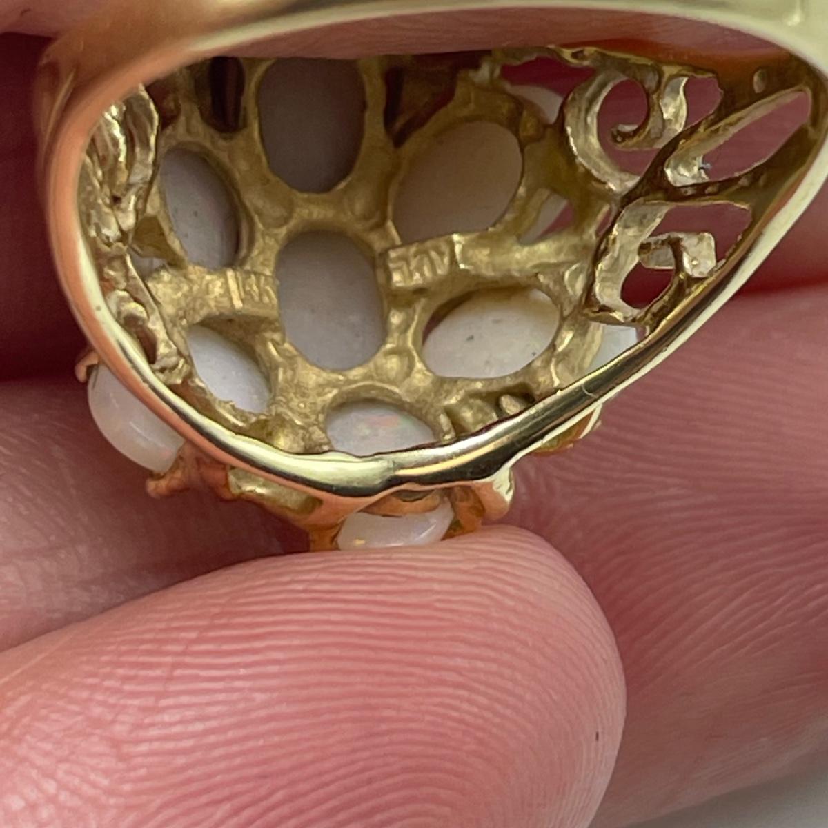 Ornately designed ring marked 14K has a cluster of opal-like stones. Ring has a second marking shown in photos. See images. Shipping available. All sales are final. No returns or refunds. Please bid accordingly.