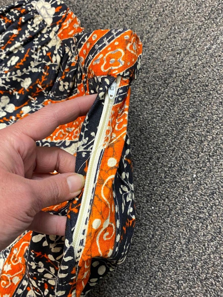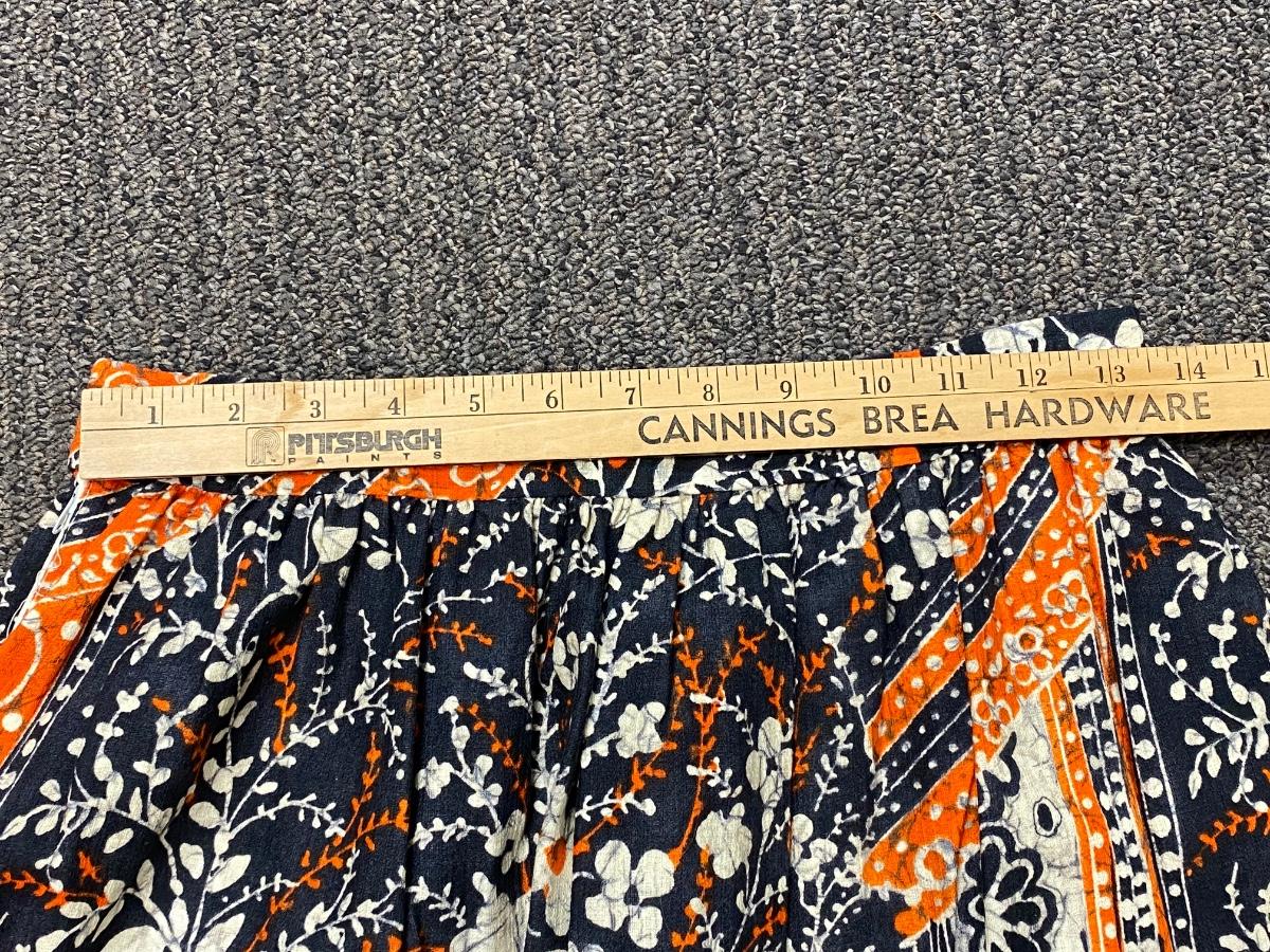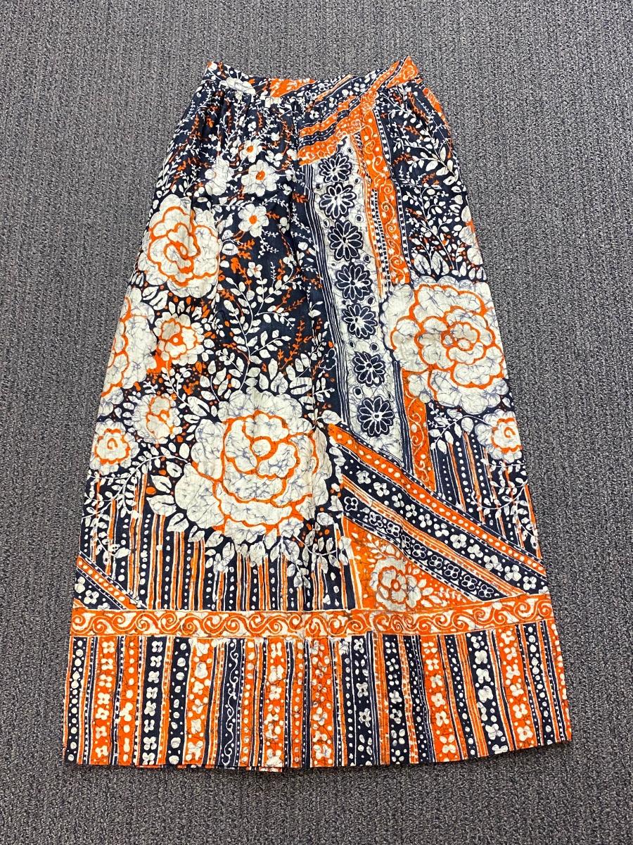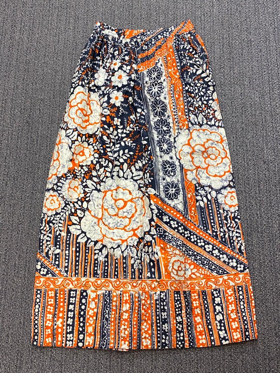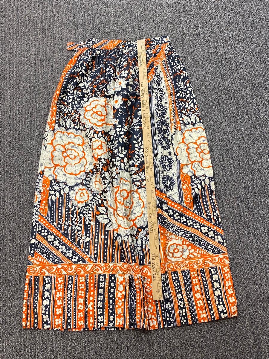 Vintage Orange & Black Colorful Hawaiian Tribal Tropical Cotton Maxi Skirt. in good condition. Side zipper and a couple of snaps at waist. Waist measures about 13" across.