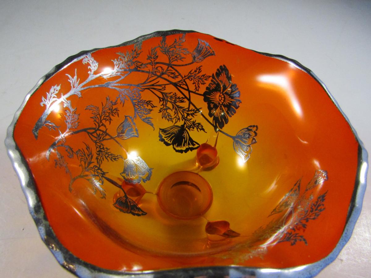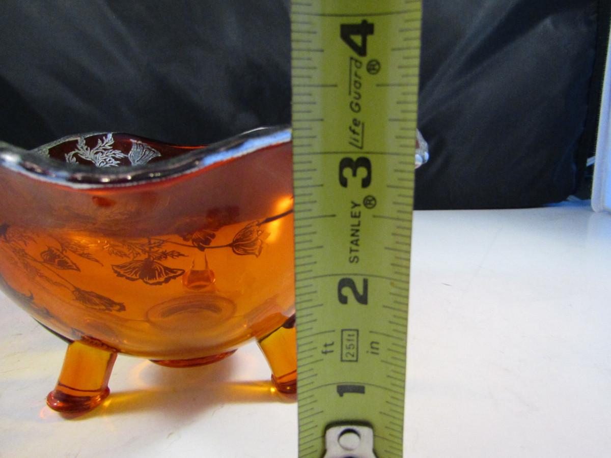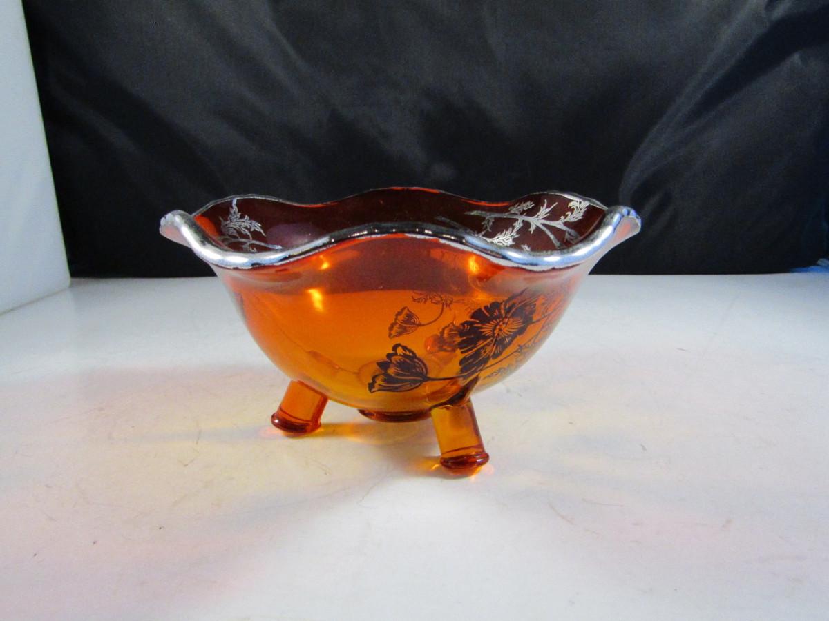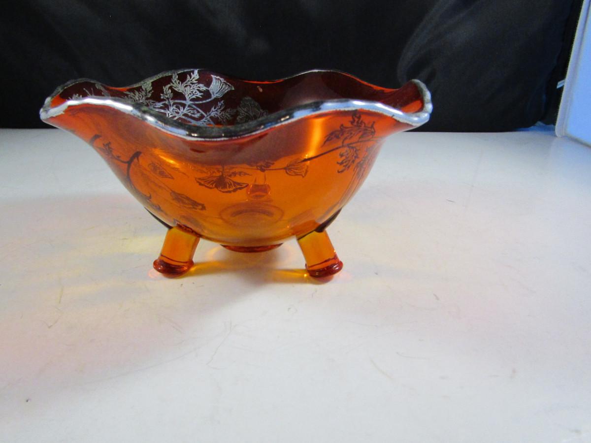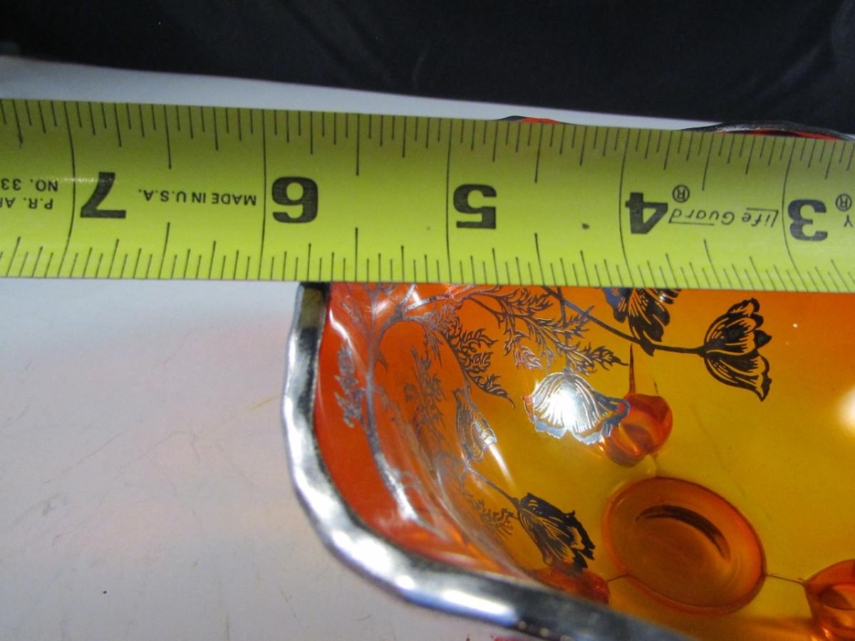 Vintage Orange Glass with Silver Overlay Footed Bowl- Approx 6" in Diameter