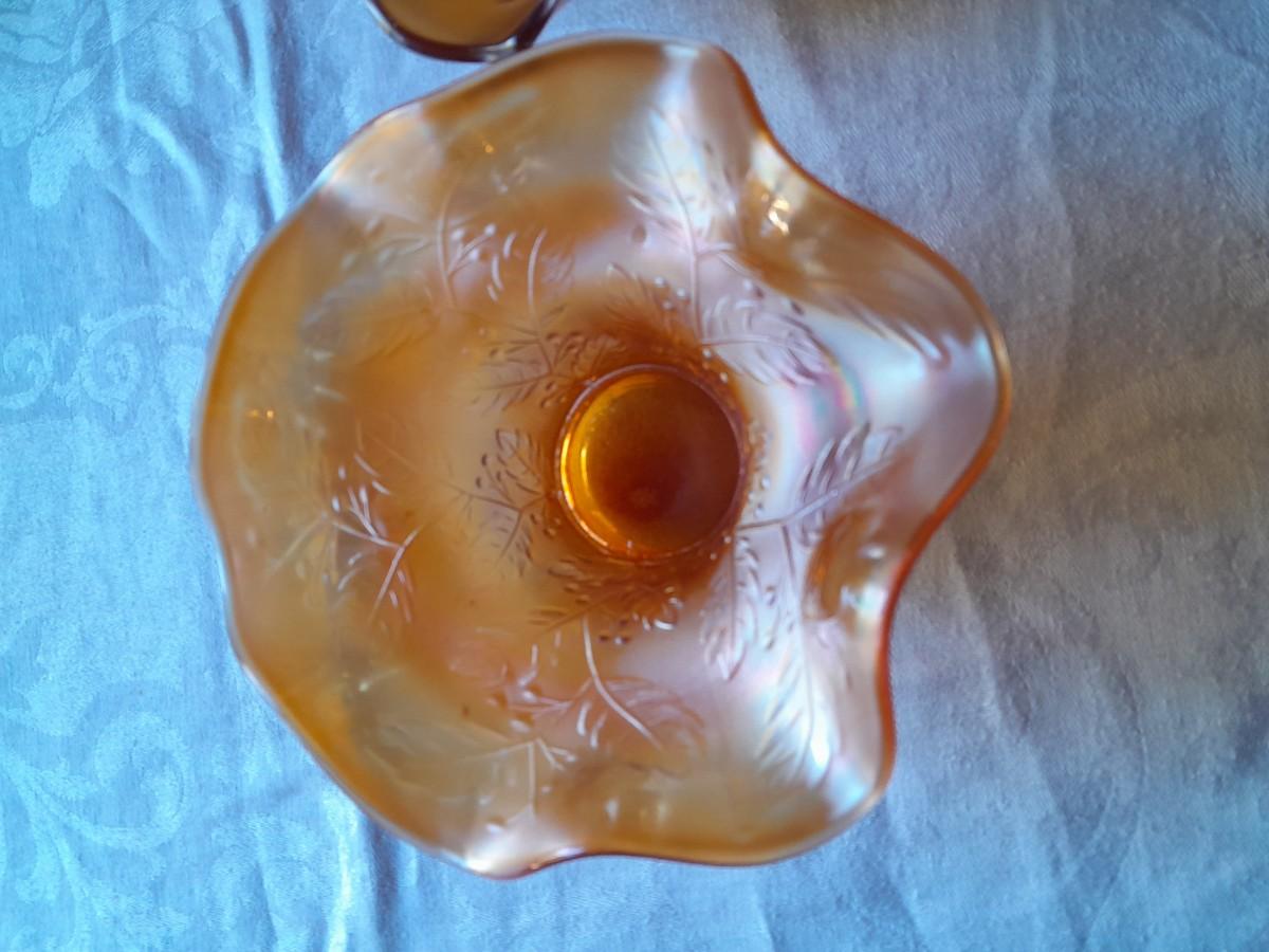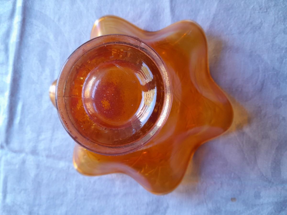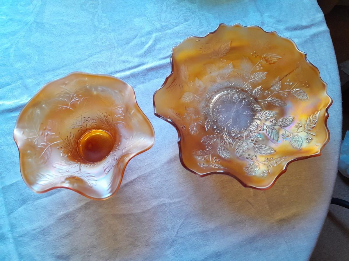 VINTAGE AMBER GLASSWARE WITH PRESSED DESIGNS.