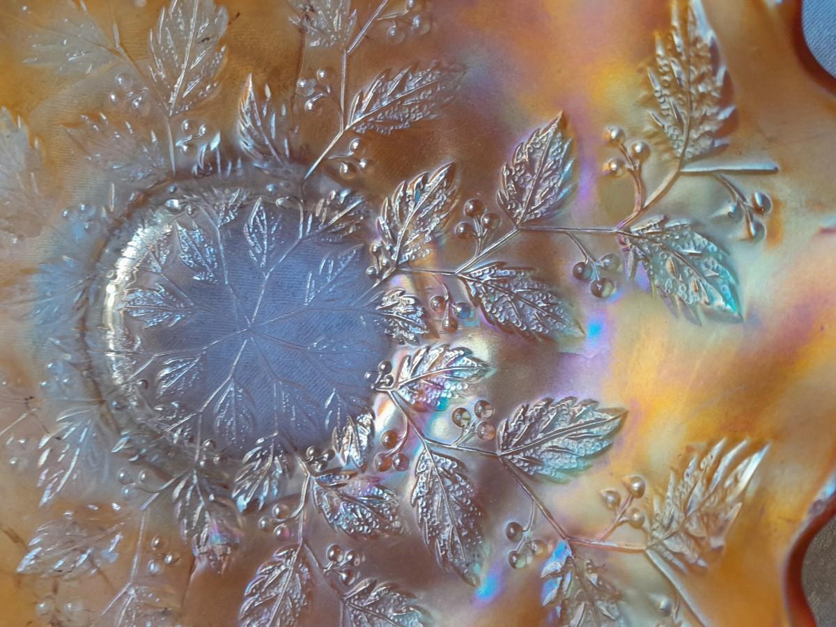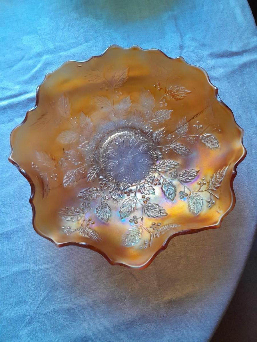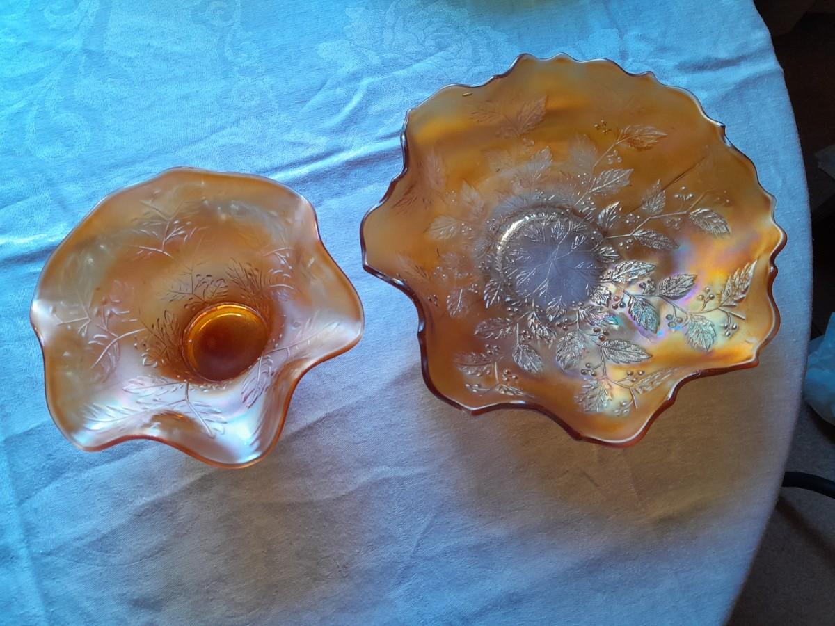 VINTAGE AMBER GLASSWARE WITH PRESSED DESIGNS.