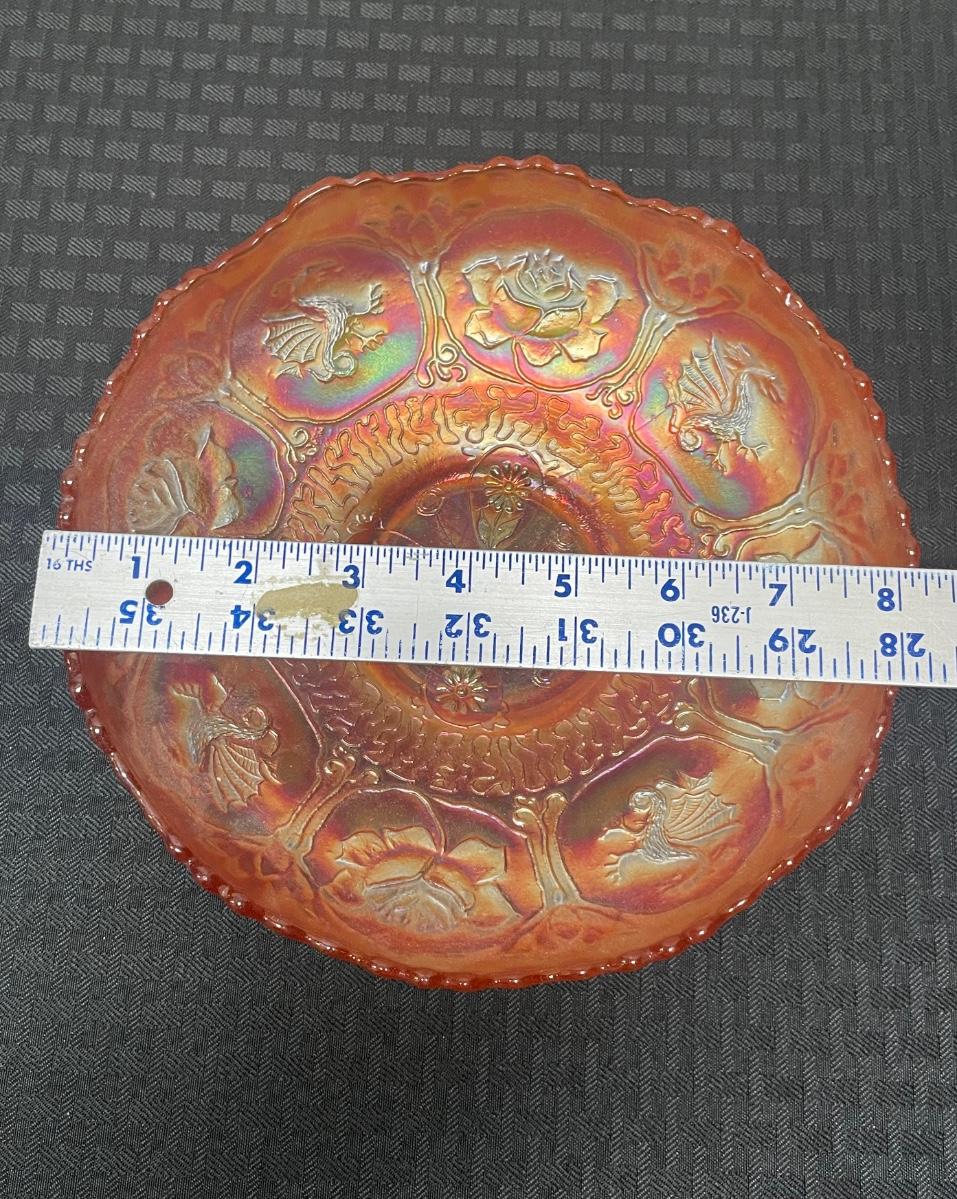 All items are in great condition. Each orange plate has a rainbow tint when directed into any type of light. Measurements of some of the bowls can be found in the pictures.