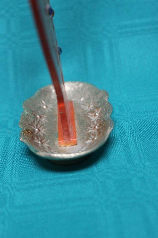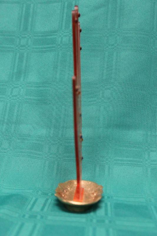 Vintage one of a kind ring holder. Orange clear plastic with etched rhinestone center flower design. The base is a gold tone tray. Very unique.