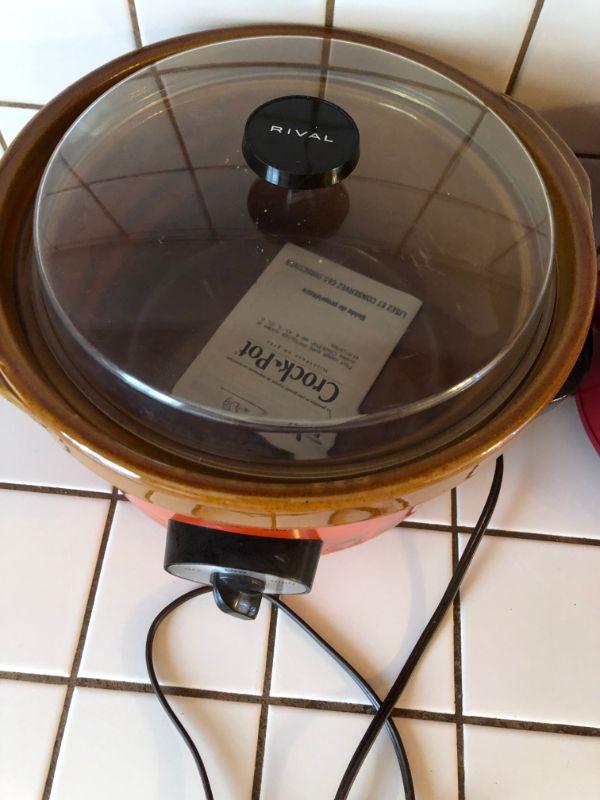 Vintage Orange Crock Pot by Rival. Knob dial, 3 settings off/low/high. Untested but in great condition.