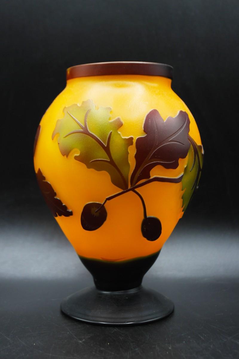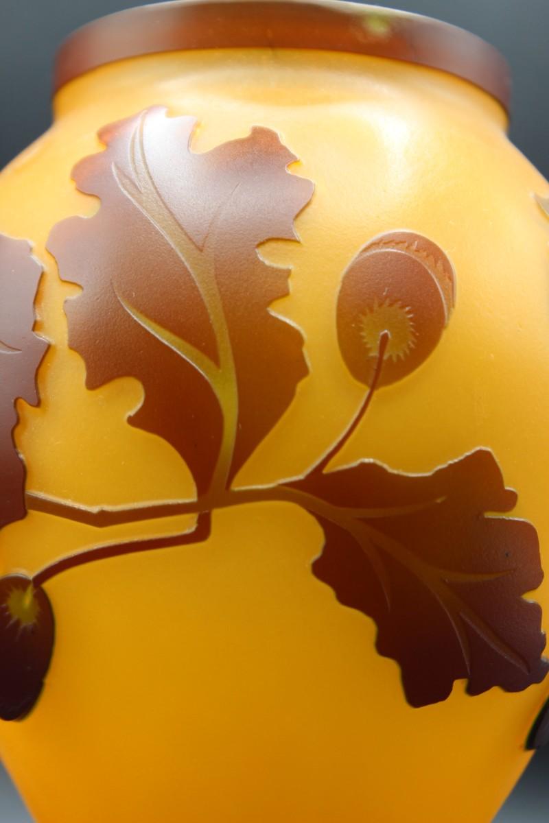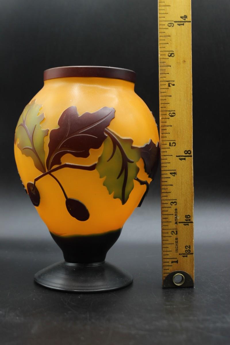 Vintage Orange Satin Glass Art Deco all Autumn Leaves and Acorns Cameo Vase, there are no significant cracks or chips to the piece and is in good vintage condition. Check pictures for more details and for sizing.