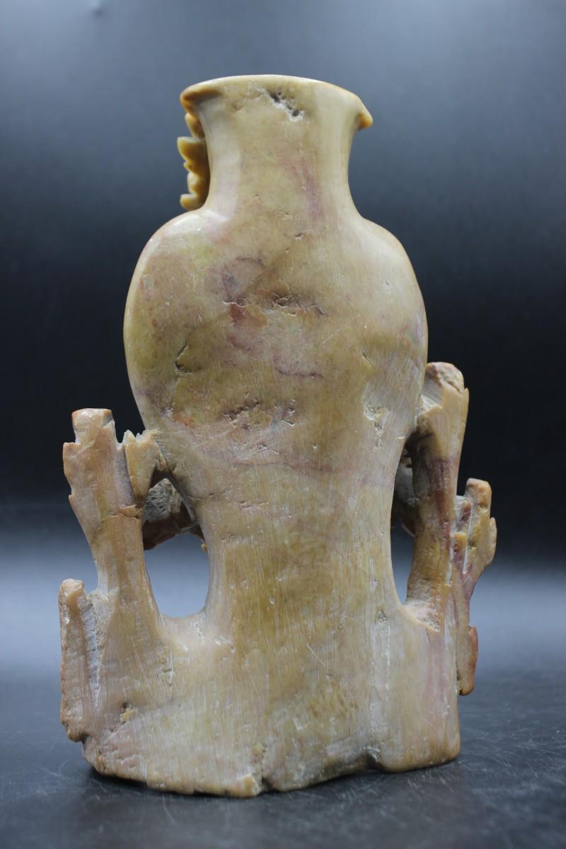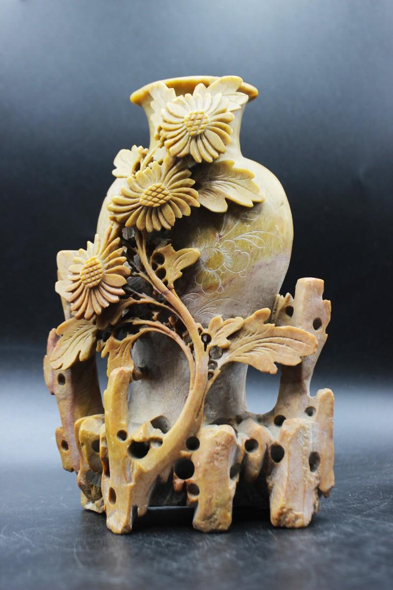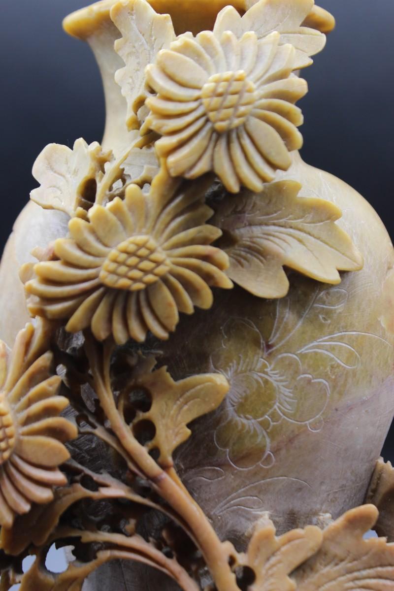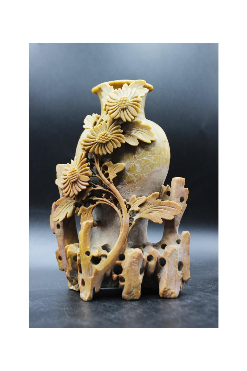 Vintage Oriental Vessel and Flowers Carved Soapstone Decorative Decor