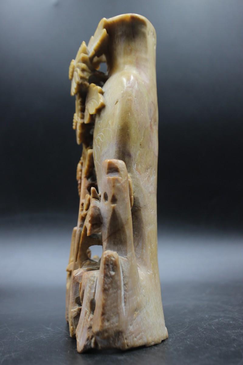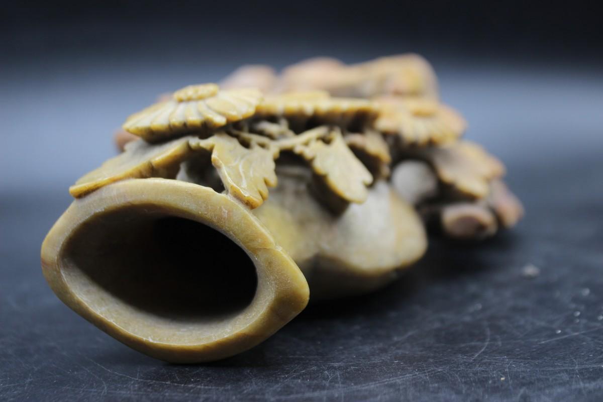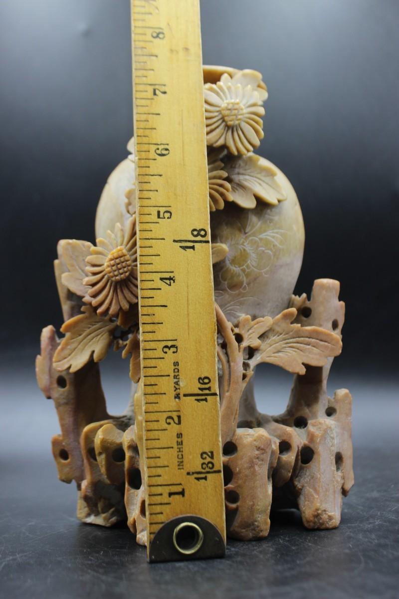 Vintage Oriental Vessel and Flowers Carved Soapstone Decorative Decor, there are no cracks or chips to the decorative piece and is in good vintage condition. Check pictures for more details and for sizing.
