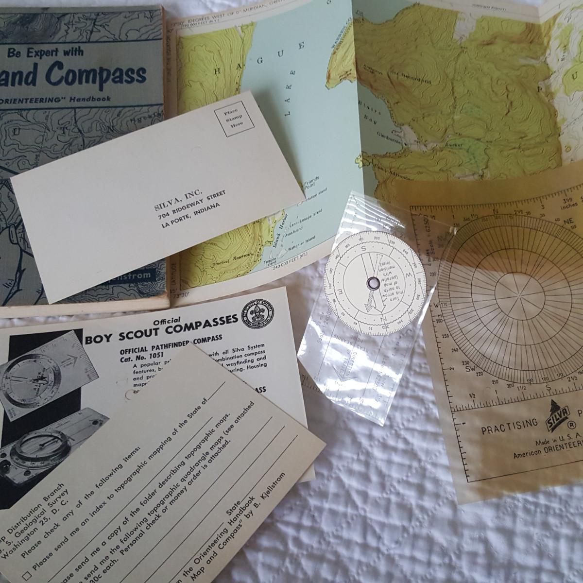 This auction lot is for a vintage copy of Be Expert with Map and Compass, The Orienteering Handbook by Bjorn Kjellstrom. This linen-textured, soft-cover book is a real find, especially for the outdoors person. 1955, 6th Edition. 136 pages. The real beauty is that this book comes complete with the teaching/practicing map, compass and protractor in the attached envelope. Quite unique!