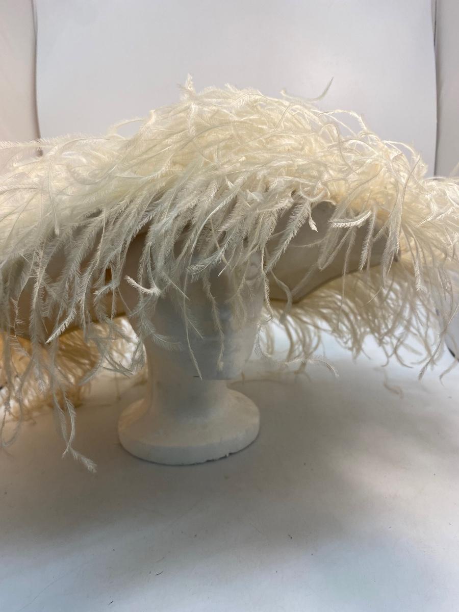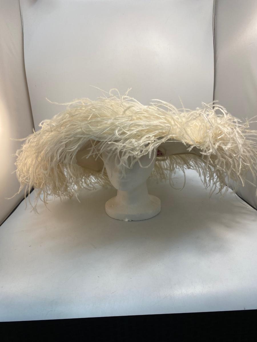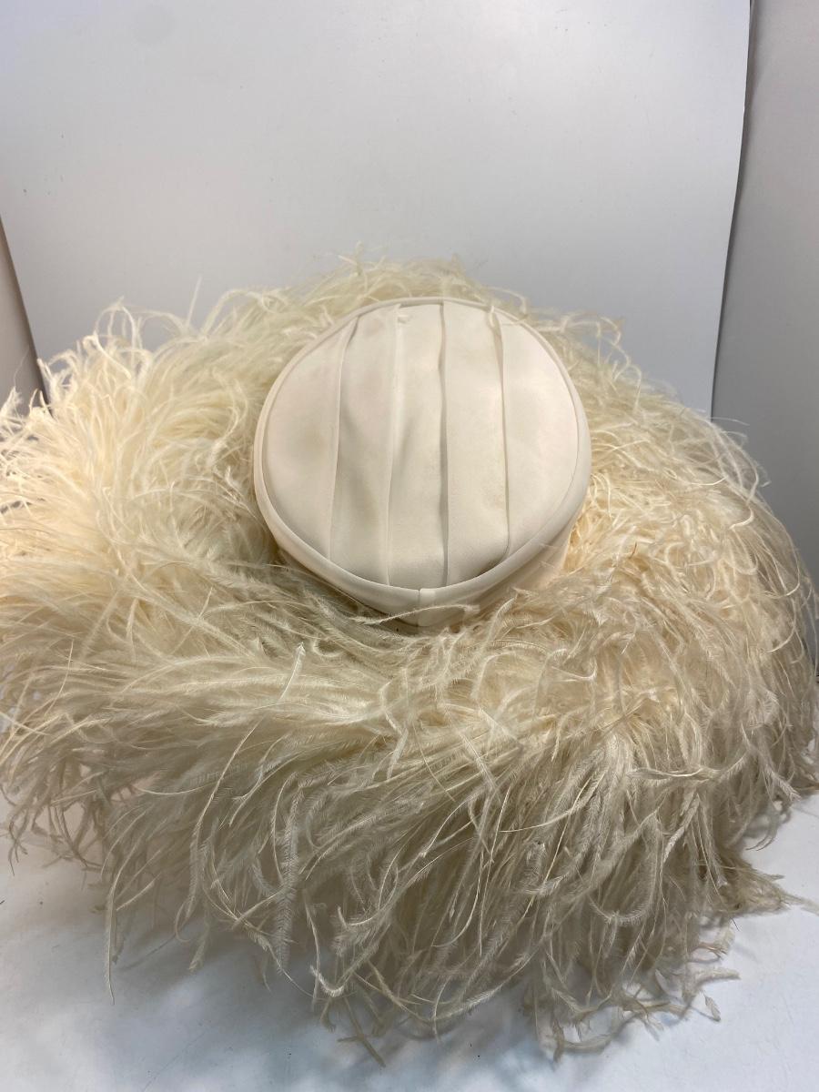 Vintage Original Cathay of California Ostrich Feather Wide Brim Sun Hat. Cream colored feathered hat in good vintage condition. Feathers are a little delicate from age.