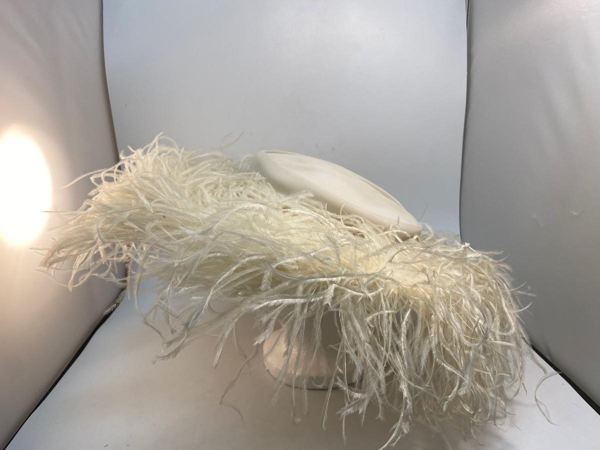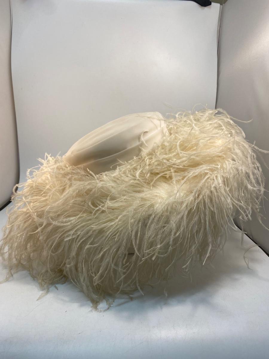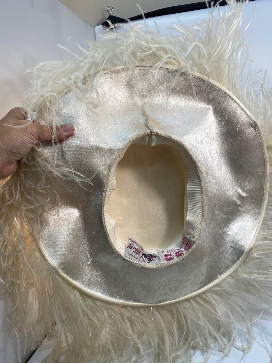 Vintage Original Cathay of California Ostrich Feather Wide Brim Sun Hat. Cream colored feathered hat in good vintage condition. Feathers are a little delicate from age.