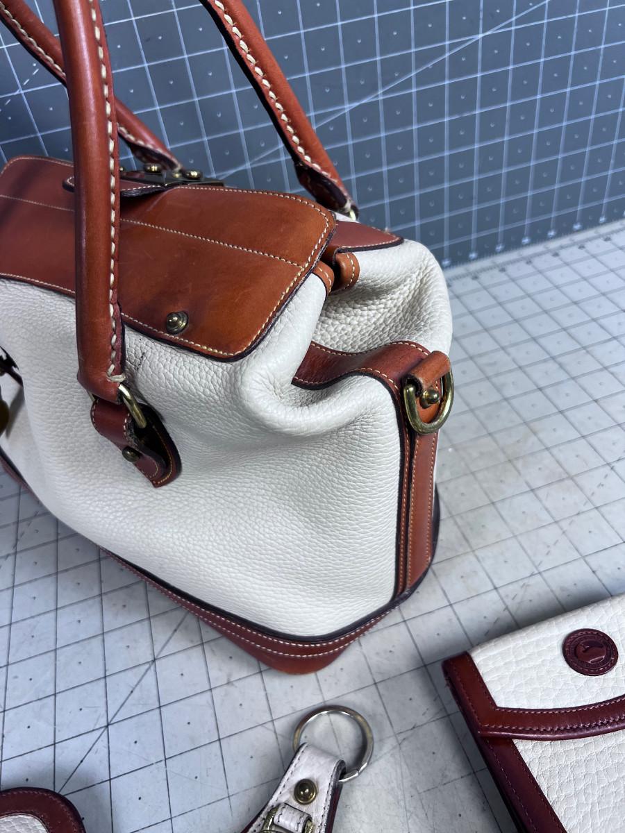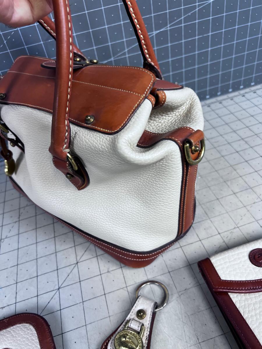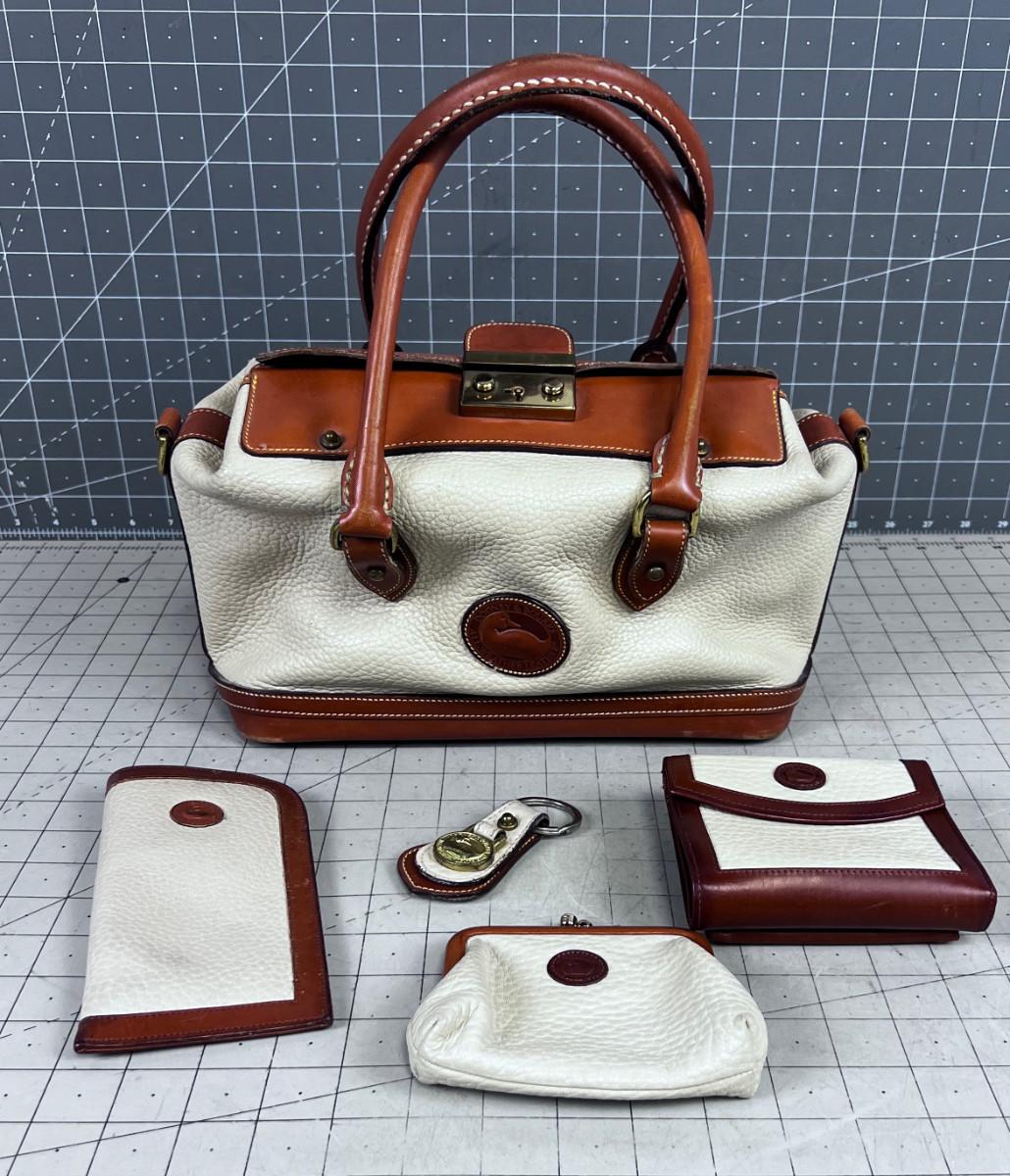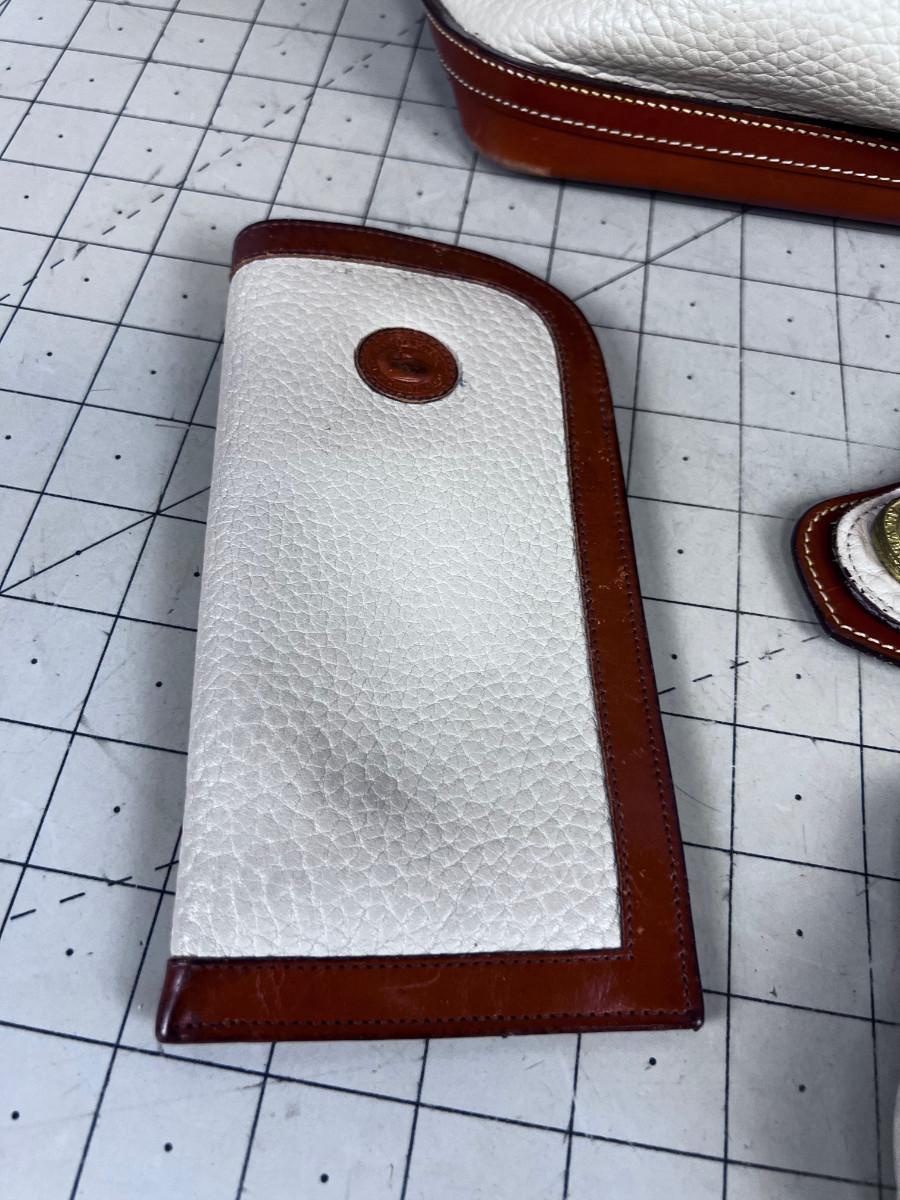 VINTAGE Original Dooney & Bourke, Bone With Tan Edge + Coin Purse, Key Chain, Wallet and Glass Case. WOW!!!