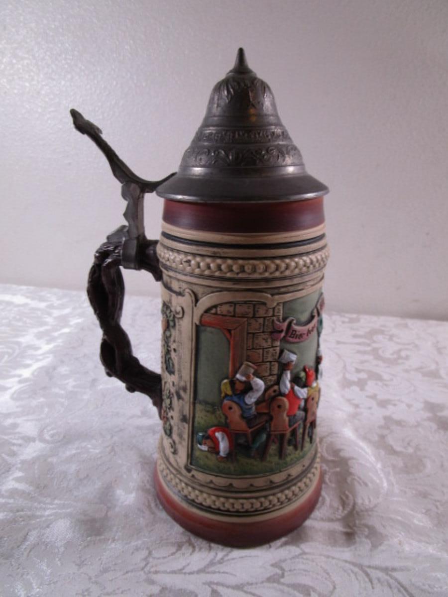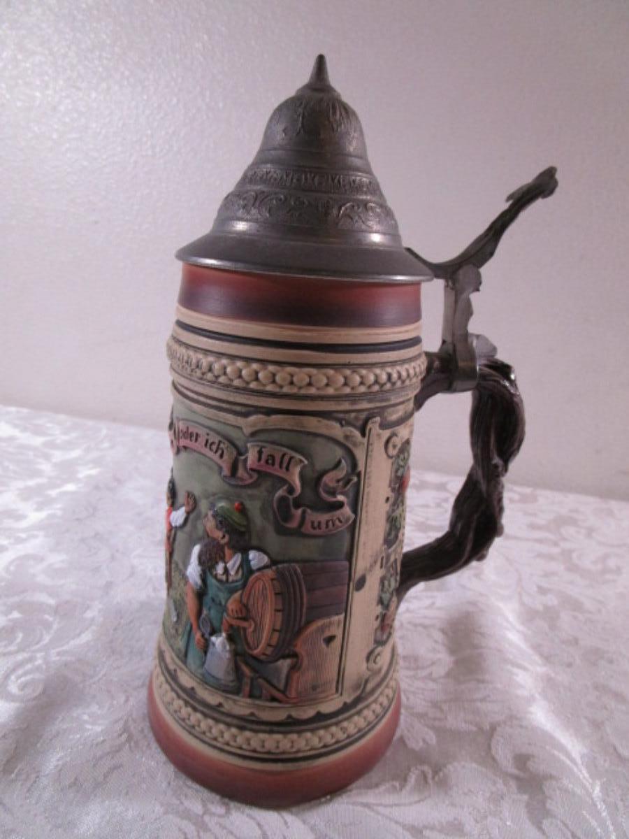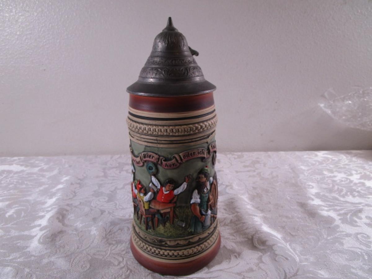 Excellent condition. Inscription says "Bring Me a Beer, Bring Me a Beer or I'll Fall Over" in German, 9-5/8" tall x 4" across
