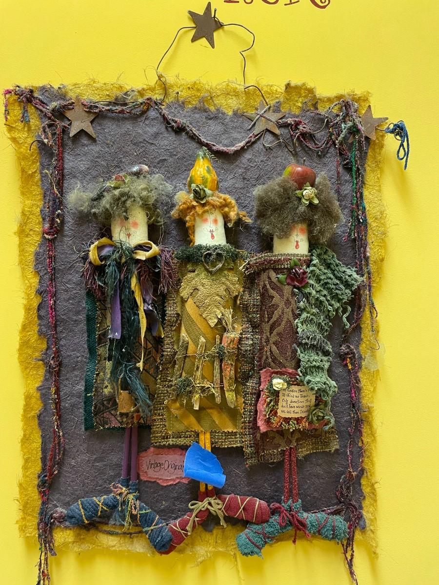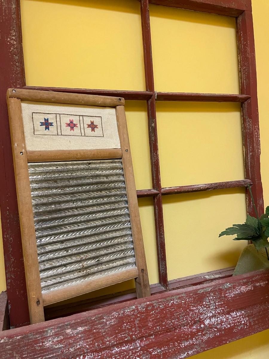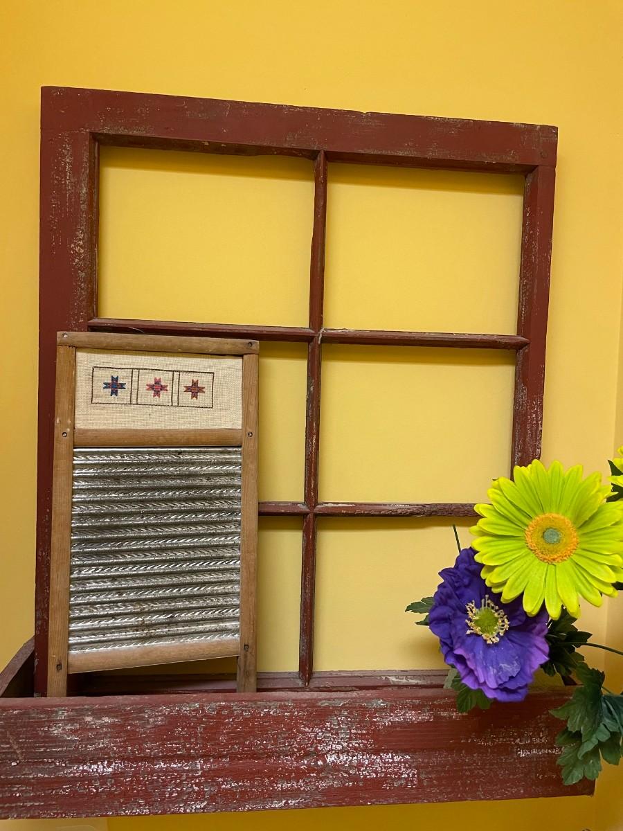 Vintage Originals Artwork with 3 Ladies and Window box decor including washboard and flowers