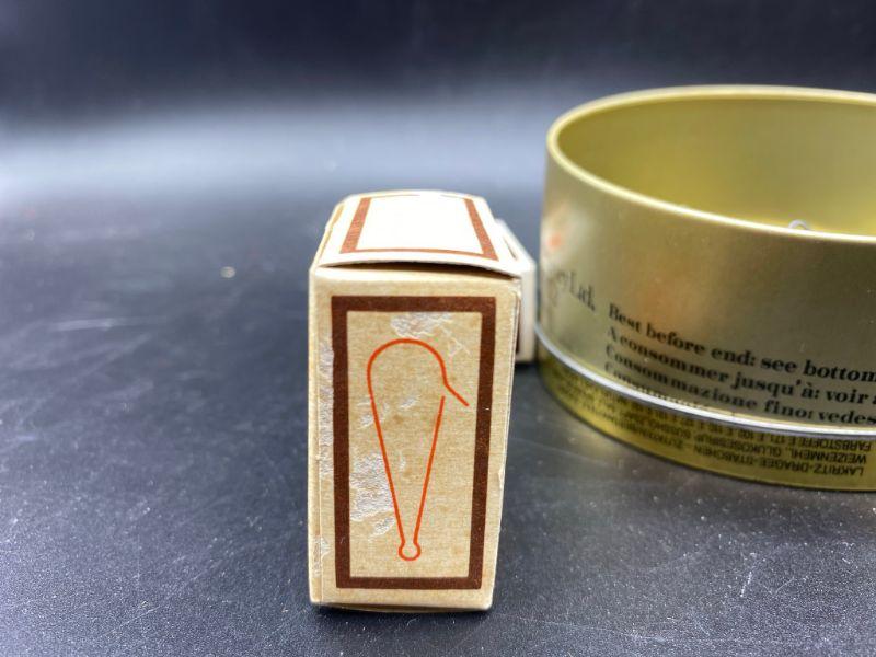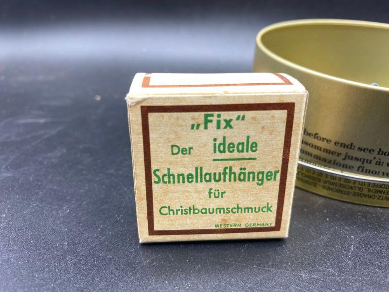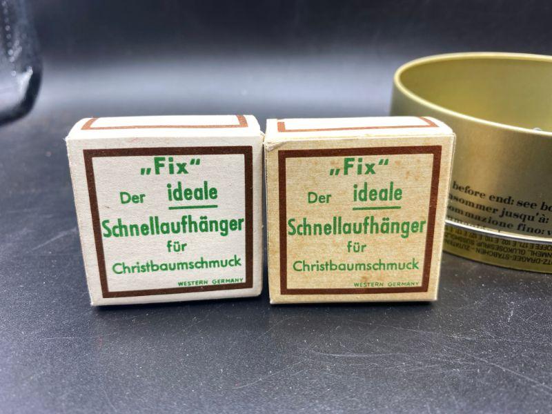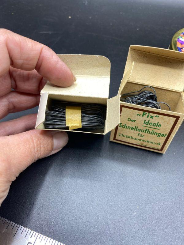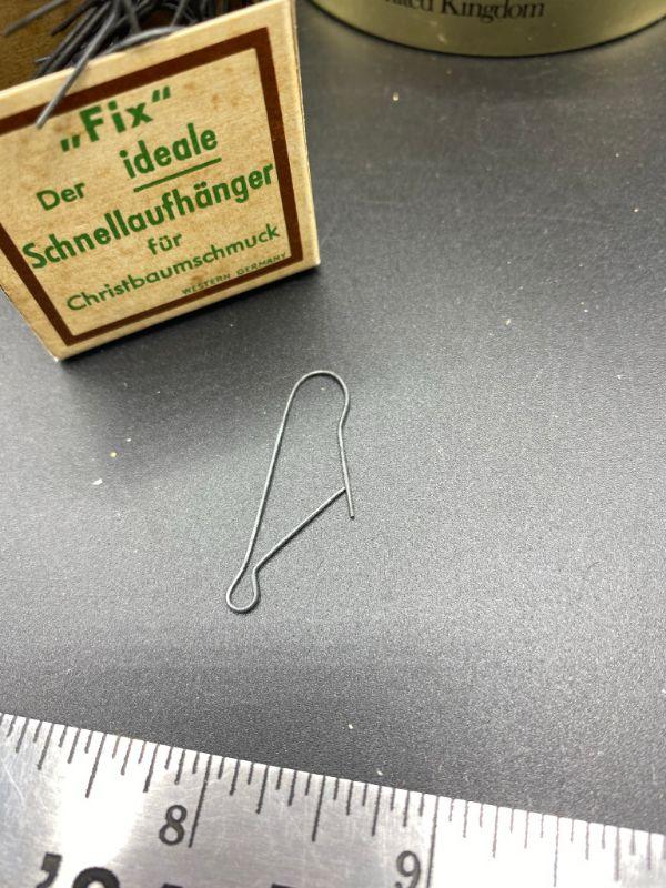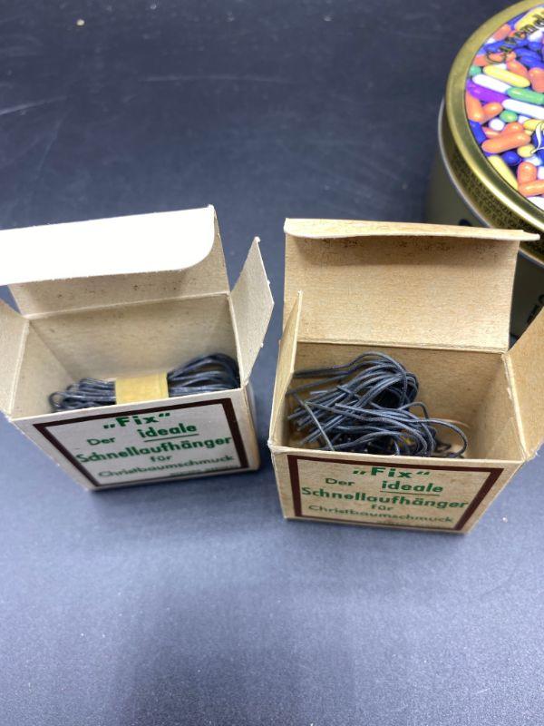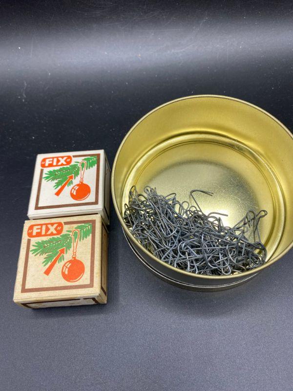 Vintage metal ornament hooks. Two boxes of hooks from Germany, one is unused. Tin has metal hooks as well. Two different styles.