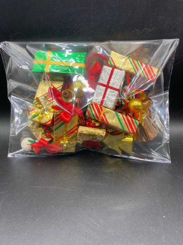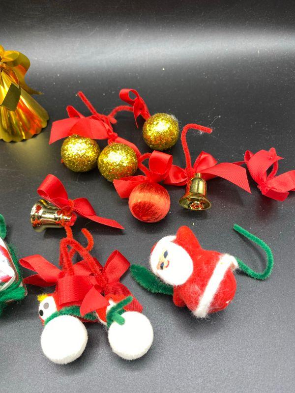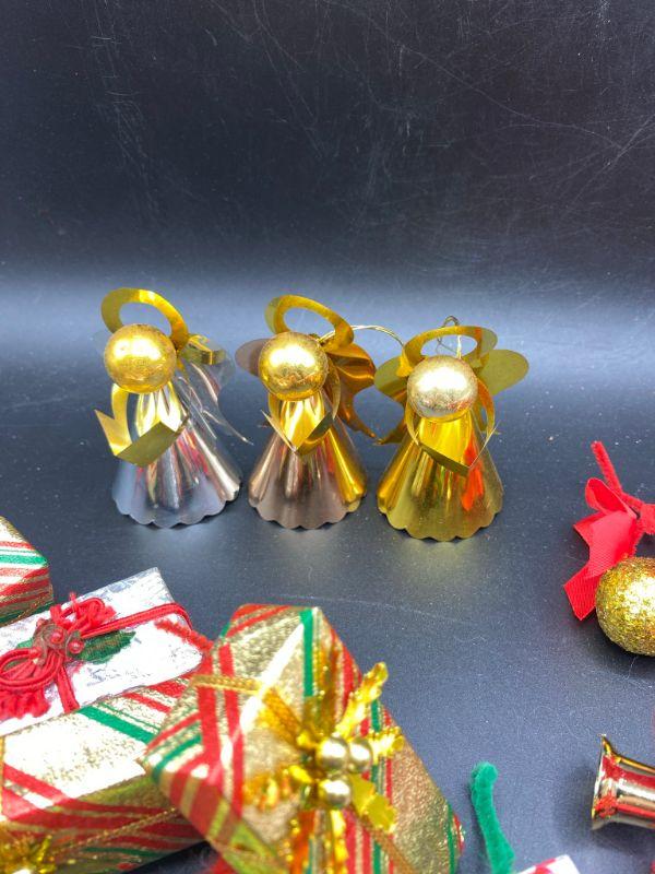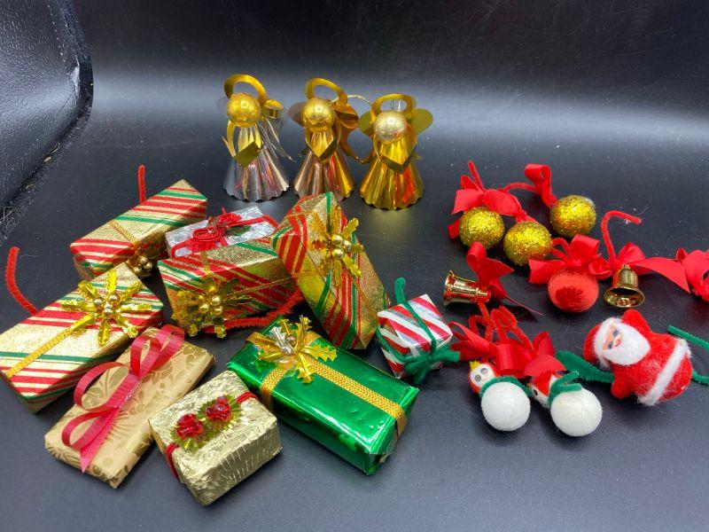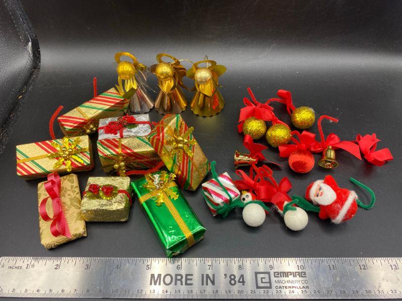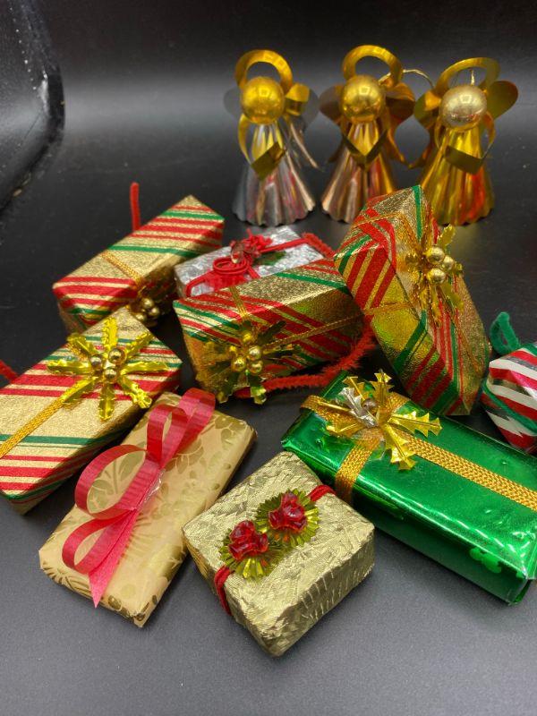 Vintage miniature ornaments. Foil packages, foil angels, and felted figures.