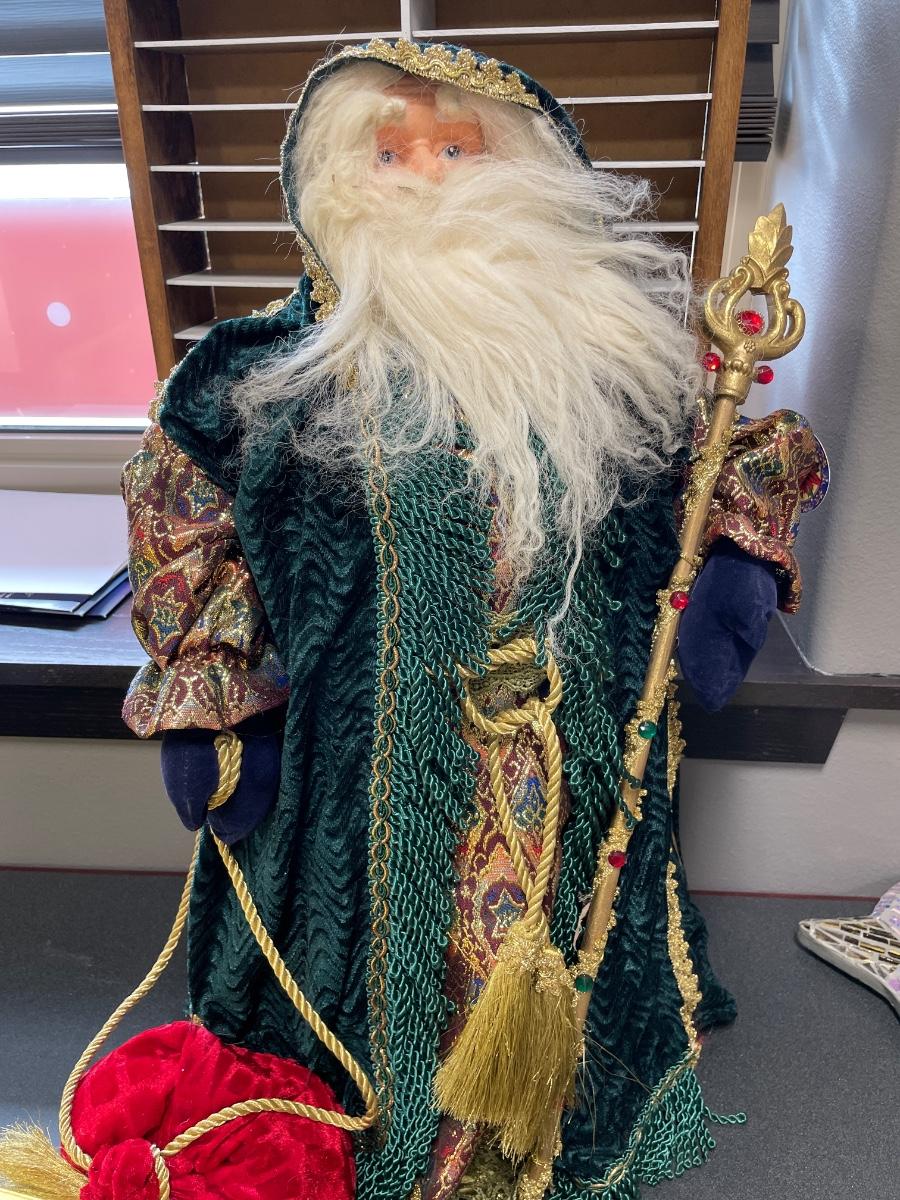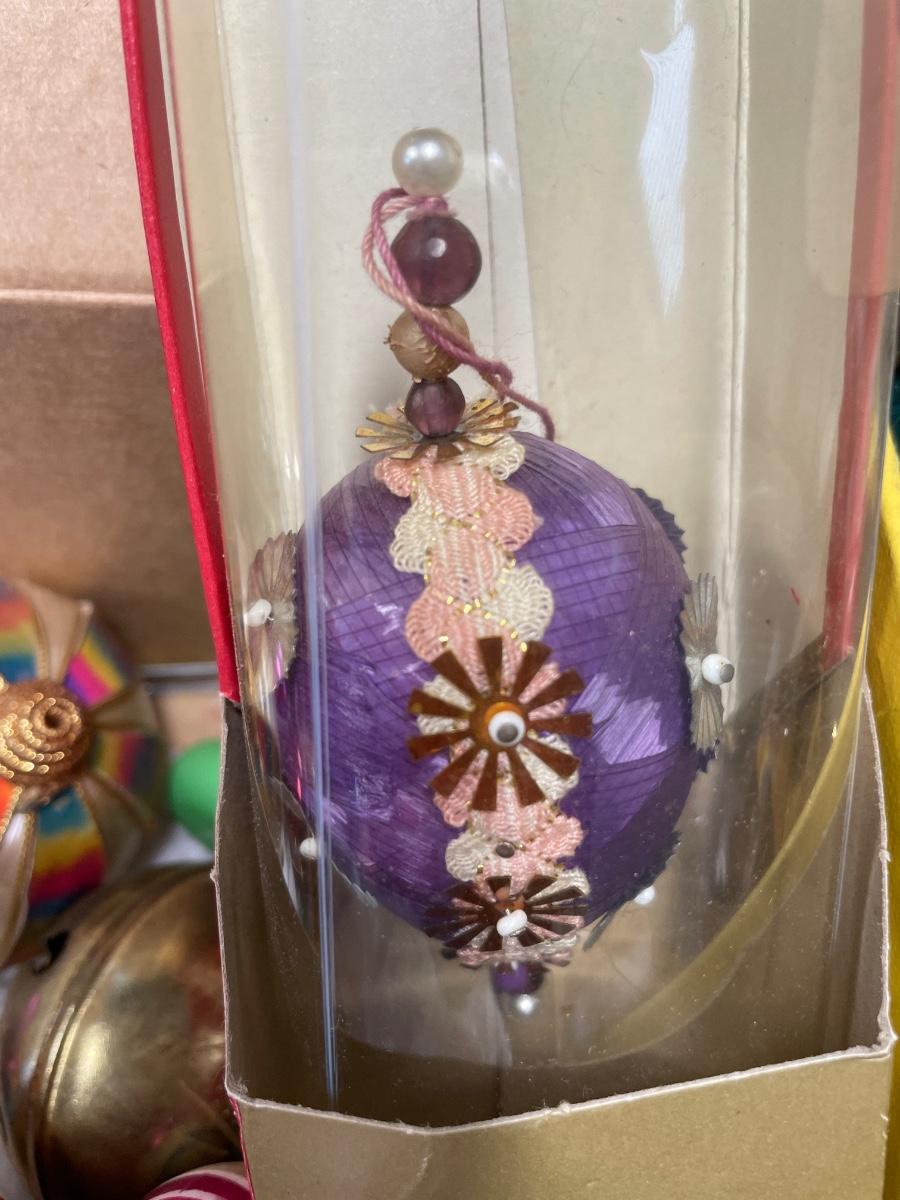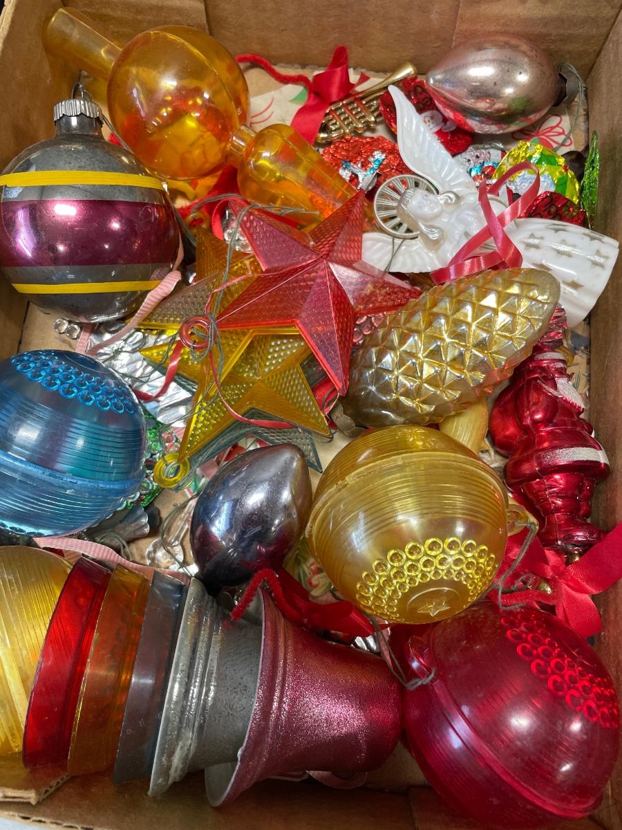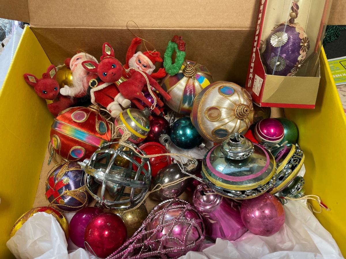 Vintage 2’ Santa & box of vintage ornaments