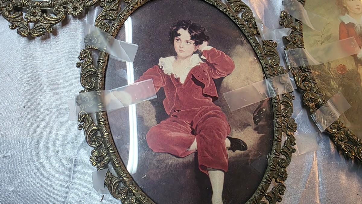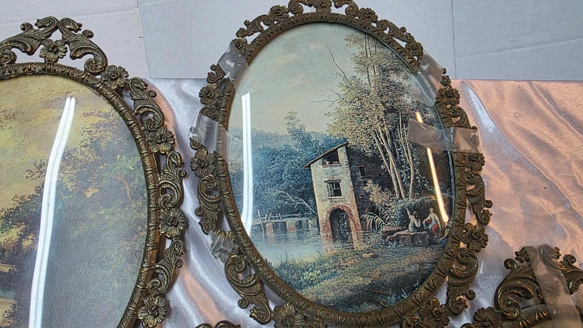 Bring old-world elegance to your wall with this matching set of four vintage oval wall frames, finished in a rich antique brass / brass-tone with ornate floral scrollwork. Each frame features a classic Italian-style print (portraits and landscapes), creating an instant gallery-wall look with warm, timeless character.