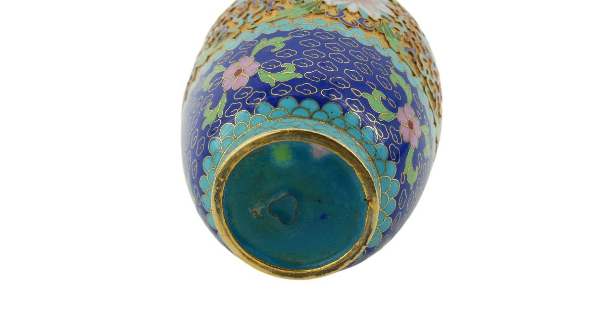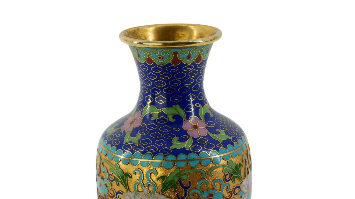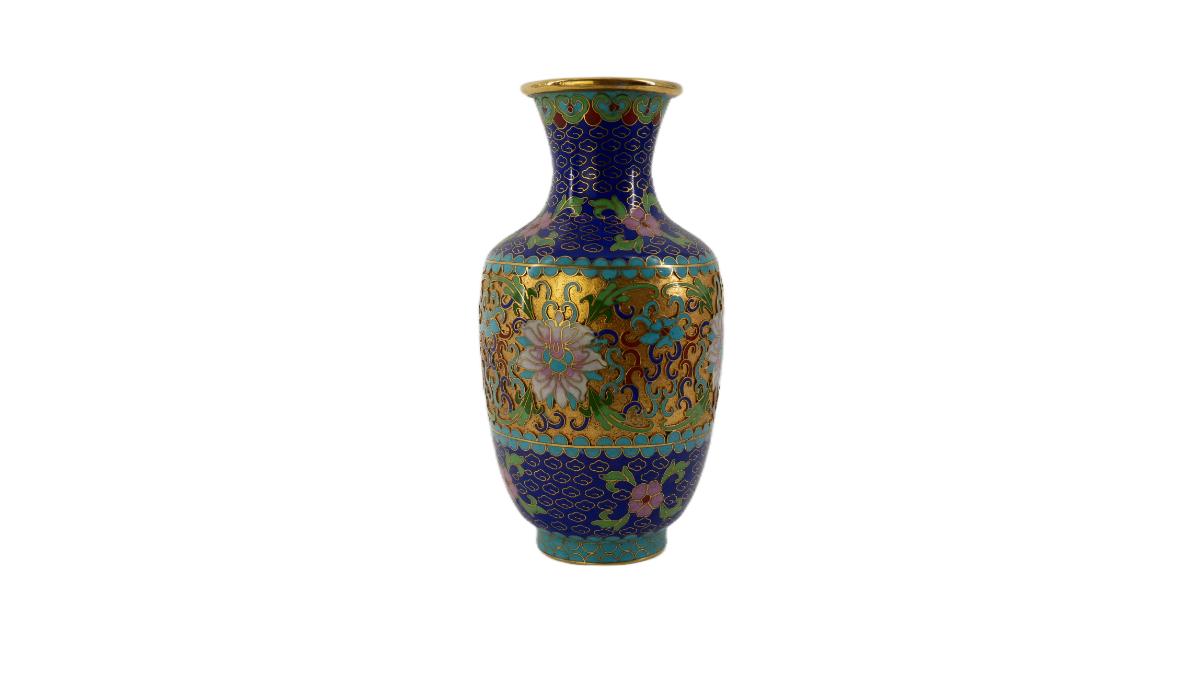 Vintage ornate Asian blue and gold cloisonné flower designed vase. No visible issues found. Measures 8" tall and 4" wide. Weighs 15 oz. (C13)