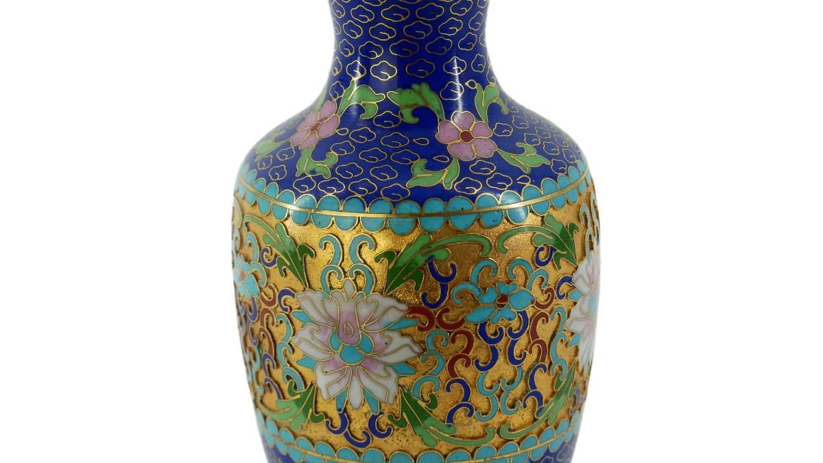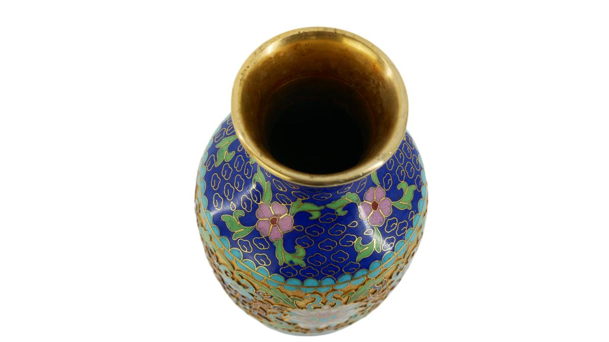 Vintage ornate Asian blue and gold cloisonné flower designed vase. No visible issues found. Measures 8" tall and 4" wide. Weighs 15 oz. (C13)