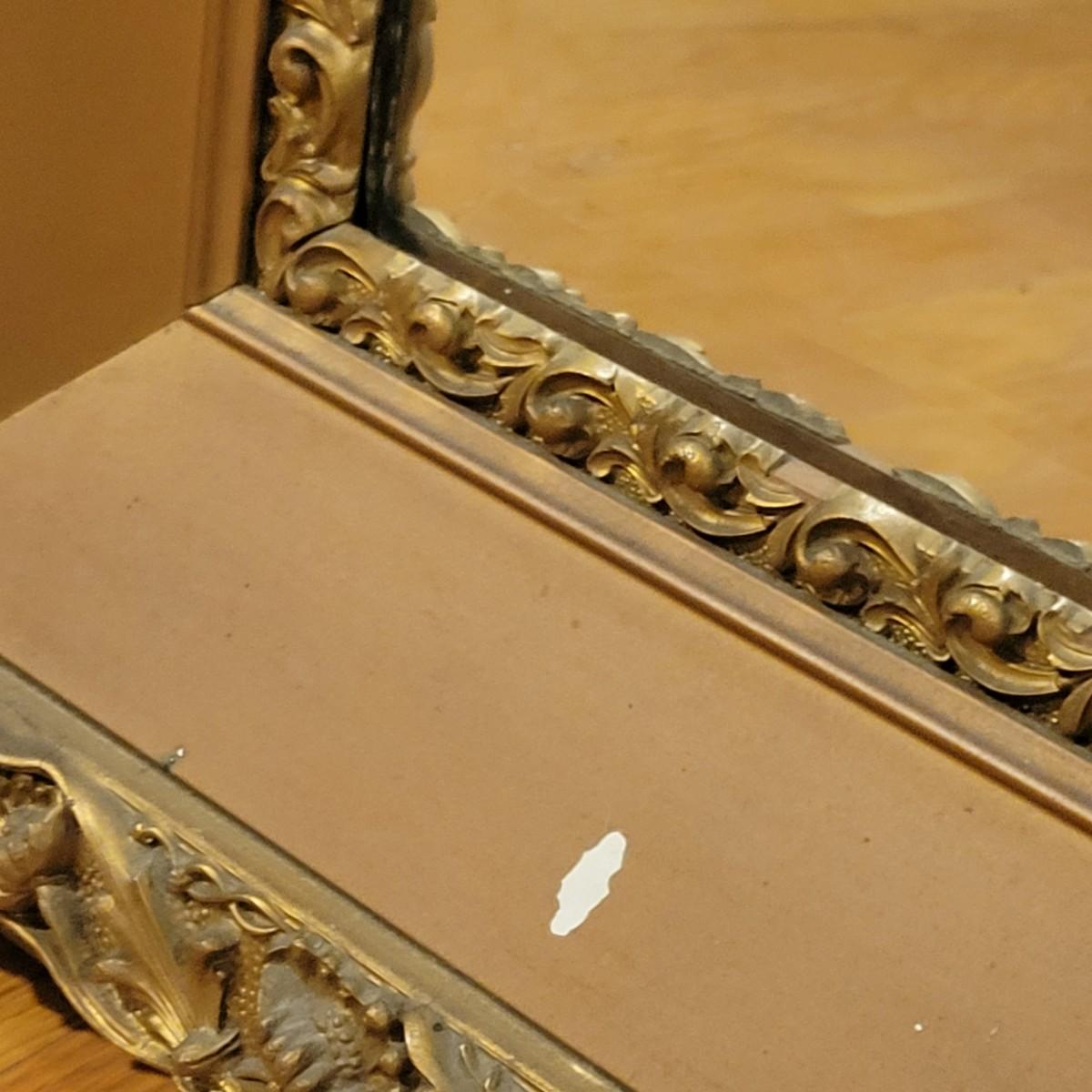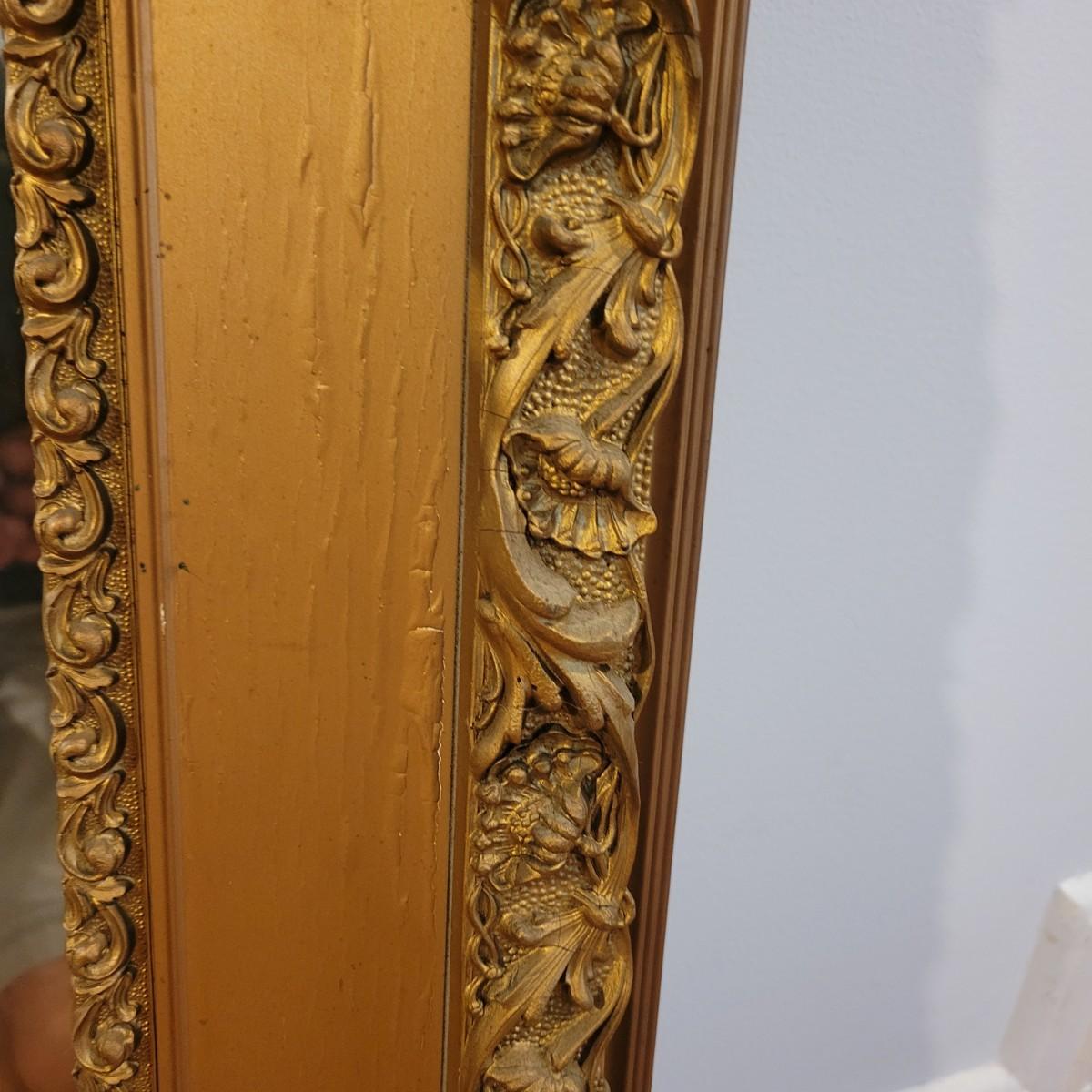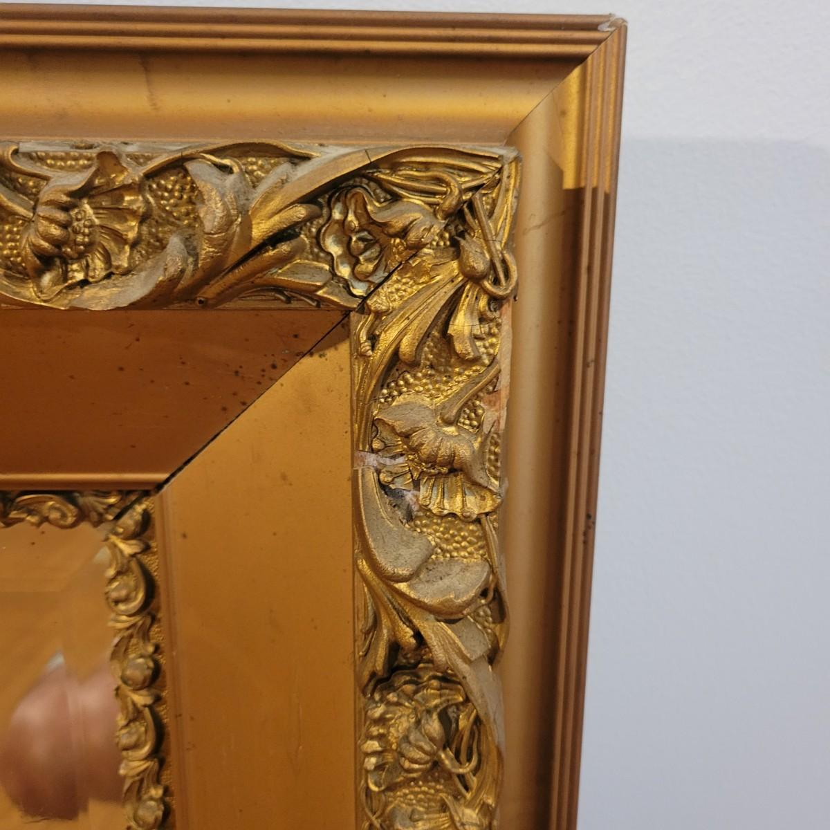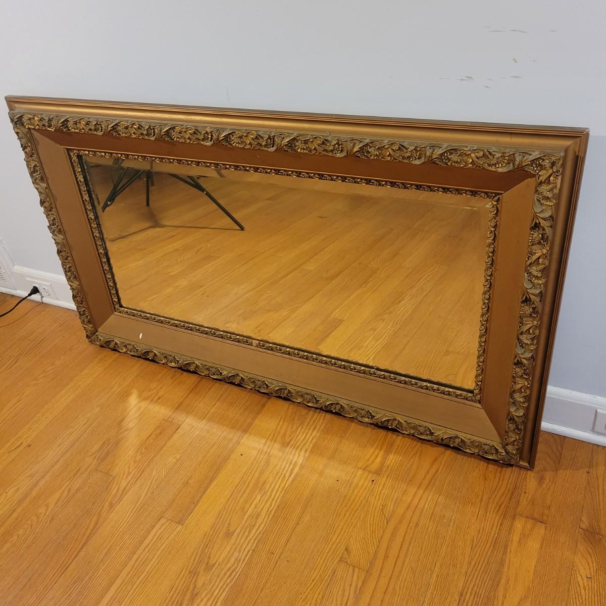 Vintage, ornate gold beveled mirror in good condition. The wooden frame's gold finish is peeling in a few spots and there is one small spot missing its finish, see attached pictures for more details. The mirror is in very good condition, with a 1" bevel. Frame measures approximately 51" x 29" x 2". Local pickup only