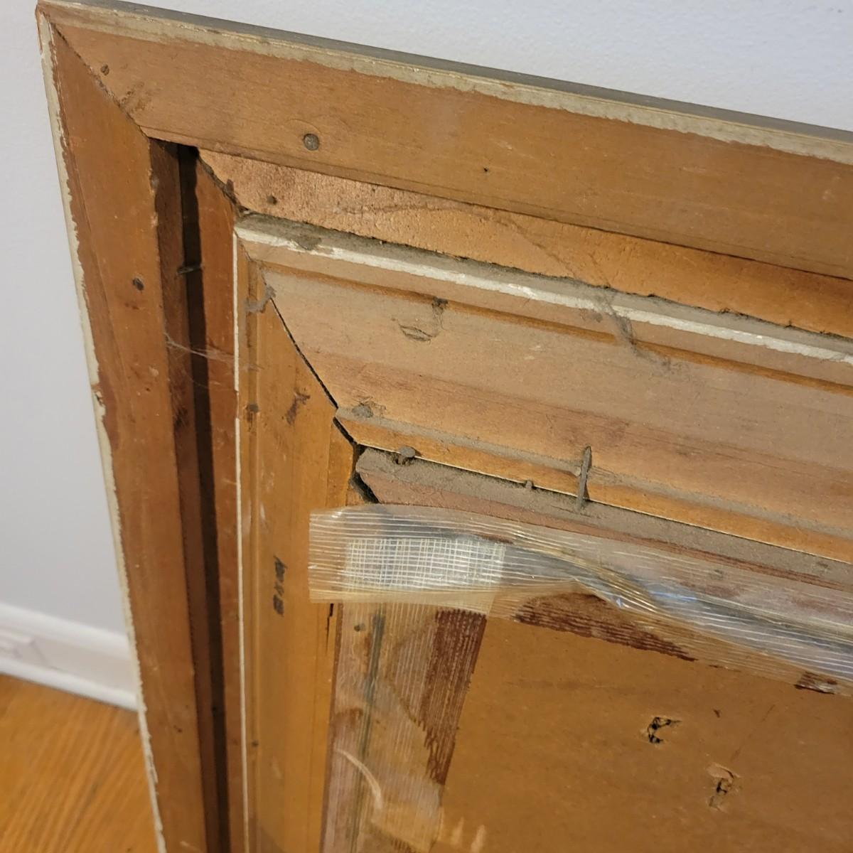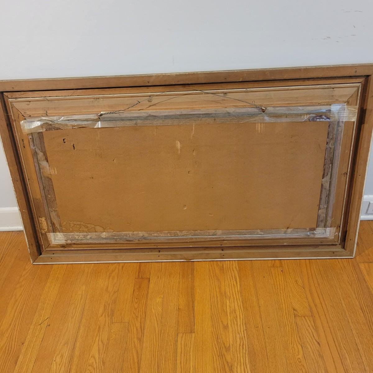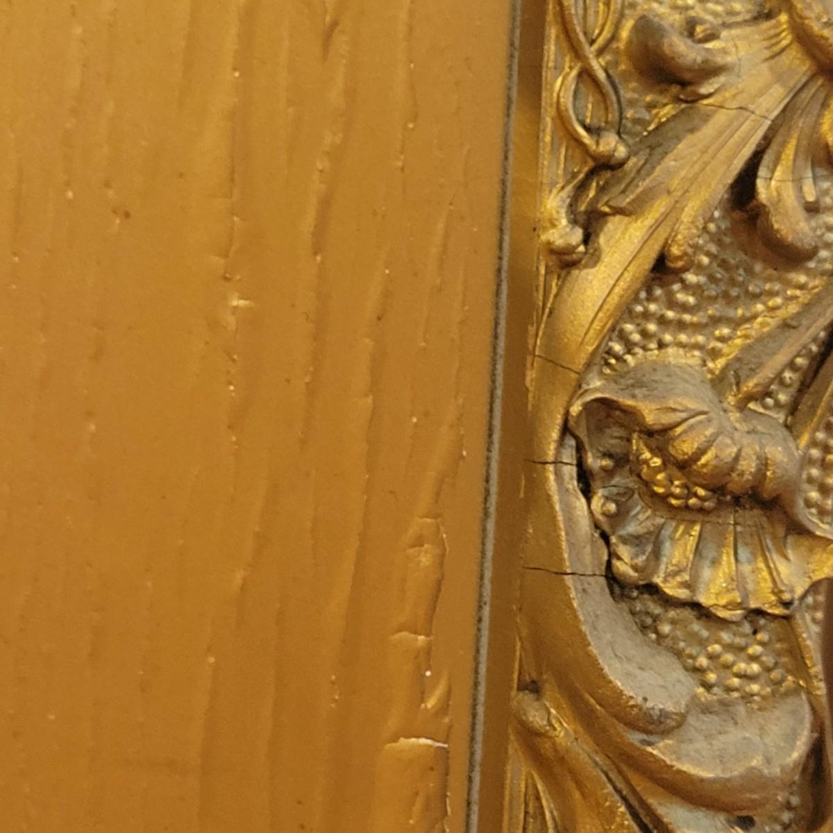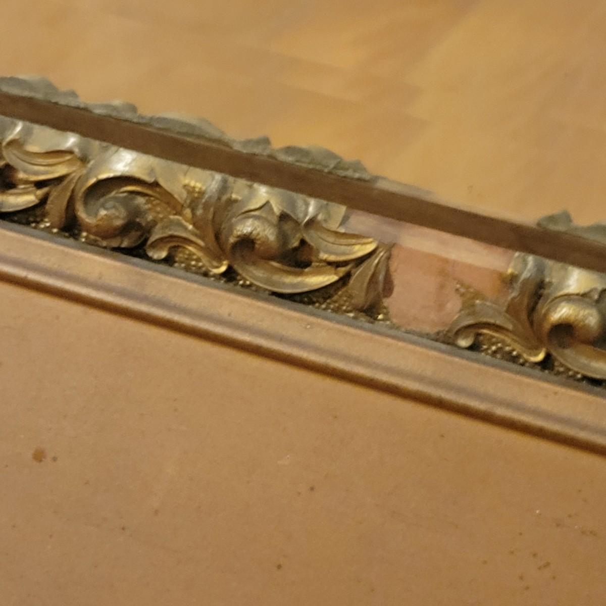 Vintage, ornate gold beveled mirror in good condition. The wooden frame's gold finish is peeling in a few spots and there is one small spot missing its finish, see attached pictures for more details. The mirror is in very good condition, with a 1" bevel. Frame measures approximately 51" x 29" x 2". Local pickup only