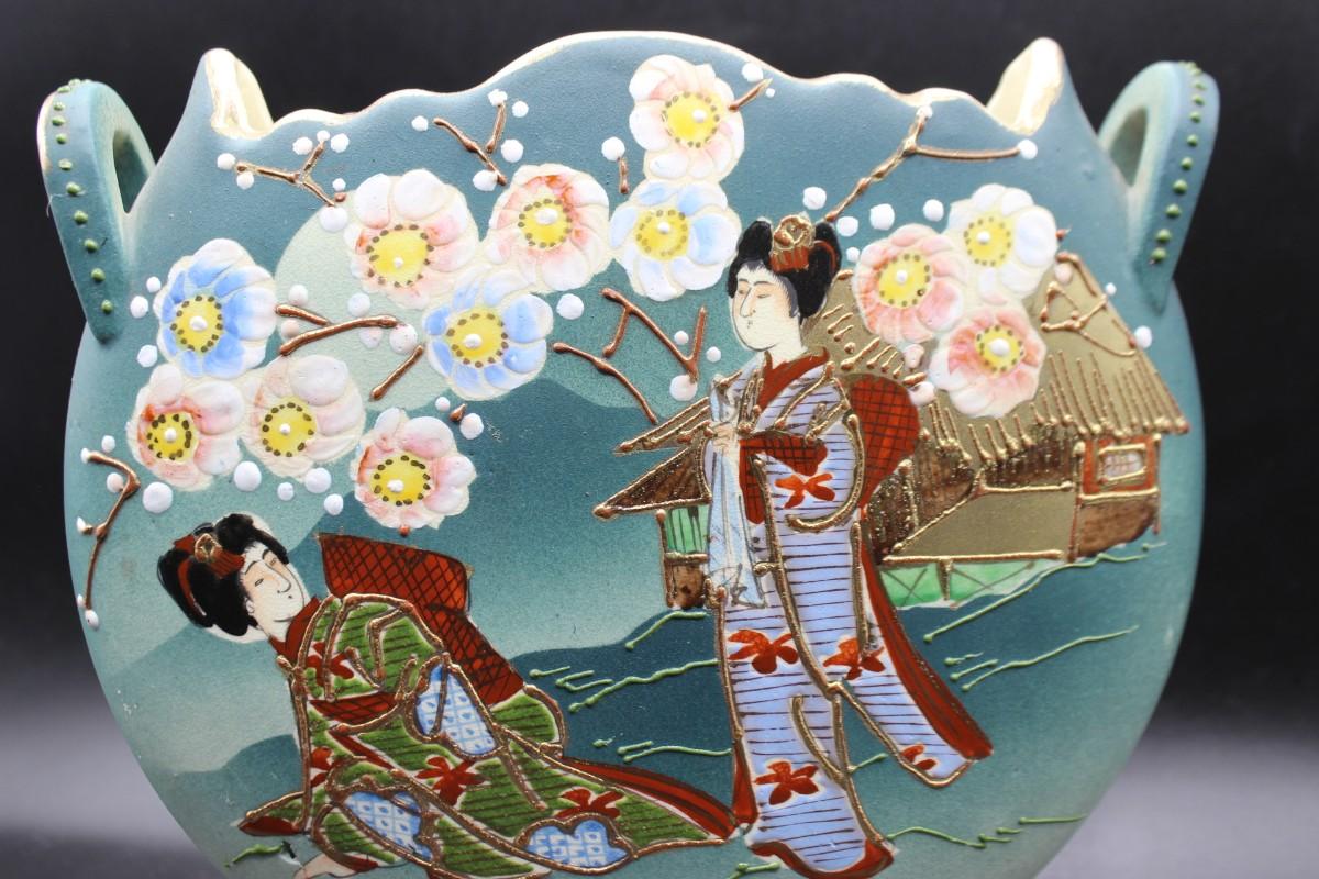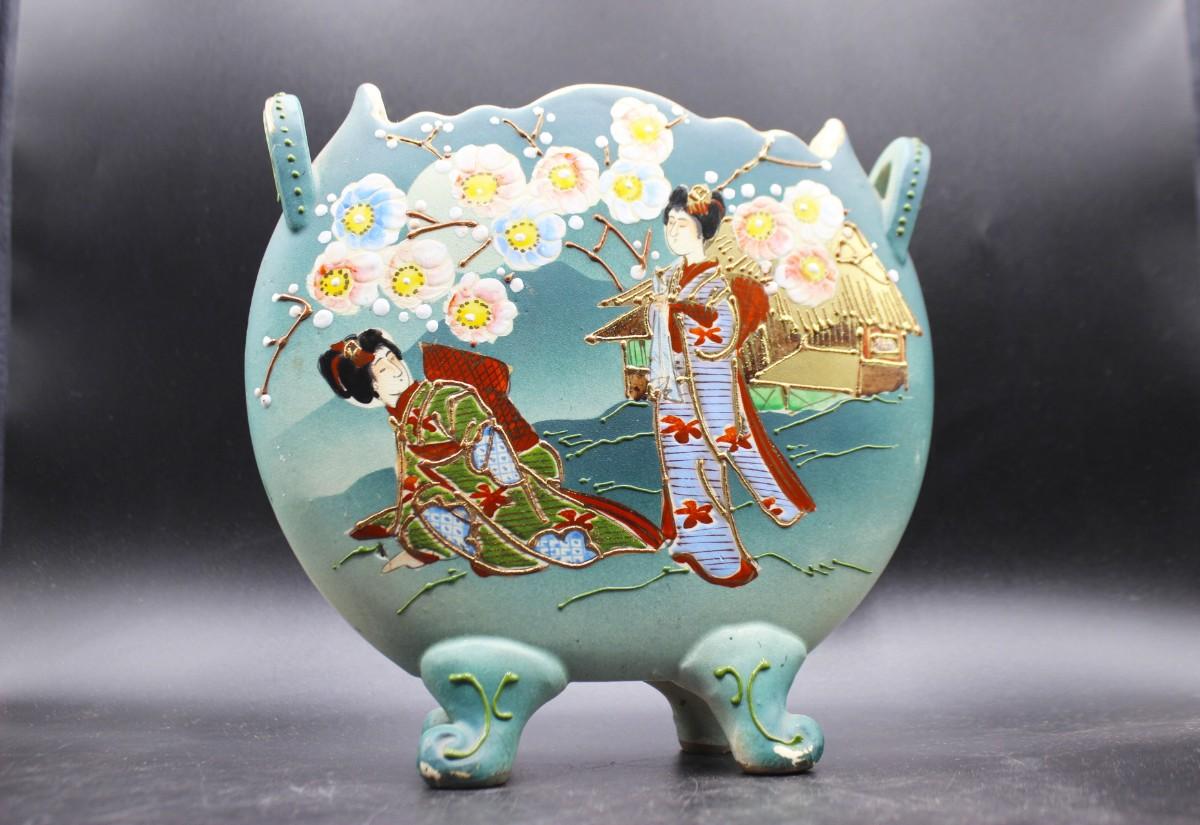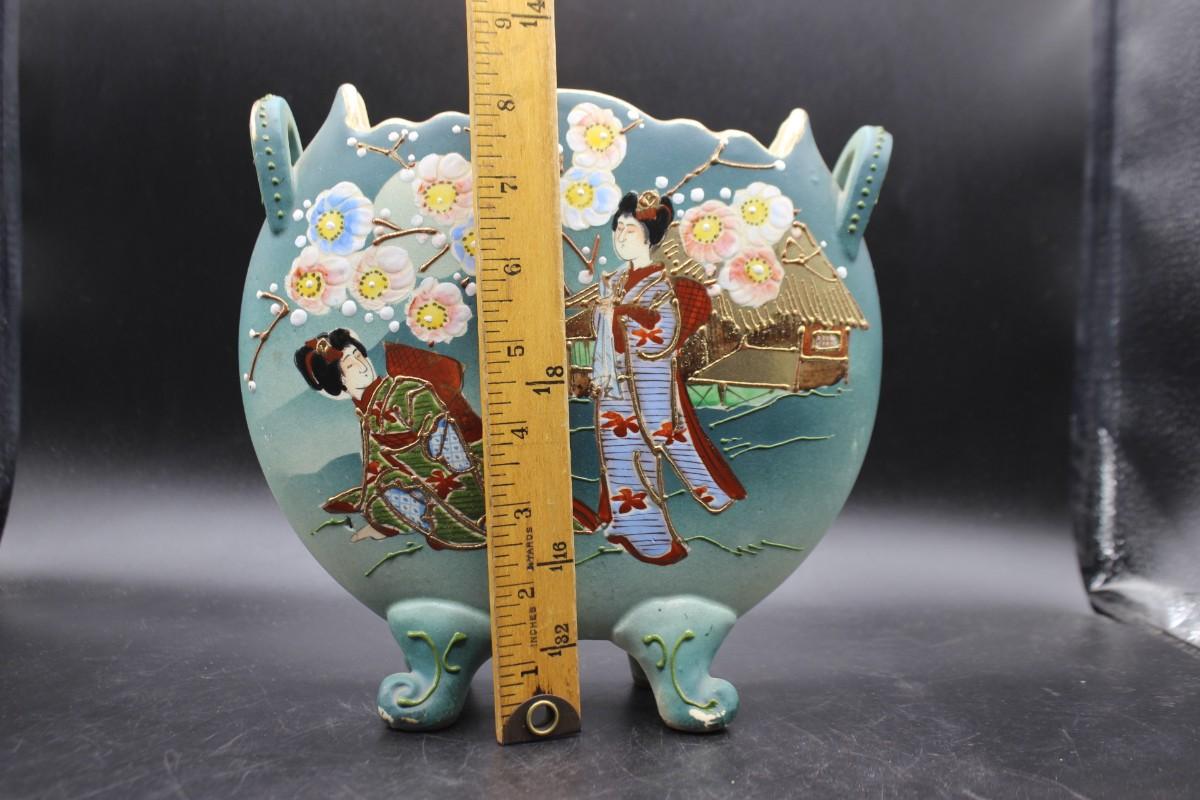 Vintage Ornate Japanese Oriental Hand Painted Thin Decorative Vase, there are no significant cracks or chips to the vase and is in good vintage condition. The colors and texture of the vase is still so vibrant and clear, check pictures for more details and for sizing.