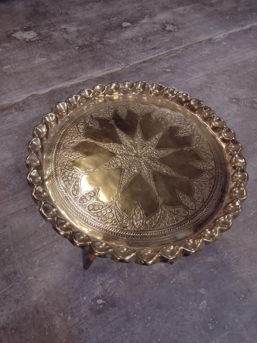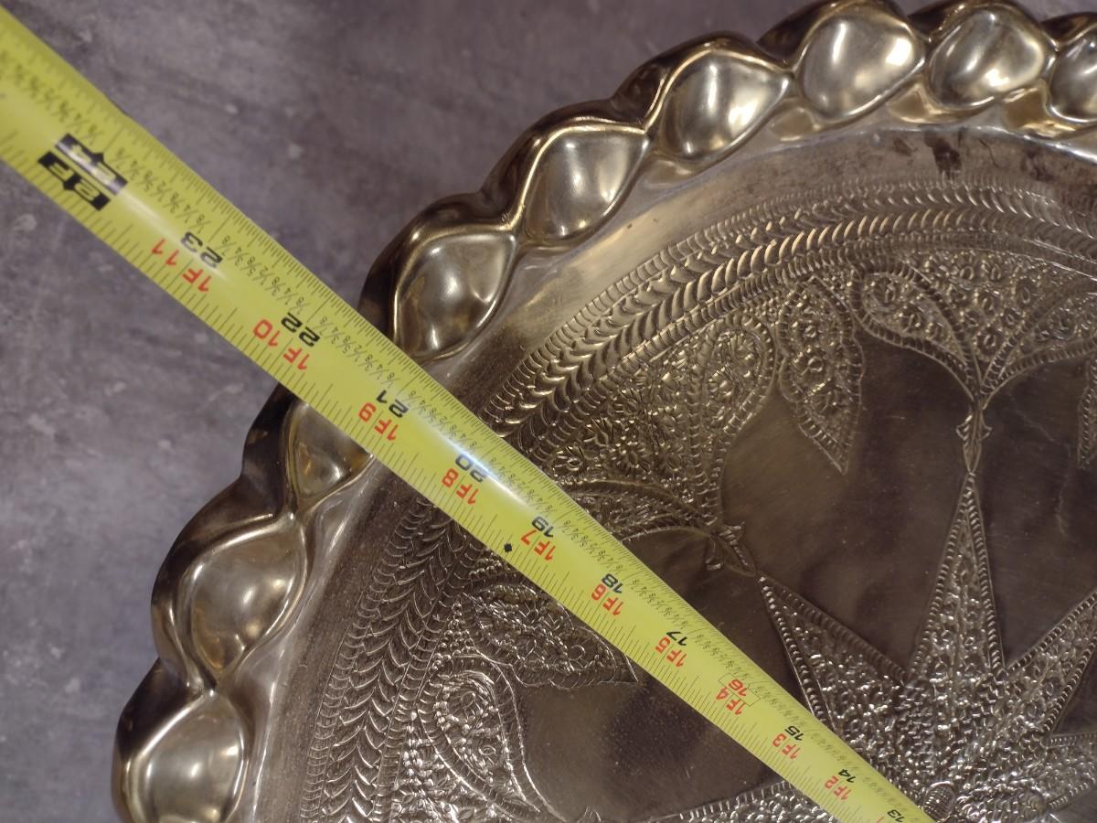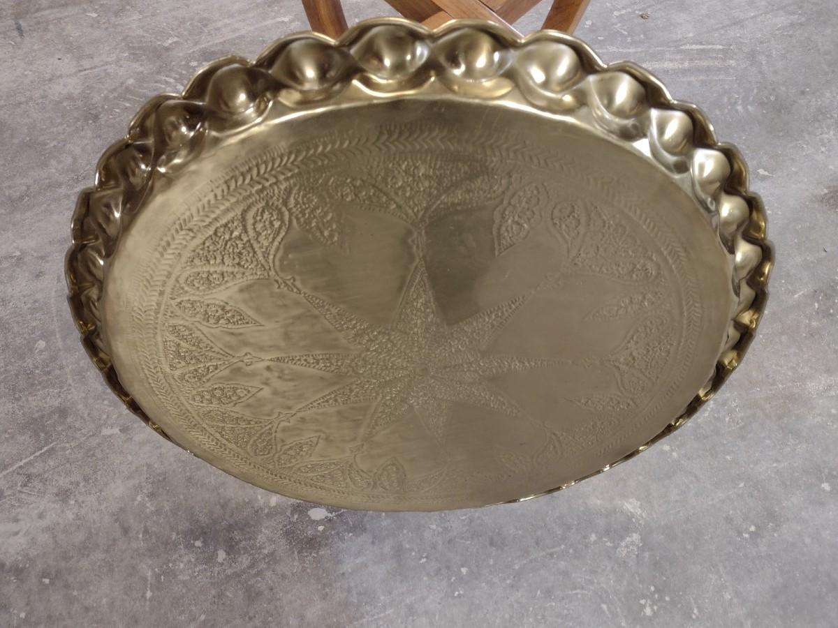 Vintage Ornate Scalloped Edge Brass Butler Tray with Wood Stand 22"